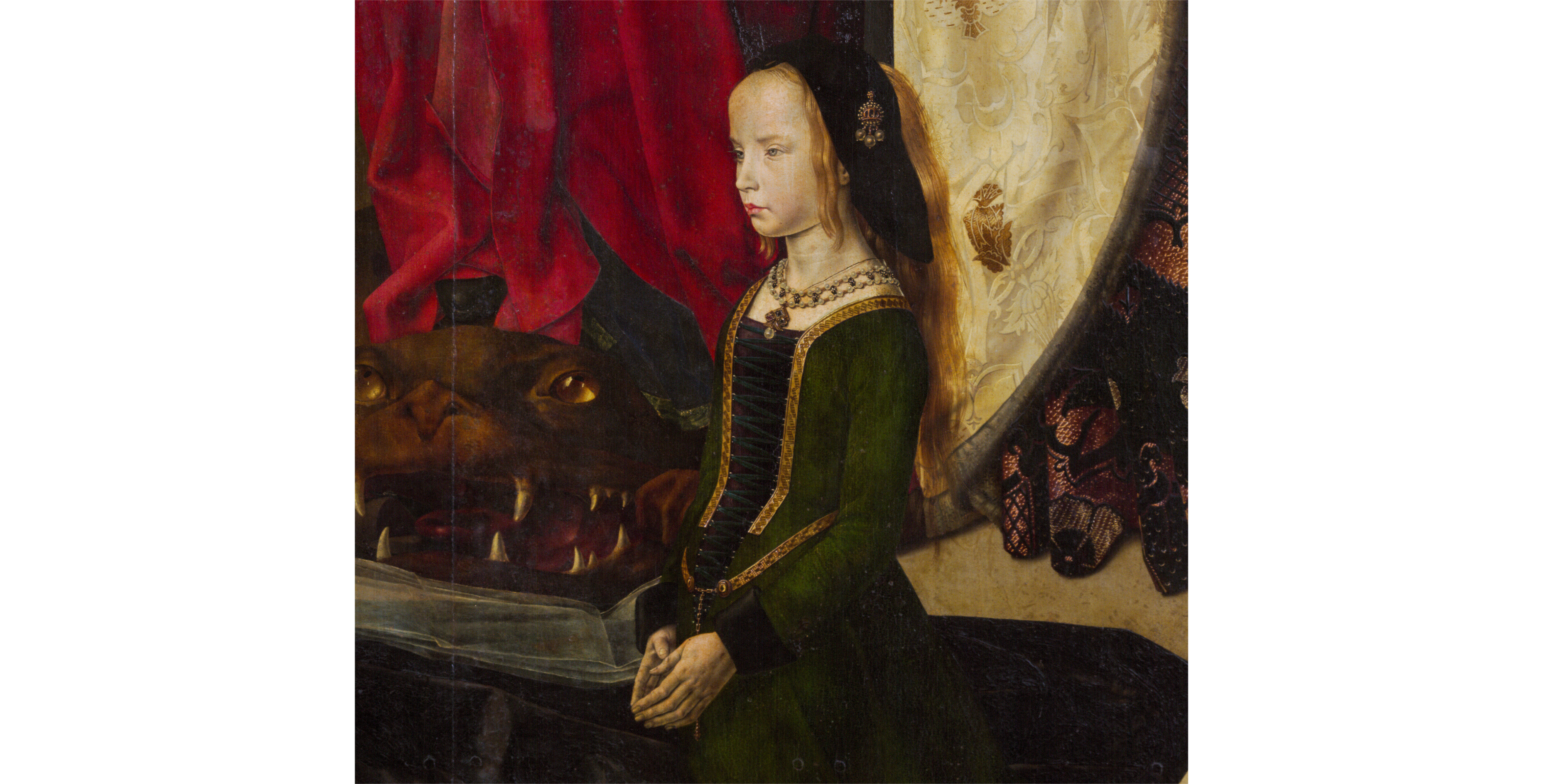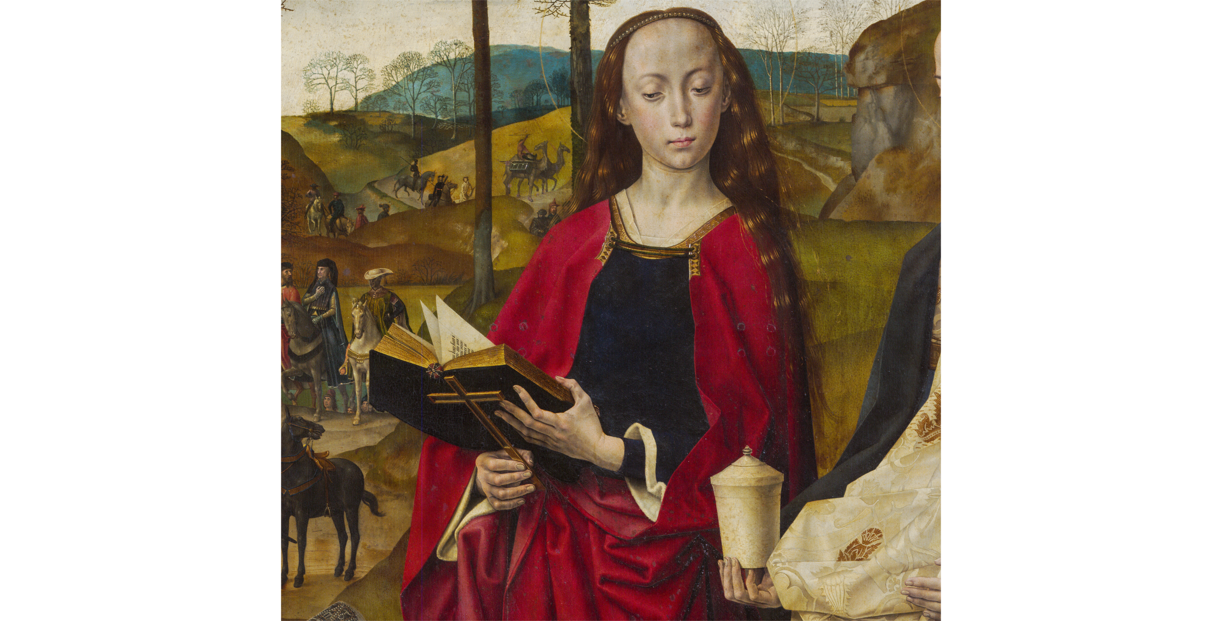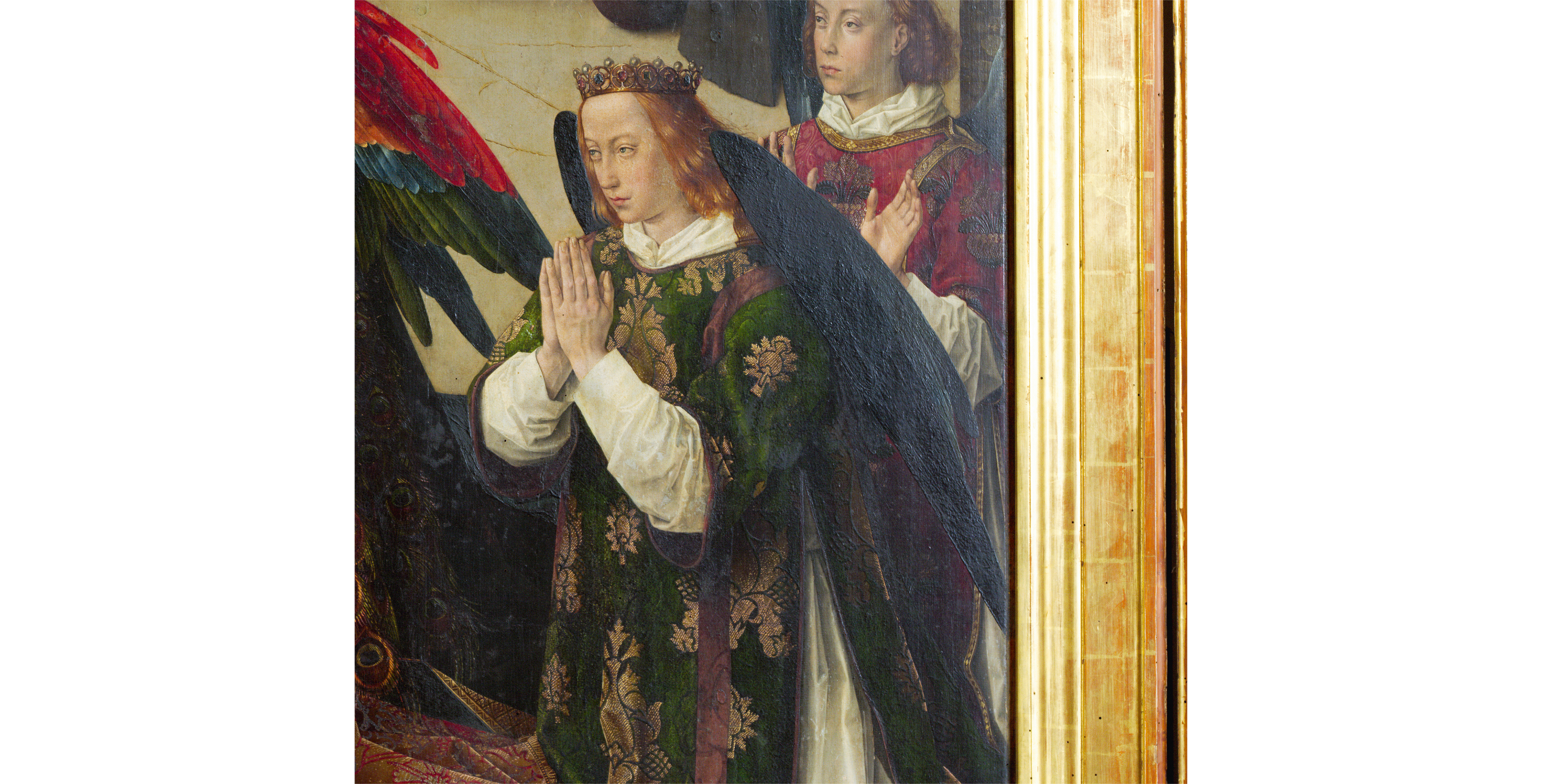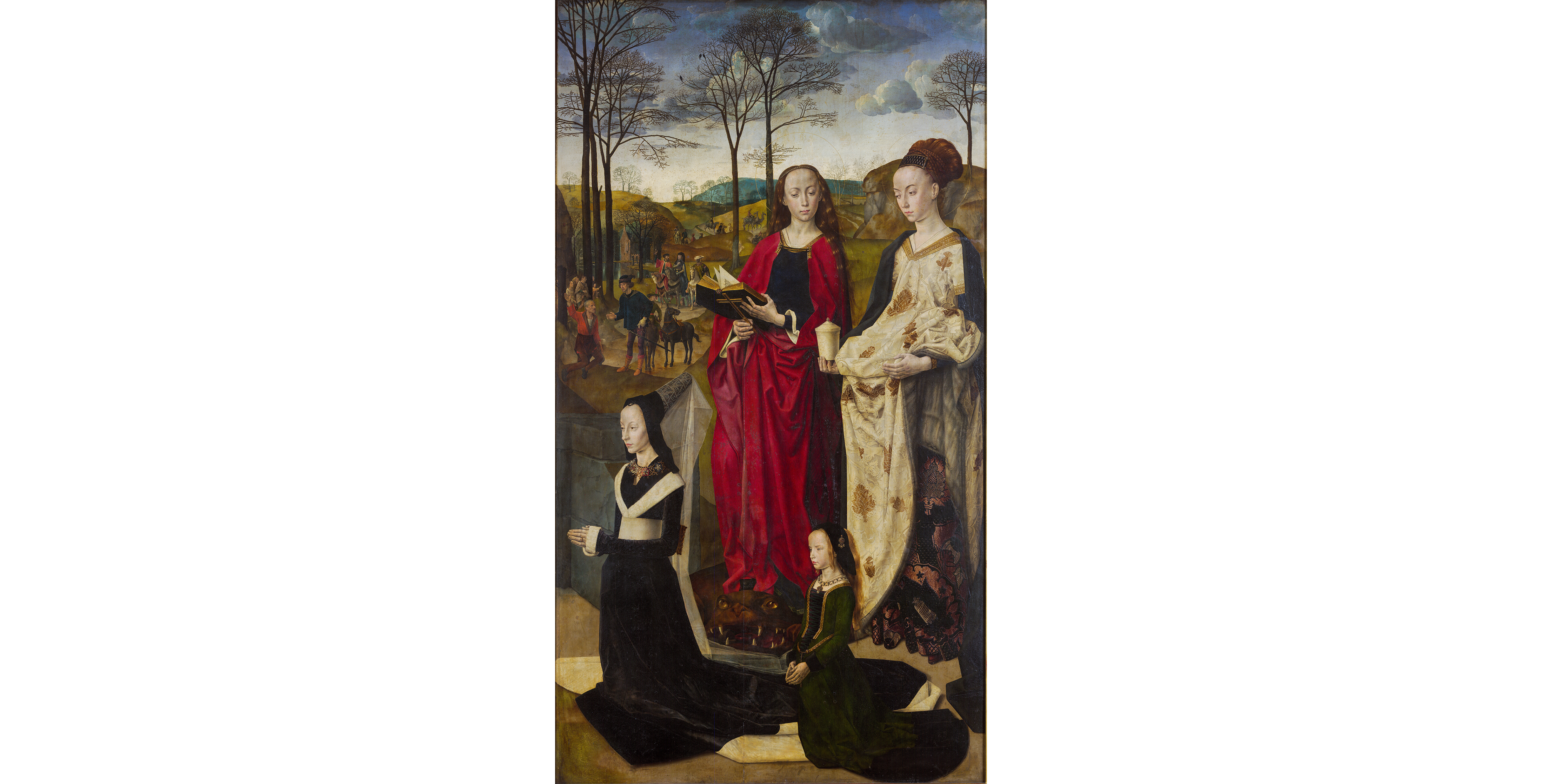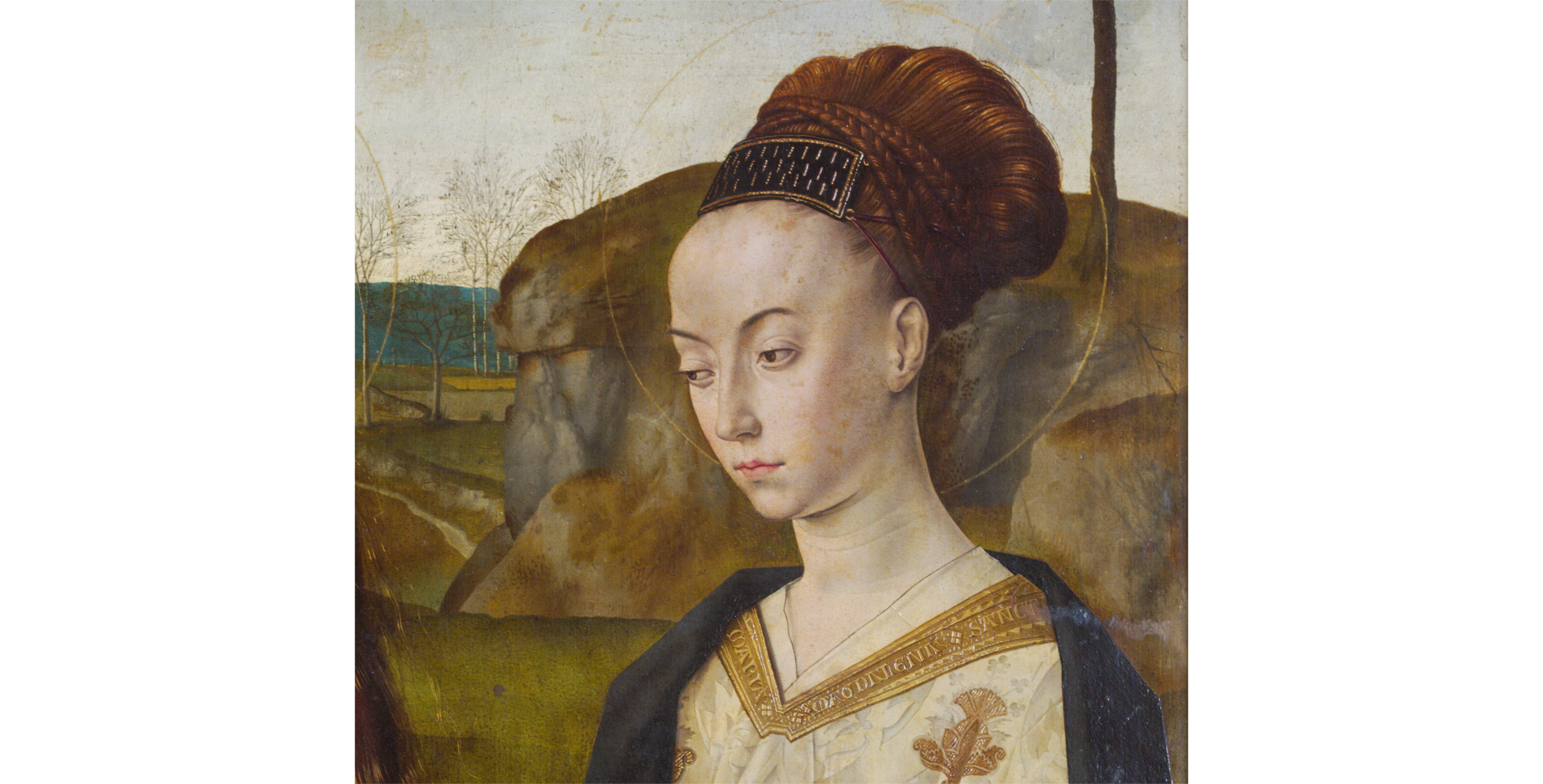 Del monumentale Trittico commissionato da Tommaso Portinari, i dettagli e in particolare quelli preziosi rappresentano forse uno degli aspetti più seducenti della ricerca di realismo di Hugo van der Goes. I monili, infatti, sono qui non solo segnali di stato sociale ma anche delle virtù morali delle dame Portinari: Maria Maddalena e Margherita rispettivamente moglie e figlia del committente. La prima reca all’anulare un anello eloquentemente composto da un rubino e uno zaffiro à cabochon affiancati, un genere di anello matrimoniale detto gimmel ring ( dal latino gemellus ) ben documentato nella ritrattistica fiamminga. Maria inoltre indossa un opulento collare di smalti, rubini, zaffiri, perle e grani di onice di fattura verosimilmente borgognona. La scelta delle gemme nasce da urgenze simboliche che, travalicando le motivazioni estetiche ed economiche, raccontano il ruolo della Dama ornata nel matrimonio, nella famiglia e nella società del suo tempo: in questo caso le perle significano castità, i diamanti forza e nobiltà, i rubini amore e generosità e gli zaffiri umiltà. Gioielli di simile importanza erano spesso doni di nozze o meglio ‘prestiti’ destinati a rimanere di proprietà del marito cui spettava il diritto di disporne a propria convenienza. Infatti in questo collare realmente esistito e documentato fedelmente anche da Hans Memling nel ritratto di Maria Portinari oggi al Metropolitan Museum di New York, è stato ipoteticamente individuato il monile che Tommaso fu costretto, in seguito, a vendere per ripianare i debiti del fallimento del Banco mediceo da lui diretto a Bruges.