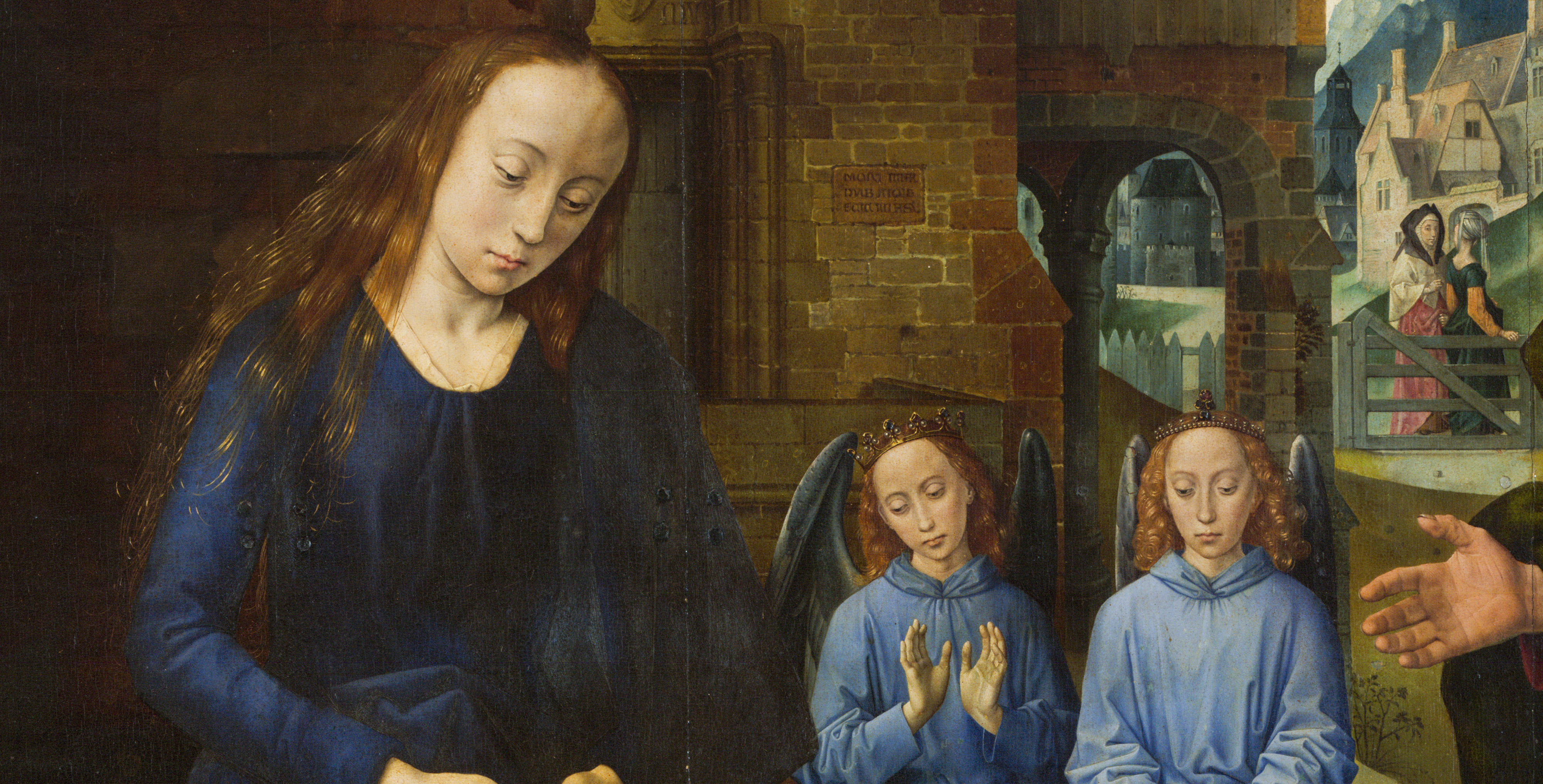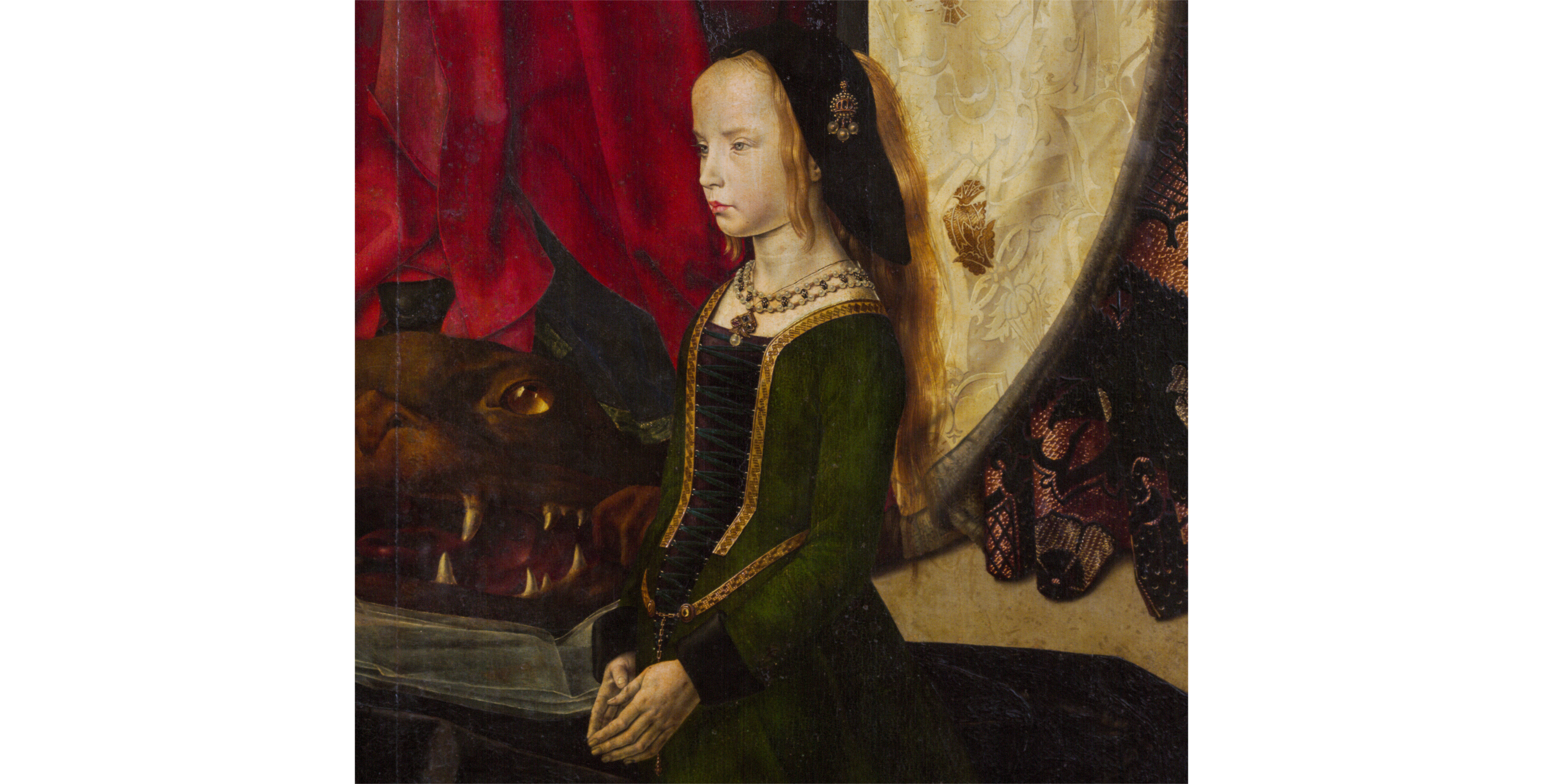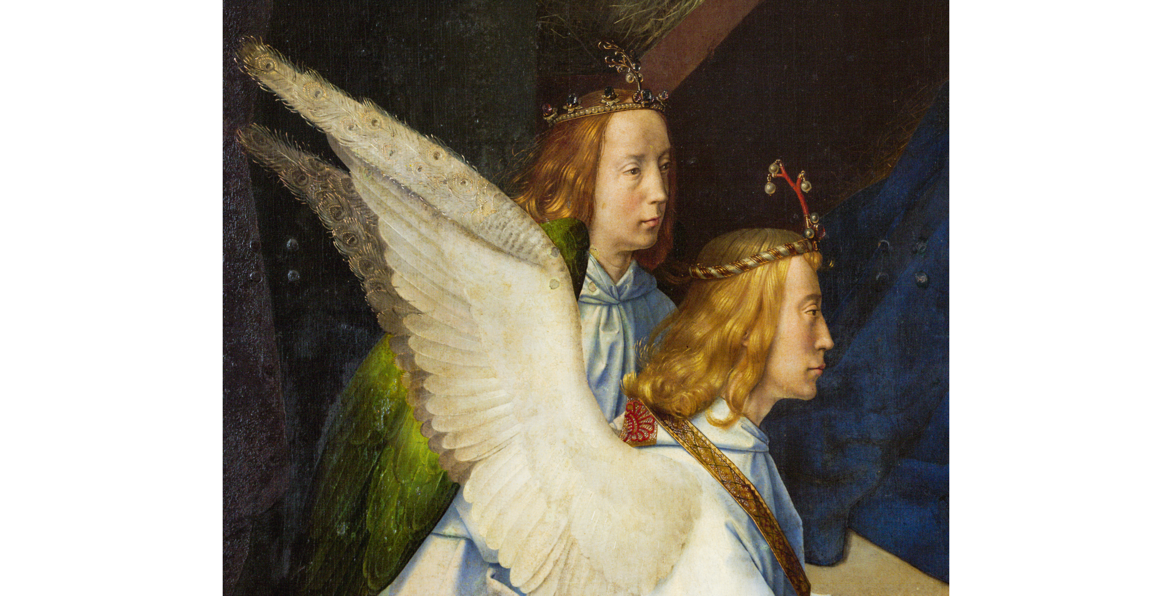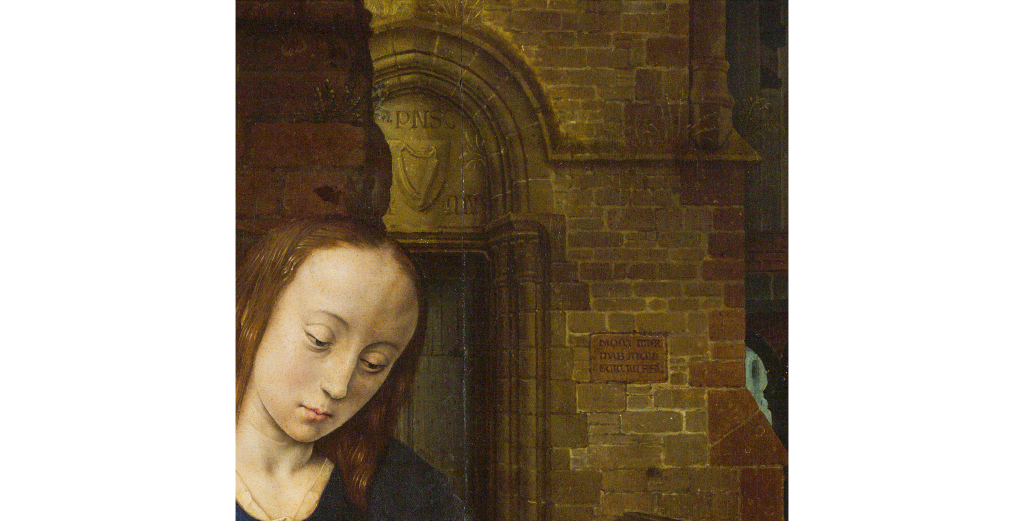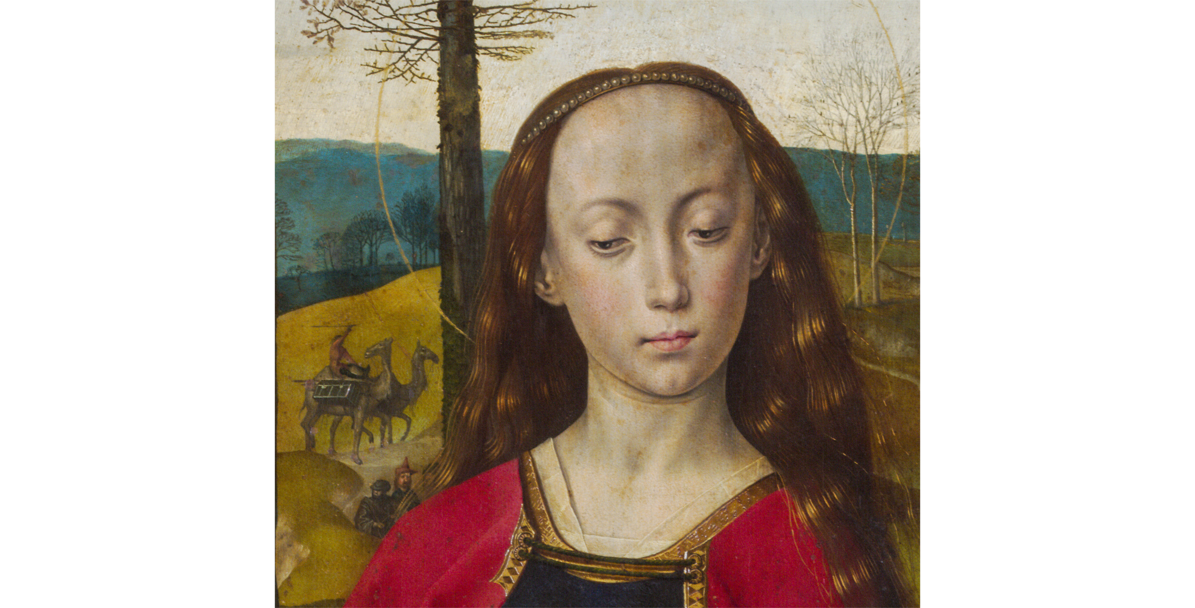 Del monumentale Trittico commissionato da Tommaso Portinari, i dettagli e in particolare quelli preziosi rappresentano forse uno degli aspetti più seducenti della ricerca di realismo di Hugo van der Goes. I monili, infatti, sono qui non solo segnali di stato sociale ma anche delle virtù morali delle dame Portinari: Maria Maddalena e Margherita rispettivamente moglie e figlia del committente. La prima reca all’anulare un anello eloquentemente composto da un rubino e uno zaffiro à cabochon affiancati, un genere di anello matrimoniale detto gimmel ring ( dal latino gemellus ) ben documentato nella ritrattistica fiamminga. Maria inoltre indossa un opulento collare di smalti, rubini, zaffiri, perle e grani di onice di fattura verosimilmente borgognona. La scelta delle gemme nasce da urgenze simboliche che, travalicando le motivazioni estetiche ed economiche, raccontano il ruolo della Dama ornata nel matrimonio, nella famiglia e nella società del suo tempo: in questo caso le perle significano castità, i diamanti forza e nobiltà, i rubini amore e generosità e gli zaffiri umiltà. Gioielli di simile importanza erano spesso doni di nozze o meglio ‘prestiti’ destinati a rimanere di proprietà del marito cui spettava il diritto di disporne a propria convenienza. Infatti in questo collare realmente esistito e documentato fedelmente anche da Hans Memling nel ritratto di Maria Portinari oggi al Metropolitan Museum di New York, è stato ipoteticamente individuato il monile che Tommaso fu costretto, in seguito, a vendere per ripianare i debiti del fallimento del Banco mediceo da lui diretto a Bruges.