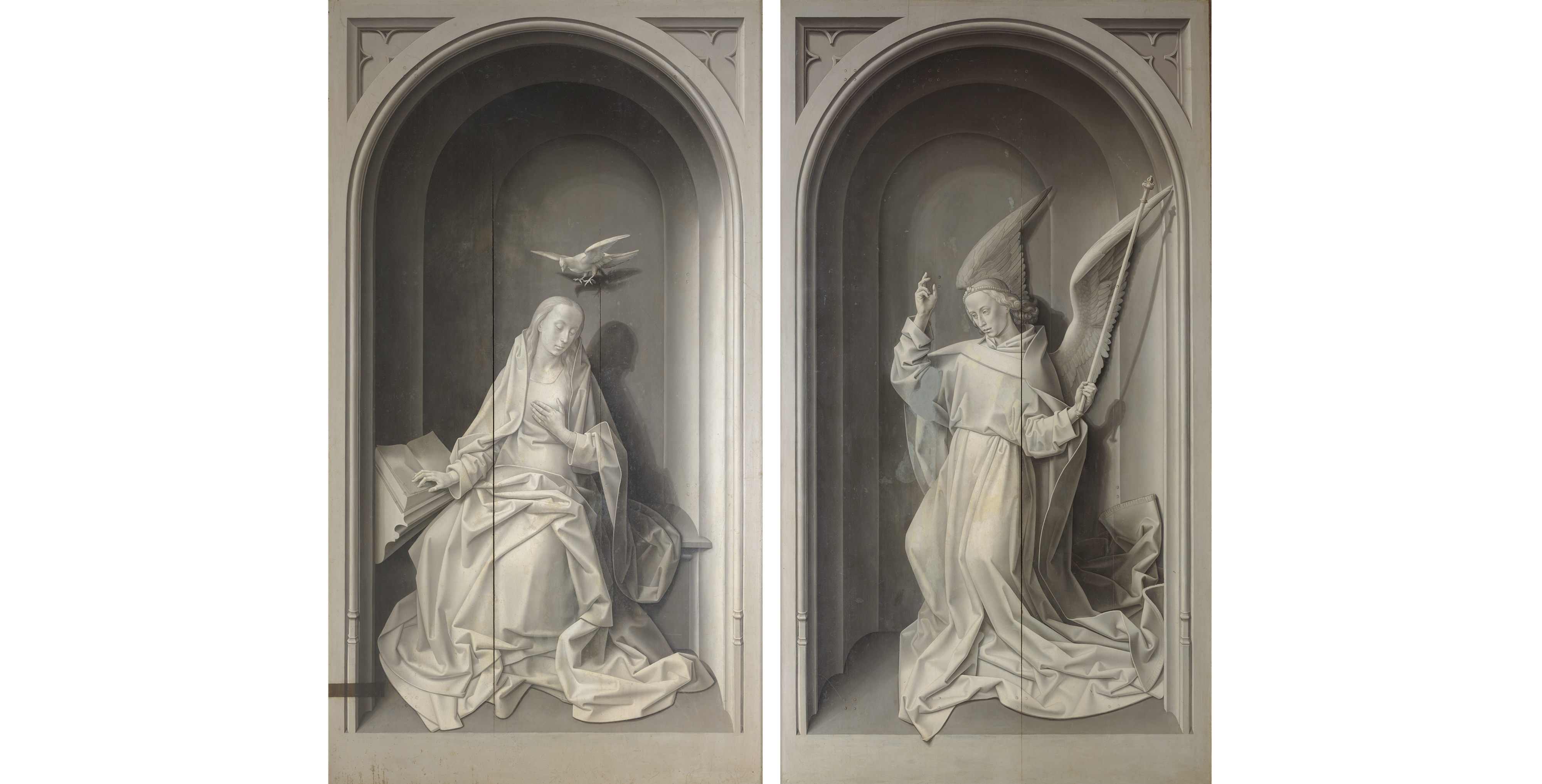 Negli sportelli esterni è raffigurata, quale necessaria premessa alla Natività, l'Annunciazione dipinta a monocromo con le due figure disposte entro profonde nicchie scandite da arcate. Nella scelta della tecnica a grisaille Hugo van der Goes si riallaccia a modelli propri della tradizione nordica, già adottati da Jan van Eyck, Robert Campin e Hans Memling, riuscendo però ad infondere, attraverso un ricercata distribuzione della luce e delle ombre, una vibrante vitalità a queste pseudo–sculture.
