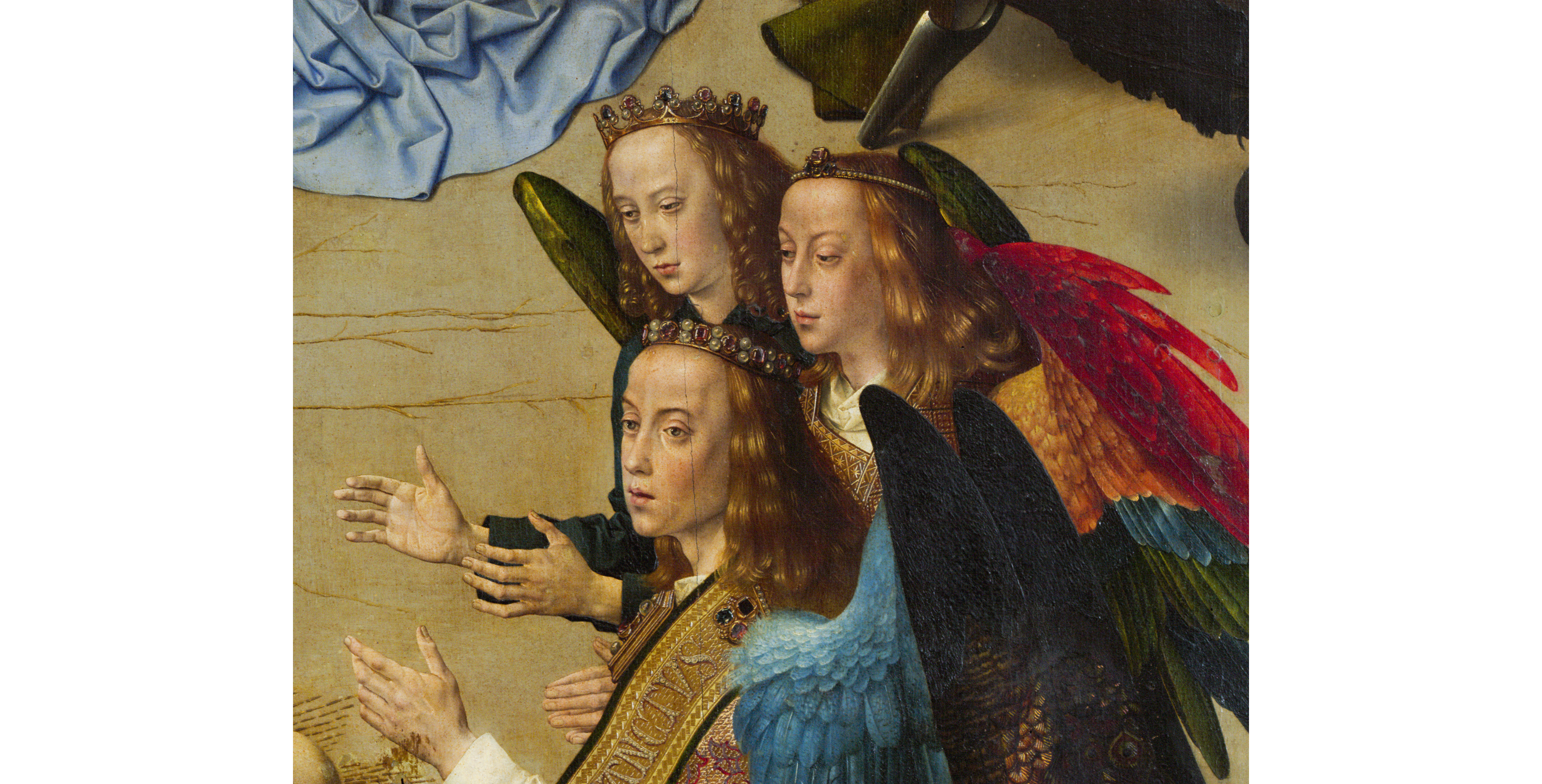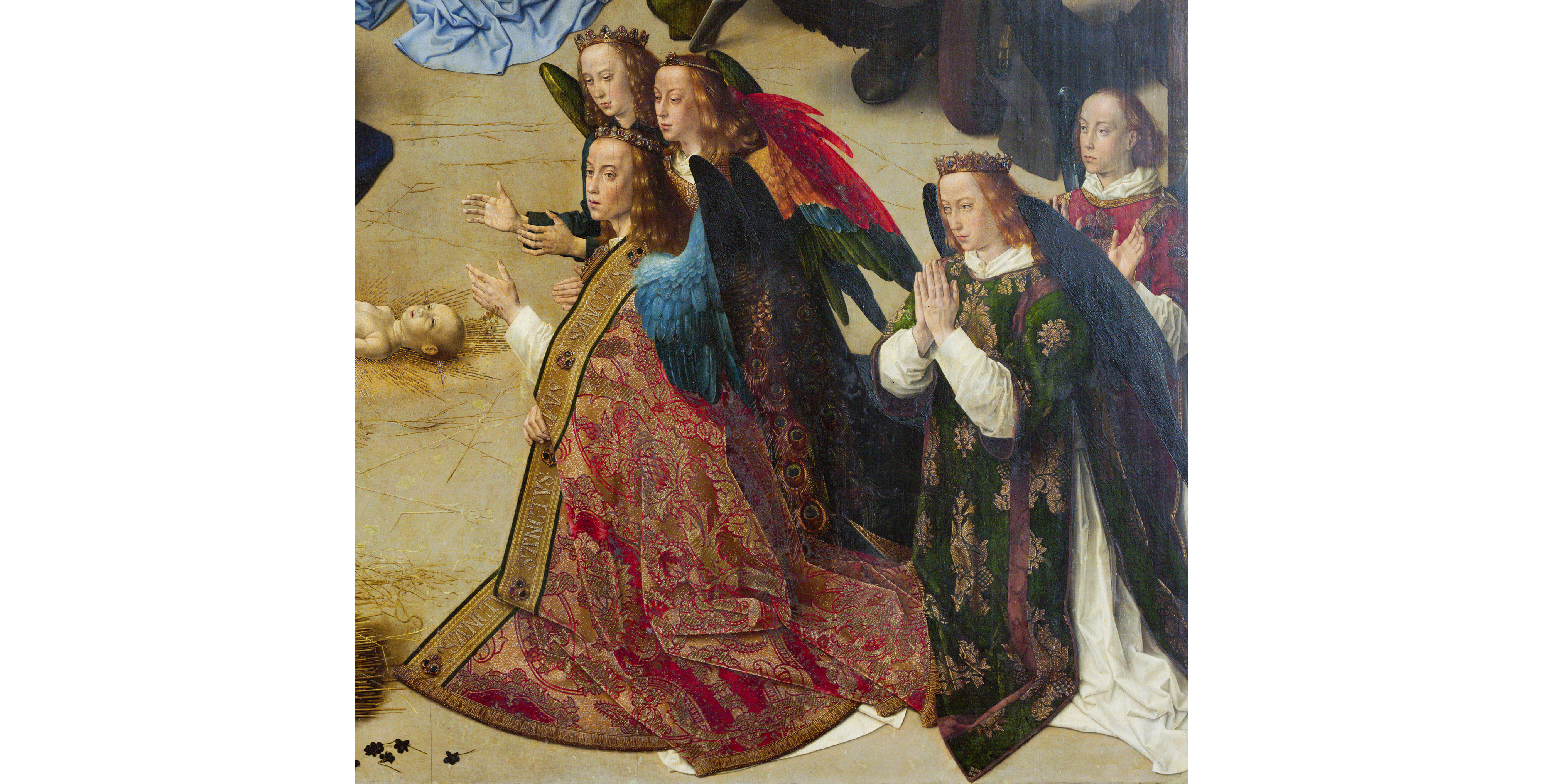 Fra tutti gli ornamenti da testa si distinguono i diademi degli angeli inginocchiati a sinistra. Si tratta infatti di curiosi bandeaux con un elemento verticale centrale a foggia di ramo d’albero con perle pendenti. Uno dei due è un rametto di corallo, spesso usato come amuleto per proteggere i bambini dalle crisi epilettiche e per alleviare i dolori della dentizione, associato dunque alla natività, il tema centrale del Trittico, ma verosimilmente anche agli stessi committenti già genitori dei tre figli raffigurati e forse in attesa di un quarto. La funzione di questa presenza, inoltre, potrebbe avere portata ancora più ampia dacché, a causa della frequente naturale forma a croce, il corallo a ramo avrebbe avuto il potere di scacciare il demonio. Tale facoltà, annotata da Marbodo di Rennes nel De lapidibus, dovette godere di una certa popolarità in Europa dove il trattato era diffuso grazie alla traduzione in molte lingue.