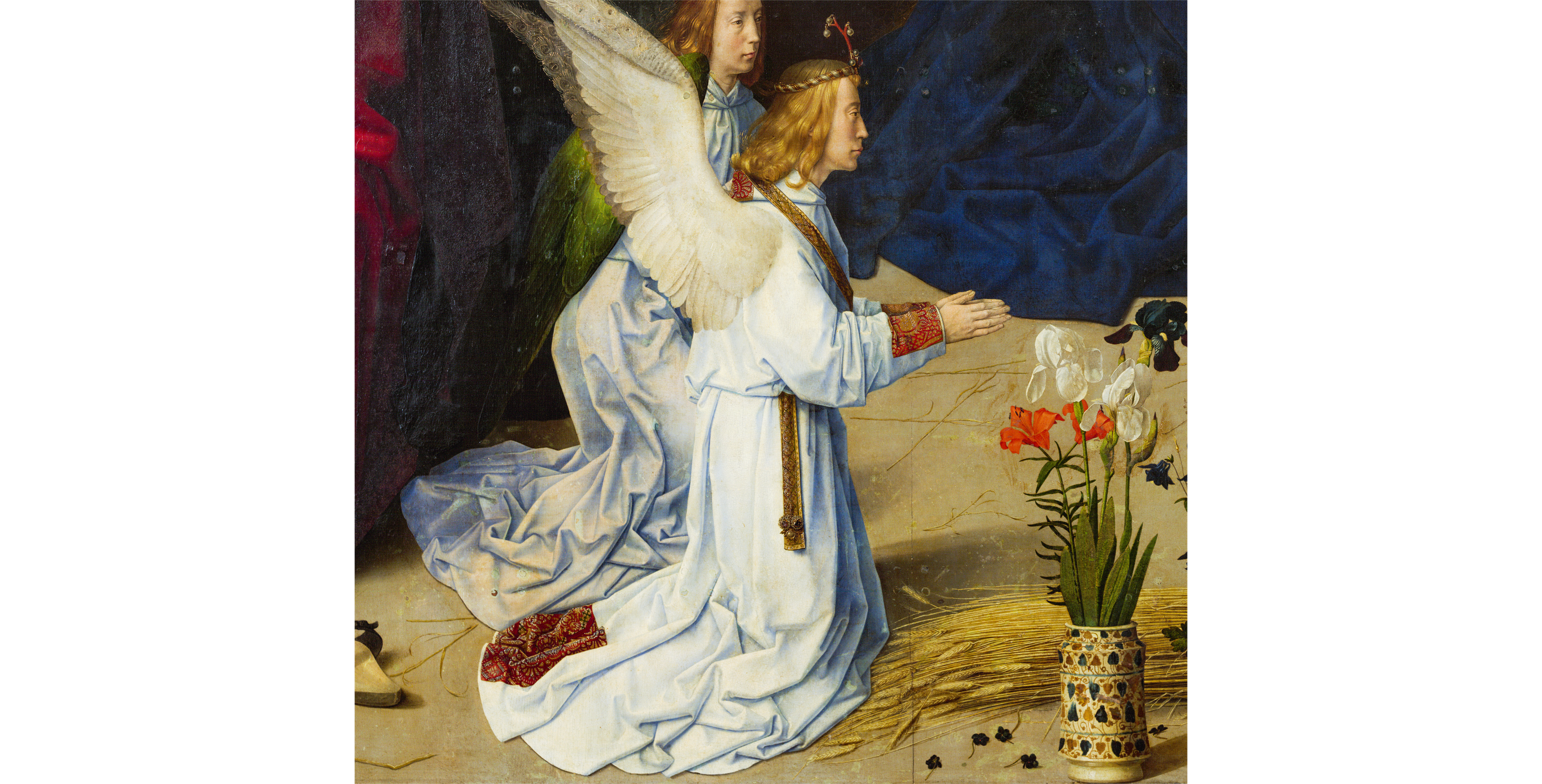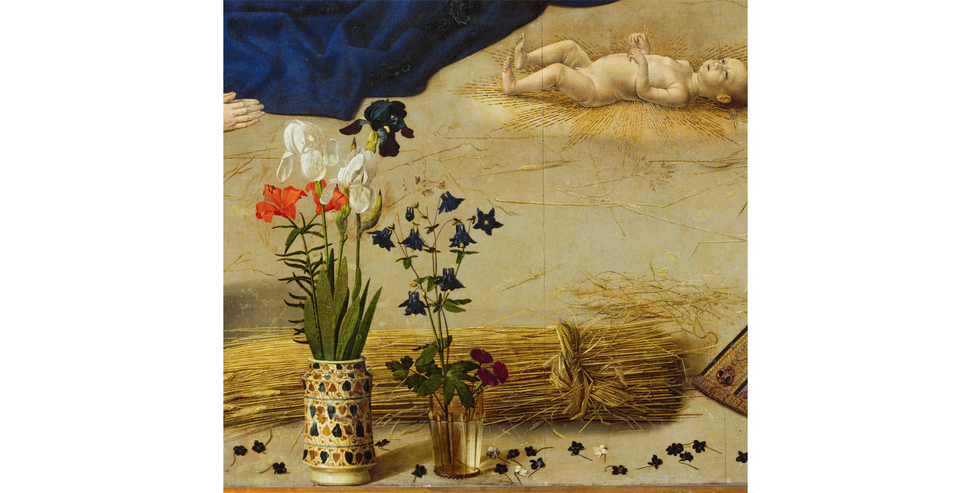 In primo piano un bellissimo brano di natura morta rispecchia l'uso di collocare fiori davanti alle immagini sacre e nello stesso tempo rimanda a consolidati significati simbolici. Un brano simile compariva ai piedi della cosiddetta Madonna Medici di Francoforte (Städelsches Kunstinstitut) dipinta qualche tempo prima da Roger van der Weyden per i signori di Firenze.