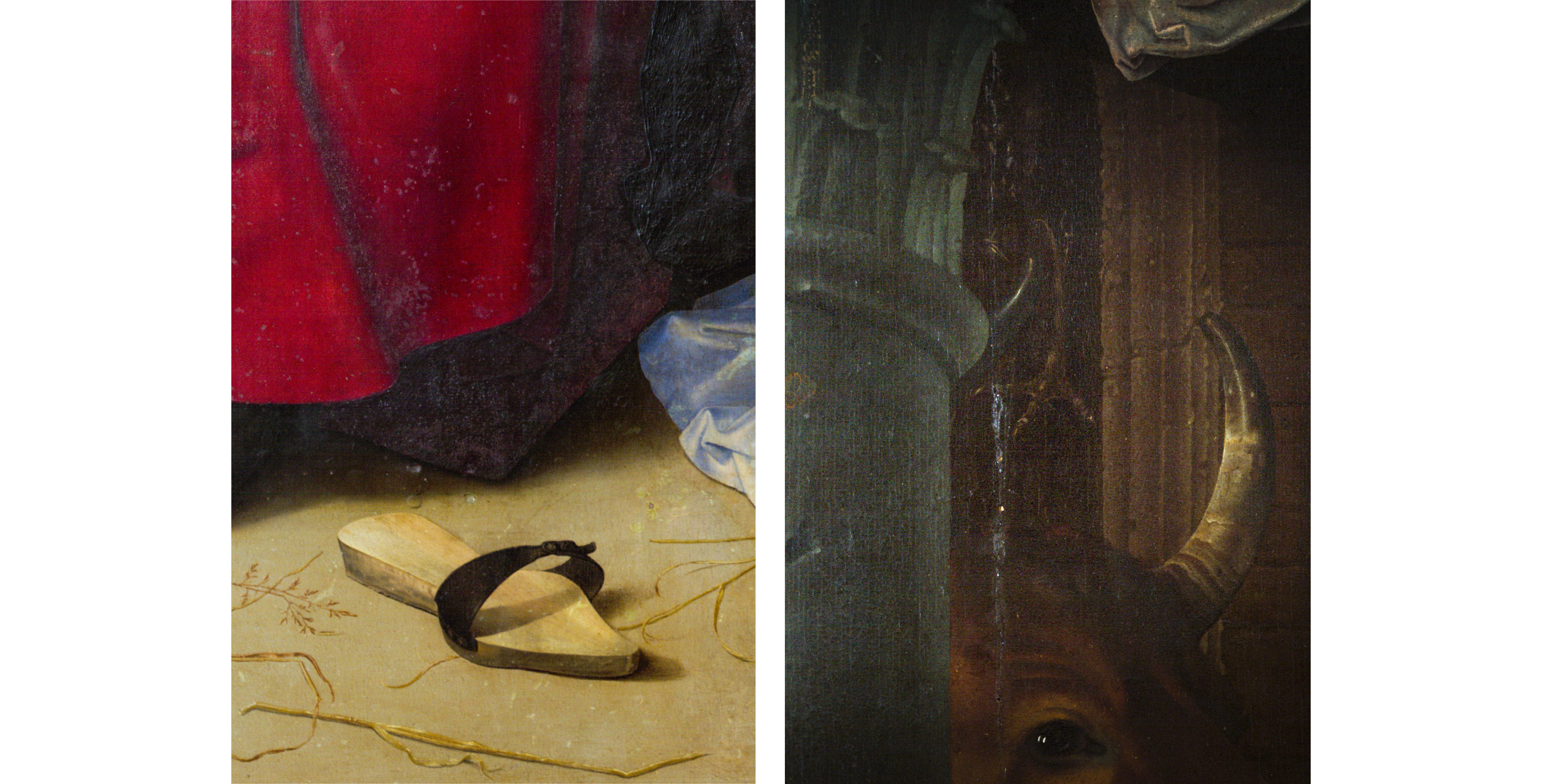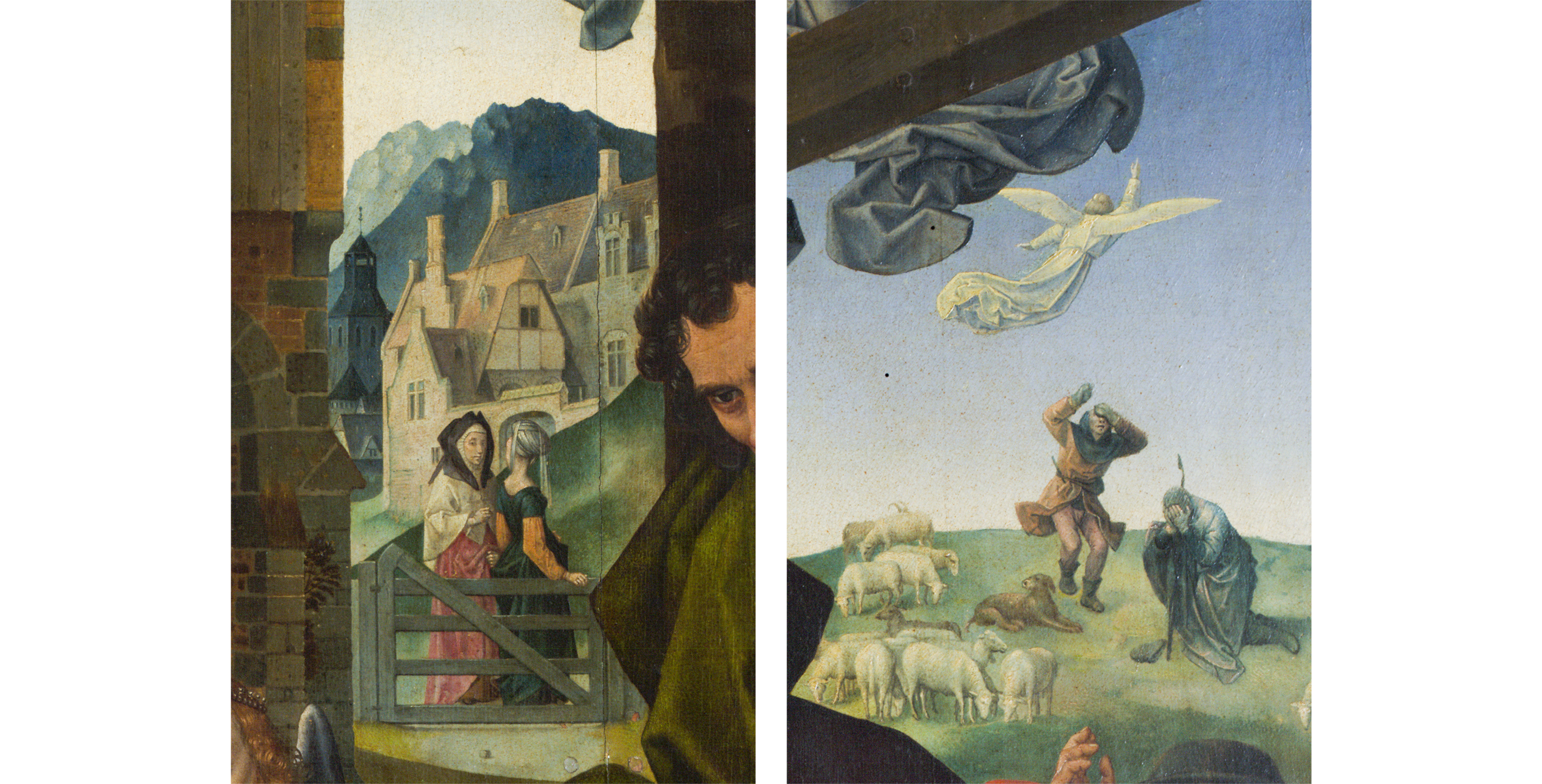 Sulla destra, in prossimità della campagna, sono raffigurate presso uno steccato due donne, probabilmente le levatrici che secondo i Vangeli apocrifi avevano aiutato la Vergine al momento del parto; nello sfondo su una collina un angelo in volo porta l'annuncio ai pastori.