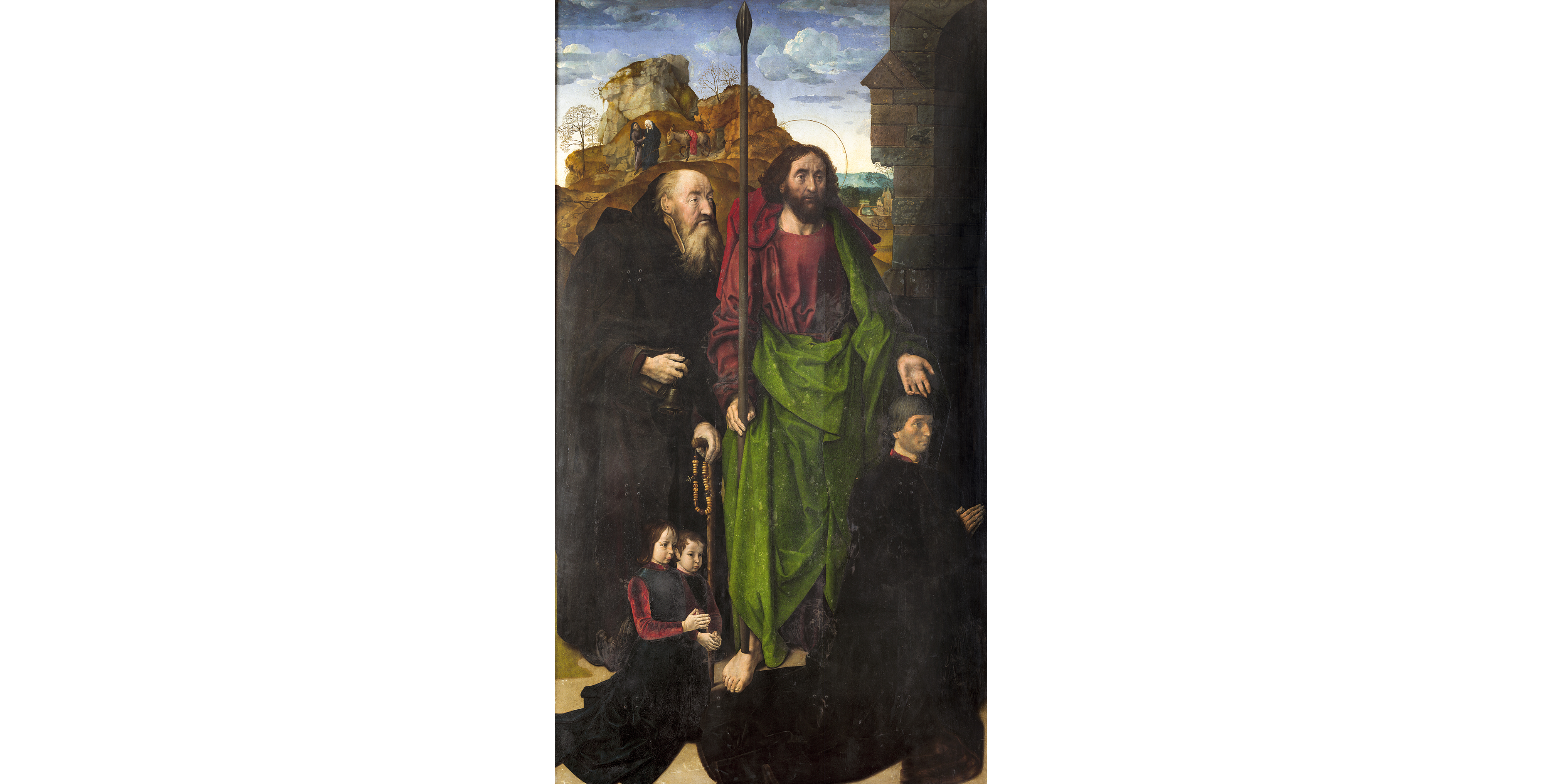 Nella tavola sinistra sono raffigurati il committente Tommaso Portinari coi figli Antonio e Pigello, nati rispettivamente nel 1472 e nel 1473 (o 1474), alle cui spalle troneggiano i santi onomastici: San Tommaso, appoggiato alla lancia, strumento del suo martirio, e Sant'Antonio abate, connotato dalla campanella, il bastone da abate e il rosario. San Tommaso, patrono della Magistratura fiorentina dei Sei della Mercanzia, era particolarmente appropriato per Tommaso Portinari, eletto magistrato verso la fine della sua vita. Nello sfondo tra le rocce acuminate, un episodio piuttosto inusuale tratto dal Protovangelo di Giacomo preannuncia l'imminente Natività: Maria incinta accompagnata dall'asinello procede a piedi sorretta da Giuseppe nella strada verso Betlemme.