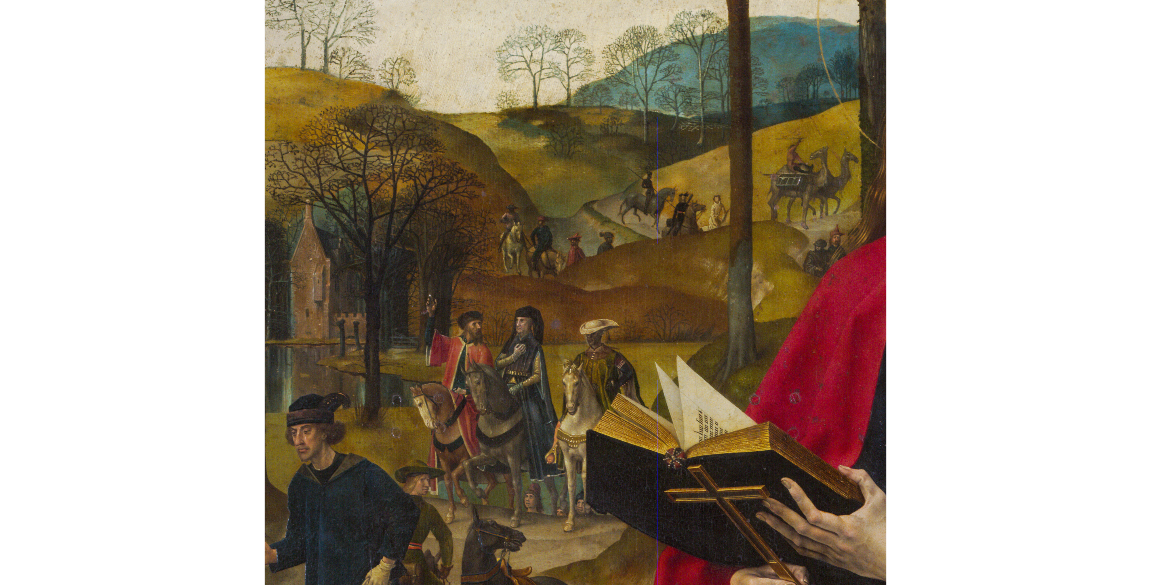 Nello sfondo, sulla sinistra, in un brullo paesaggio invernale con alberi spogli e un villaggio semi diroccato riflesso su un laghetto, si snoda il corteo dei tre magi a cavallo preceduti da un servitore a piedi che chiede la strada per Betlemme a un vecchio contadino (“Dove è colui che è nato il re dei Giudei?”, Matteo 2, 1-12).