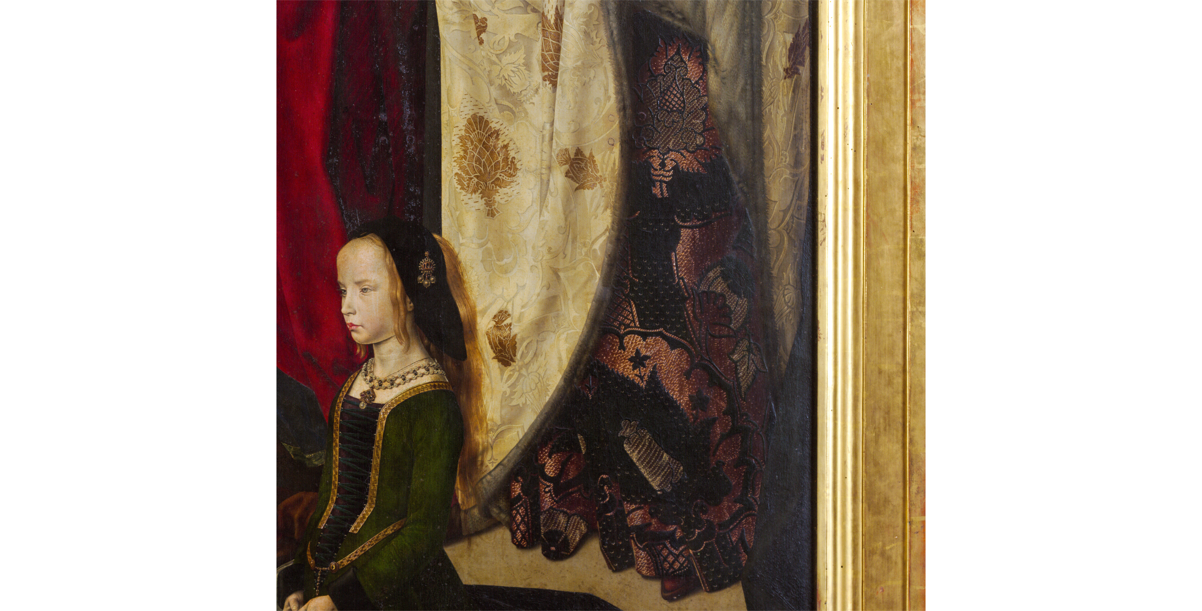 La piccola Margherita indossa un elaborato vezzo di perle ed elementi d’oro smaltati con un pendente a tre gemme: due à cabochon (un rubino e uno zaffiro) e un diamante dall’inconfondibile taglio a punta, distintivo di bontà, umiltà e nobiltà nonché un talismano di salute, ricchezza e forza. Ancora più eloquente è la sua spilla da cappello con una sequenza di ovali (smaltati?) a formare una sorta di M gotica con una gamba in più e tre perle sferiche: margaritae nel linguaggio dei lapidari, chiari rimandi al nome della giovinetta e alla sua infantile purezza. Anche il copricapo a cono della madre, un tipico hennin fiammingo, decorato dalle iniziali M e T ricamate in perle, contiene un riferimento chiaro alla sua identità e al legame coniugale con Tommaso.