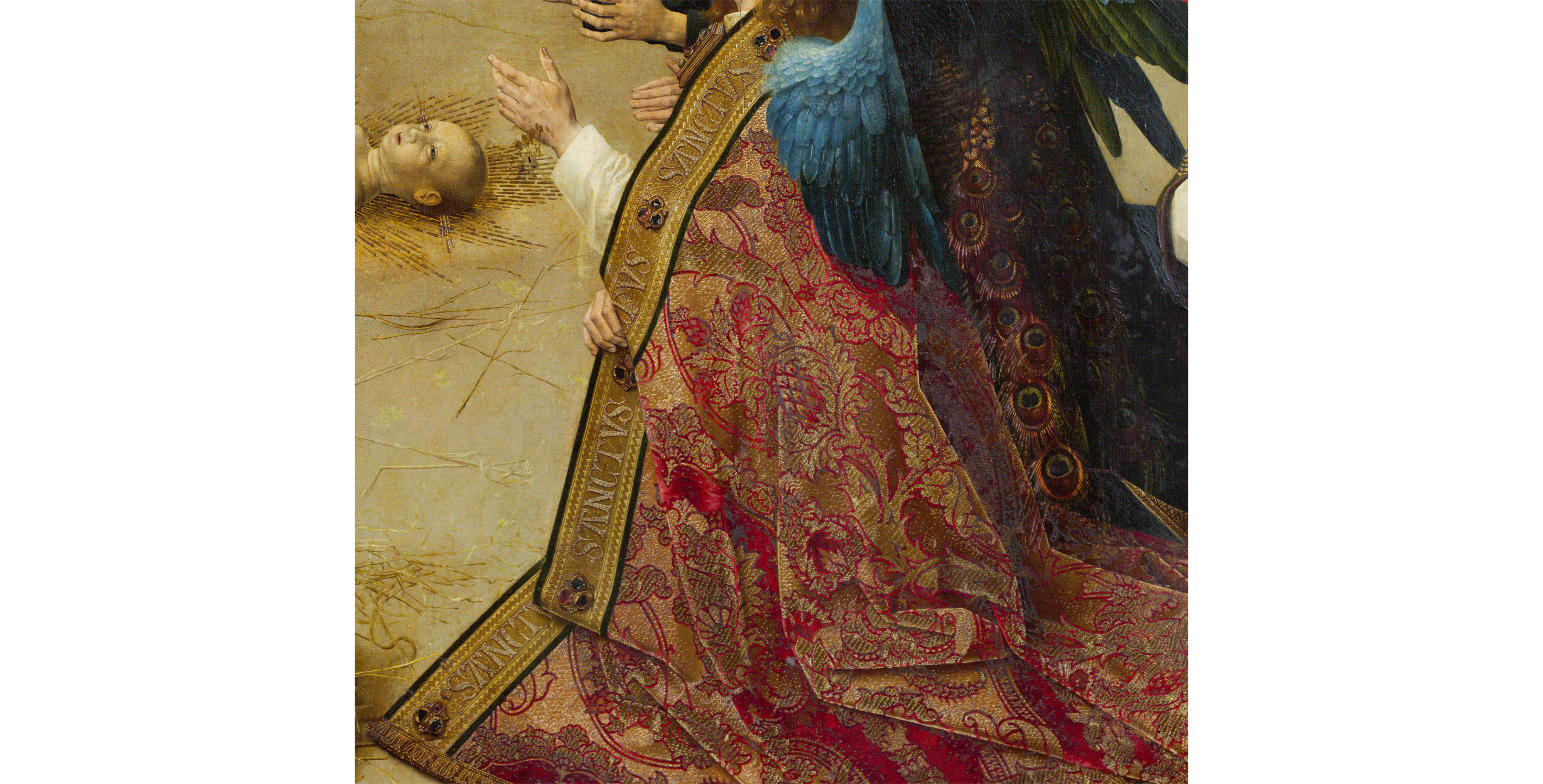 L’angelo più prossimo all’osservatore, a destra dello sportello centrale, indossa un ricchissimo piviale coerente con i colori liturgici riservati alla festività, cioè rosso e oro. Lo stolone è confezionato con un largo gallone realizzato a telaio e ricamato per tutta la lunghezza con l’aggettivo SANCTUS, più volte ripetuto. L’iscrizione, eseguita a rilievo, è ricamata con perle e intervallata, tutte le volte, da una broche con tre castoni. Anche la sontuosa fermatura del piviale è costituita da un gioiello di cui è visibile la montatura di profilo e l’aggetto delle pietre e delle altre componenti.