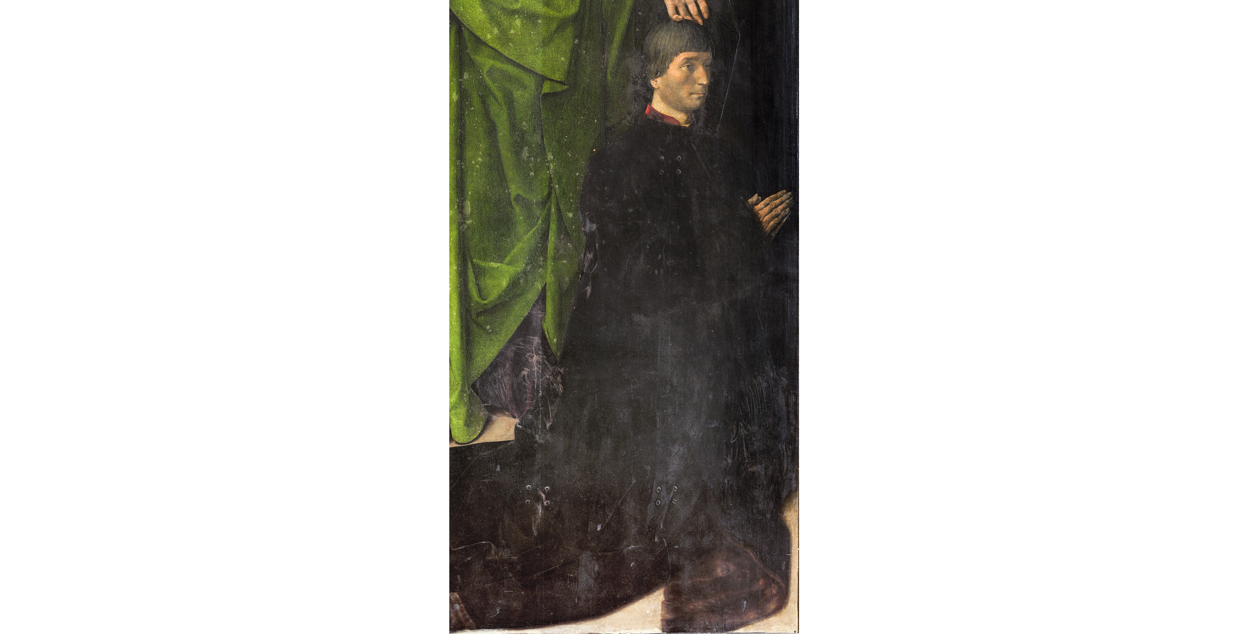 Il colore nero delle vesti maschili, ma anche femminili, si giustifica con una tendenza che, nel nord Europa, trova un grande consenso dalla metà del XV secolo, soprattutto grazie a Filippo il Buono che, pur vestendolo inizialmente in segno di lutto, grazie alle fogge ricercate ed eleganti ne trasforma il significato. Al tempo del soggiorno a Bruges di Portinari, questo colore è già appannaggio della classe mercantile e dell’apparato istituzionale della corte e della nobiltà. Tommaso Portinari, infatti, pur non avendo ricevuto una nomina ufficiale, alla corte di Carlo il Temerario era considerato come un consigliere. Come tale e come rappresentante della comunità dei mercanti fiorentini residenti a Bruges, riceve dal duca l’onore di sfilare, nel 1468, al corteo delle nozze con Margherita di York: