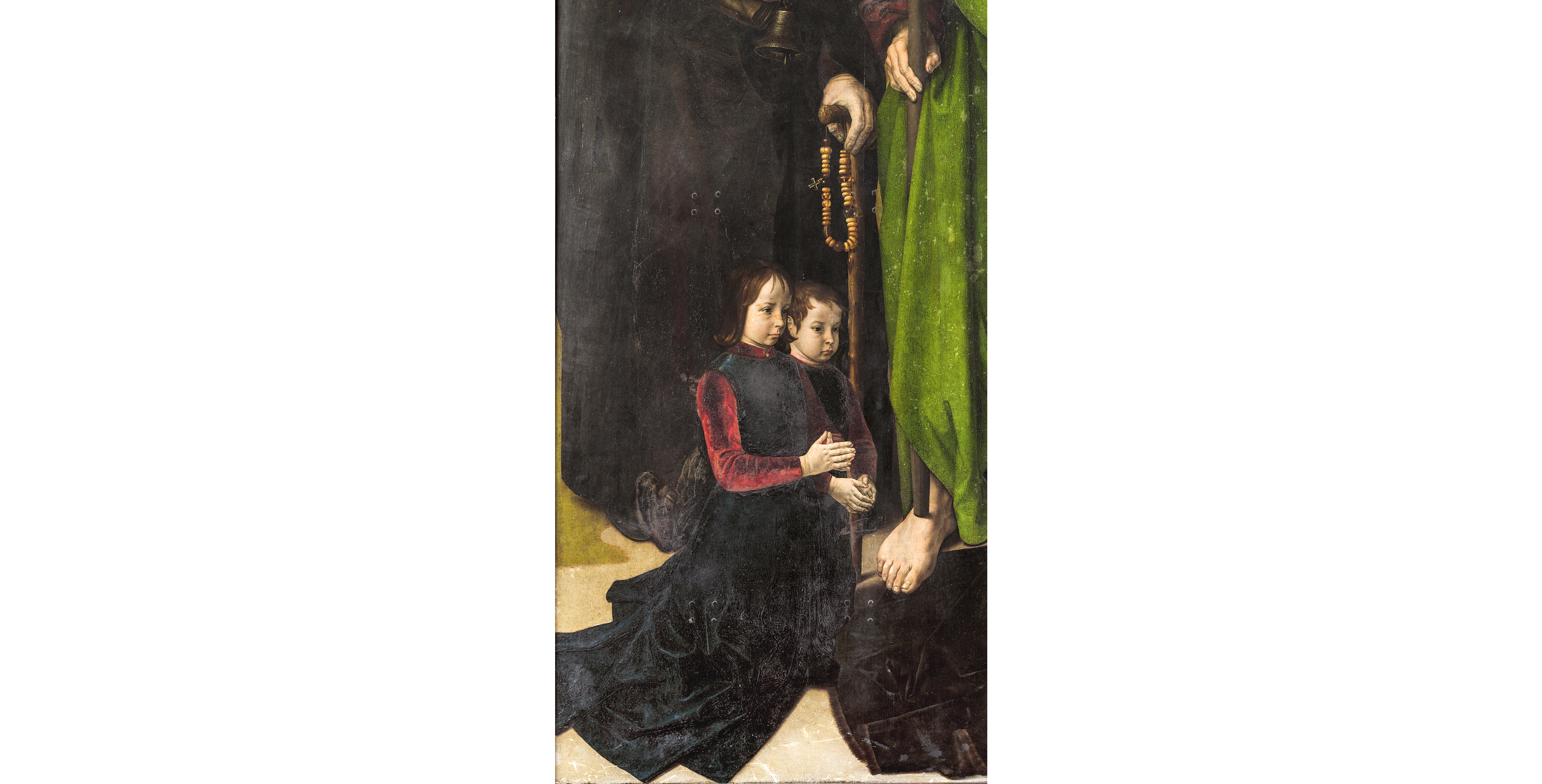 I fanciulli di casa Portinari, Antonio e Pigello, indossano una sopravveste nera smanicata, probabilmente aperta sul davanti, piuttosto lunga e soppannata, come si nota dai risvolti intorno al collo, al giromanica e all’orlo, probabilmente di raso. Sotto la sopravveste, entrambi i fanciulli indossano o una gonnella o un pourpoint di velluto rosso unito.