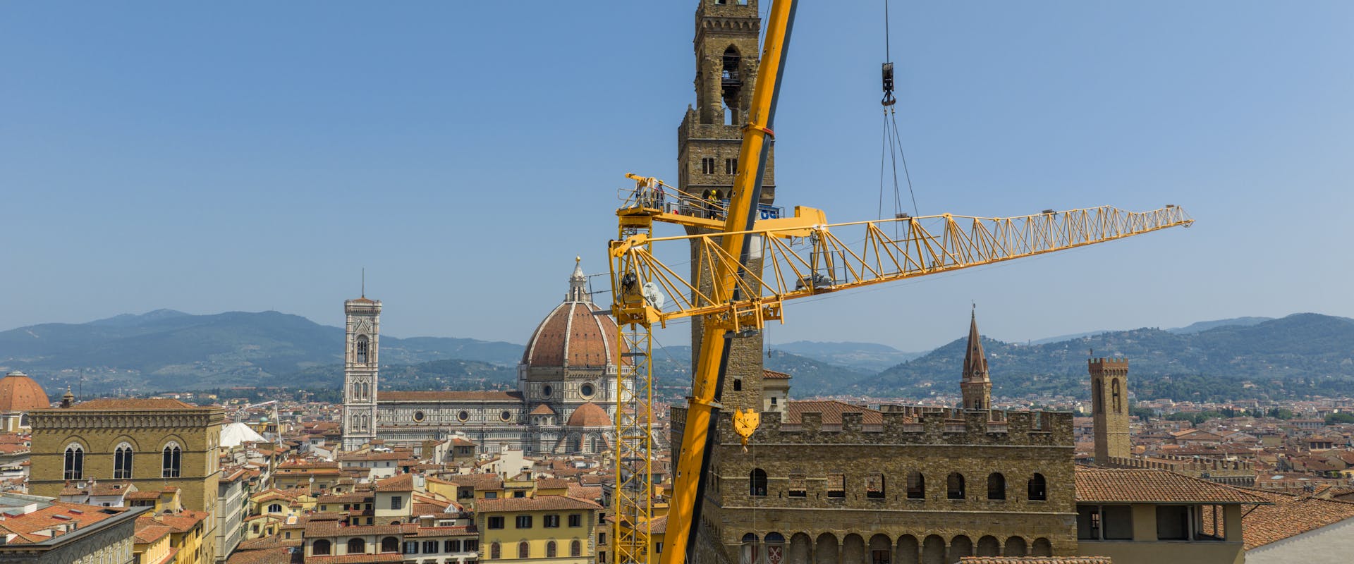 Dopo quasi vent'anni, lo skyline di Firenze torna intatto. Stop, finalmente, ai milioni di foto panoramiche del cuore storico di Firenze rovinate dall'ingombrante presenza della maxi gru del piazzale degli Uffizi, installata nel 2006 nell'ambito del cantiere di ampliamento del museo. Ci sono voluti sei giorni, dalla mattina del 16 giugno, per completare lo smontaggio dell'enorme mostro metallico: sessanta metri di altezza per 518 quintali di peso (344 metallo, 144 di contrappesi in cemento elevati oltre quota 50 metri), un vero colosso, visibile non solo sopra la loggia dei Lanzi e piazza Signoria ma fino a molti chilometri di distanza dalla città.