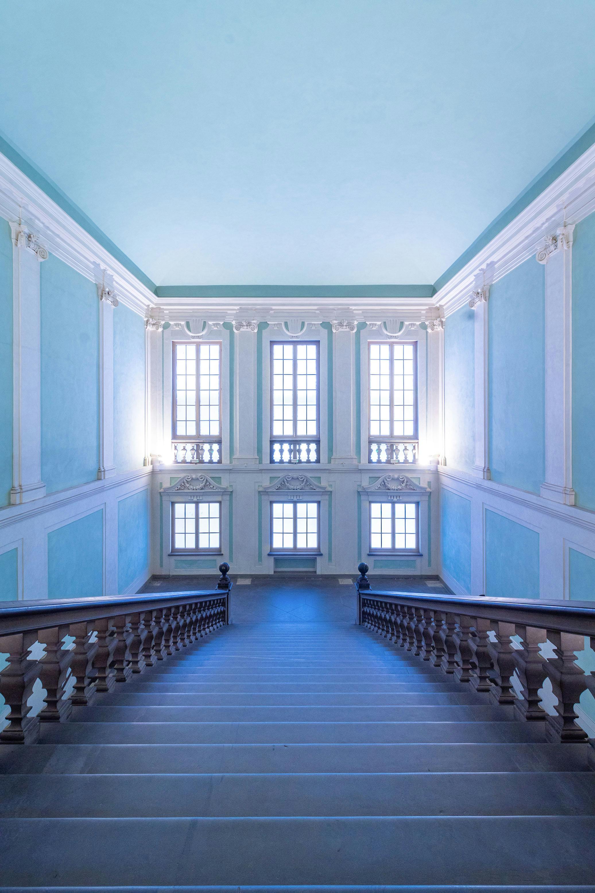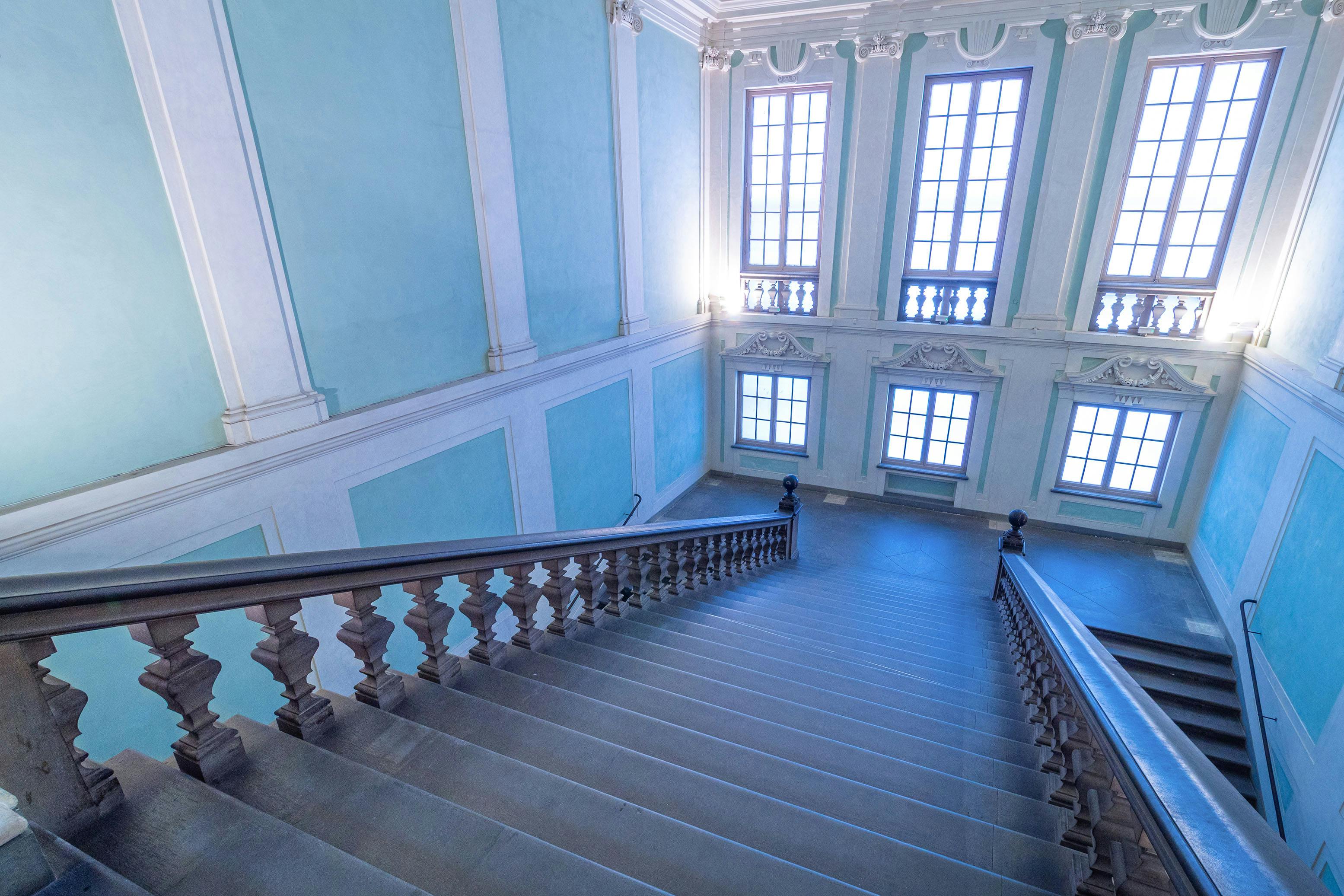 L’intero scalone era stato restaurato fra il 2005 e il 2007 nella parte degli intonaci, degli stucchi e degli apparati decorativi. La tinteggiatura delle pareti ‘verde Lorena’ fu realizzata sulla base di una serie di saggi che riportarono in luce il colore scelto dai Granduchi lorenesi impiegati anche in altri luoghi su cui la dinastia granducale intervenne: Poggio Imperiale, Specola, Kaffeehaus, nonché la Limonaia di Boboli. La particolare coloritura che i documenti storici definiscono “verdognolo con terra verde, verderami ed altro” è in linea con quanto si faceva nell’impero austro-ungarico, seguendo i dettami di un elaborato Rococò.