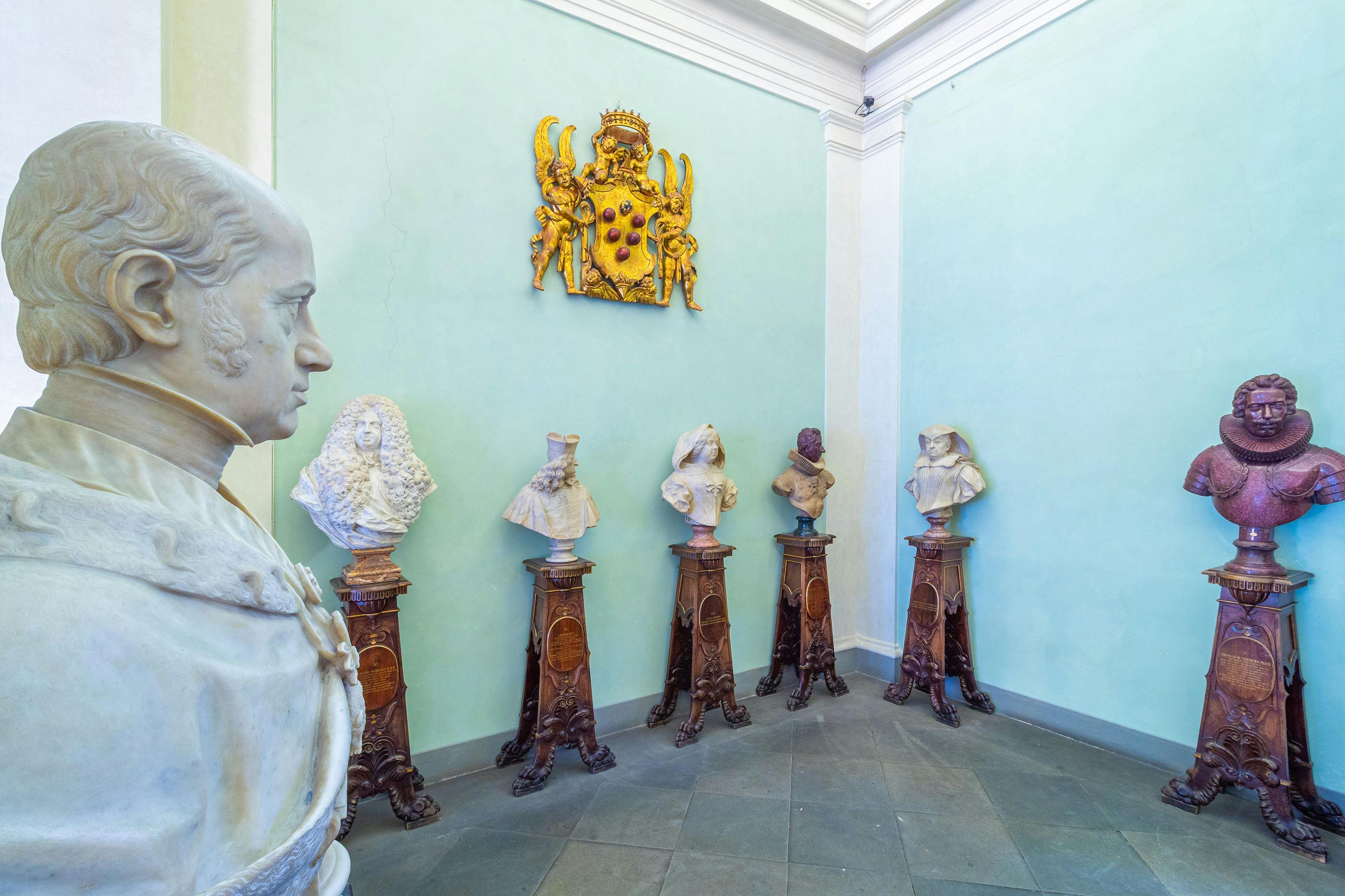 “Pietro Leopoldo, figlio dell’ Imperatore Francesco, di casa d’Austria e Granduca di Toscana, ebbe cura di riordinare il Museo Mediceo accrescendone gli spazi e il numero delle opere e di abbellirlo con un aspetto ancora più splendido per il lustro della sua città e per lo sviluppo delle Belle Arti”: questa l’iscrizione (in latino) apposta sull’ingresso della Galleria per salutare i visitatori. Sopra la ‘dedica’ del nuovo Granduca, scritta in latino di pugno dall’abate Luigi Lanzi direttore del museo, di Pietro Leopoldo è collocato in bella vista il busto all’antica, eseguito dallo scultore settecentesco Francesco Carradori. A salutare i “forestieri”, come si diceva nel Settecento, si trovano, in cima allo scalone, appena riallestiti, anche i volti dei predecessori alla guida del Granducato, i Medici, che avevano fondato e accresciuto la Galleria (da Cosimo I all’ultimo, Giangastone). Pure per ognuno di loro Lanzi aveva composto iscrizioni latine a futura memoria, rendendo omaggio in particolare ai loro meriti ed imprese collezionistiche, fondamentali per la costruzione dello sterminato patrimonio d’arte degli Uffizi. Ora, nelle loro sontuose parrucche, i busti sono posti su massicci sgabelloni lignei. E, anch’esso ligneo, il grande stemma ligneo policromo di Baccio d’Agnolo domina dall’alto della parete la parata marmorea.