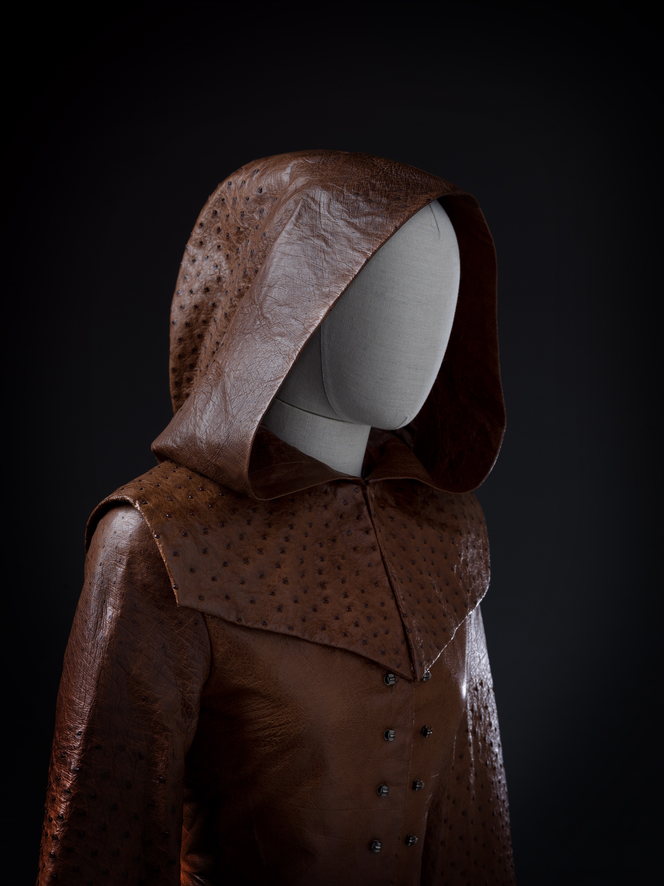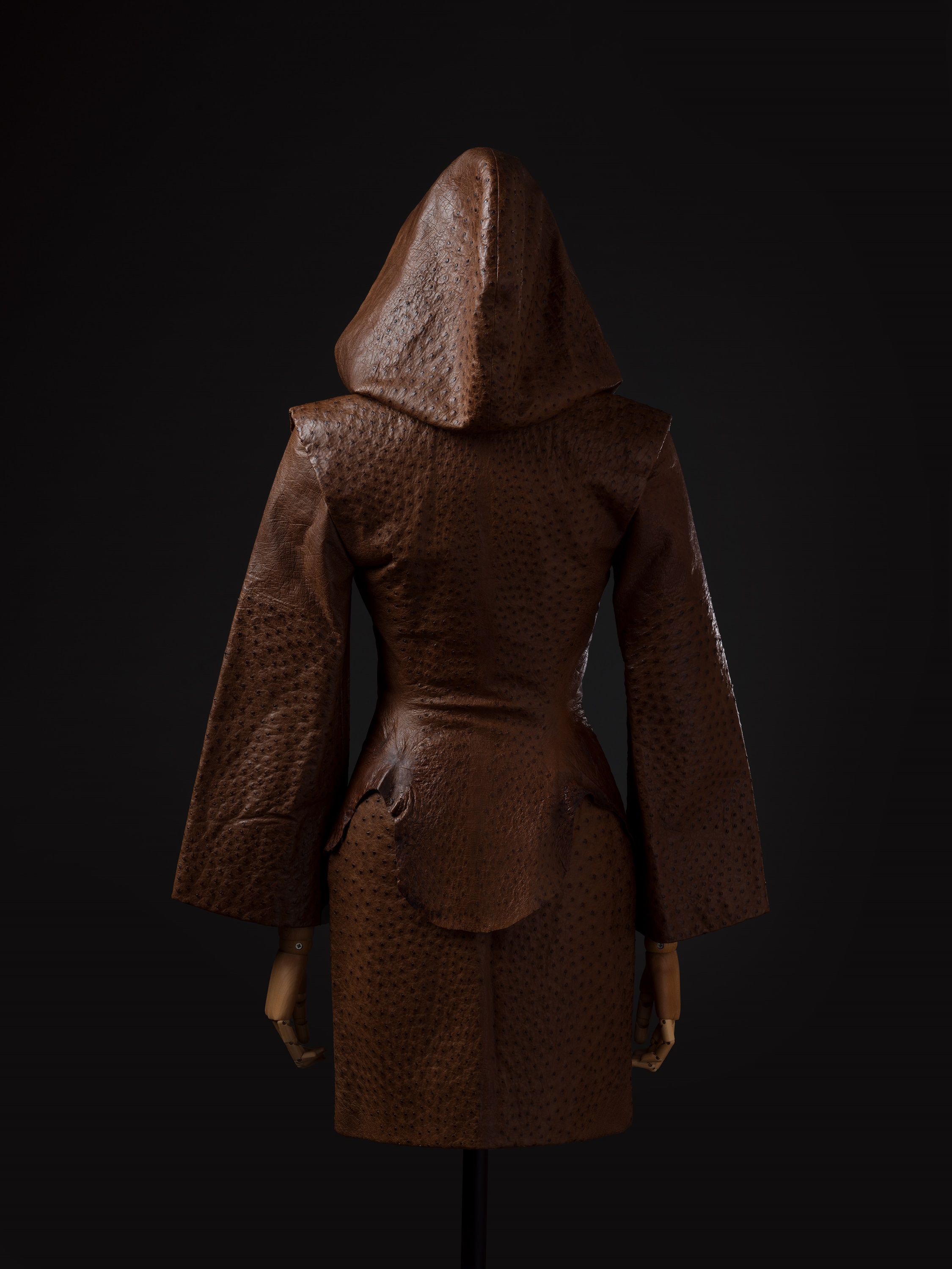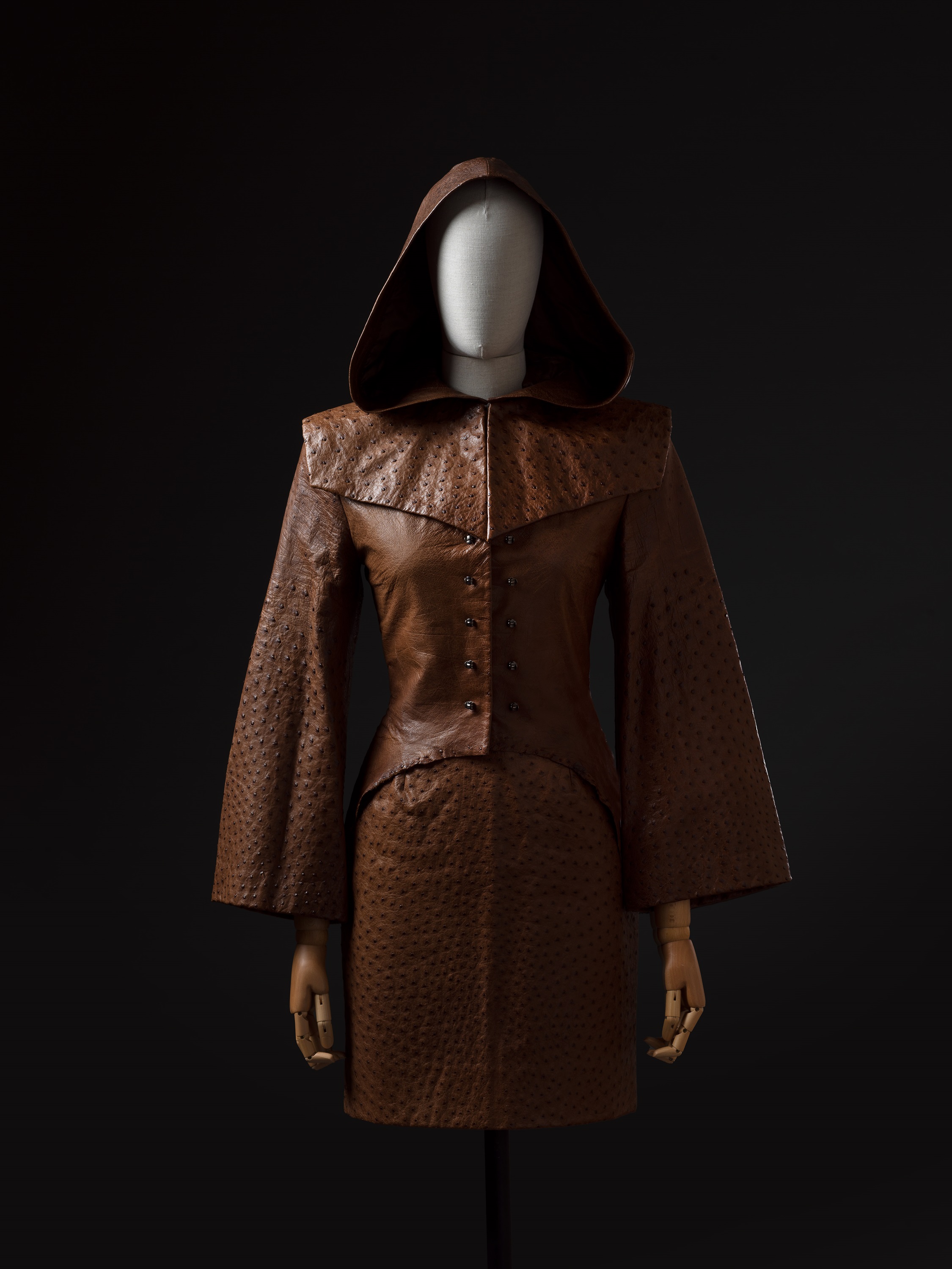 Abito a due pezzi composto da una giacca con ampio cappuccio e da una gonna in pelle di struzzo.