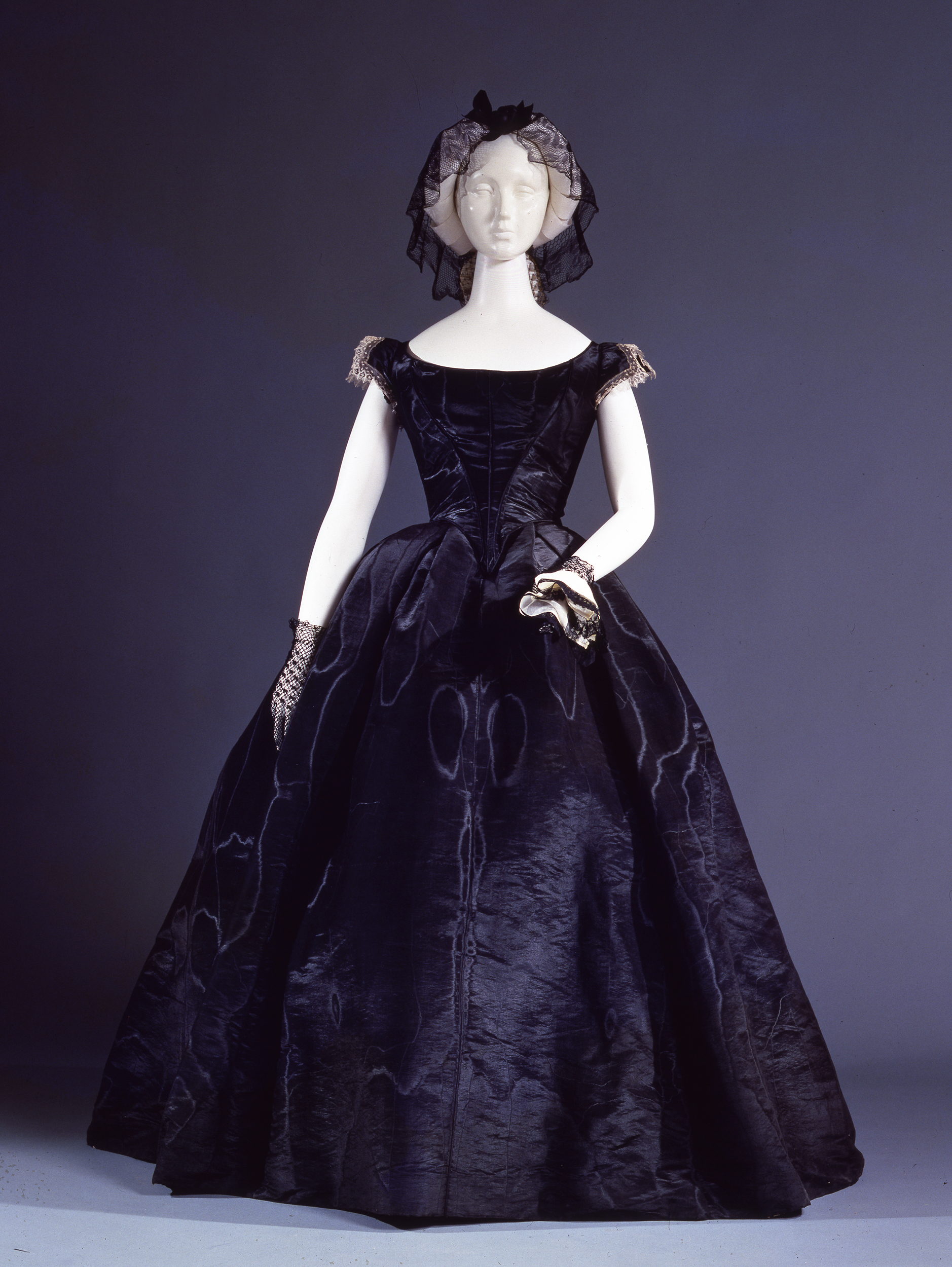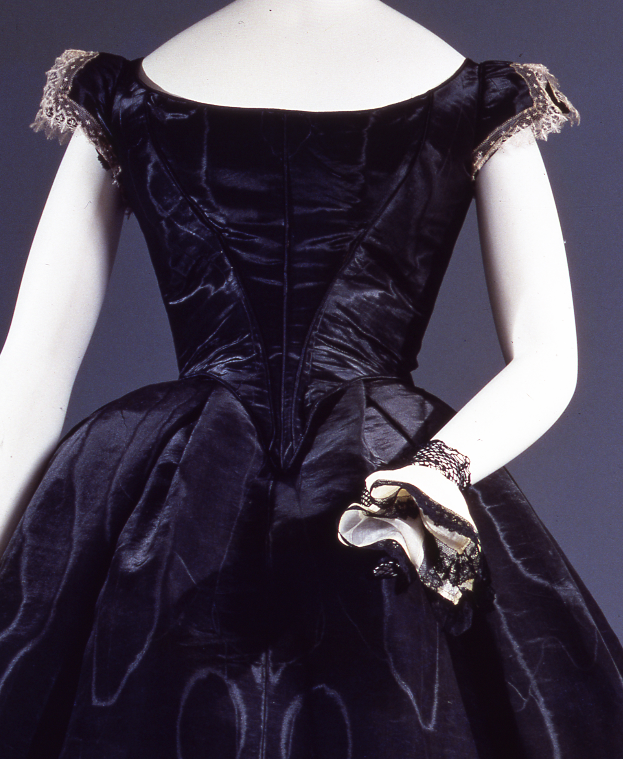 Questo completo in tre pezzi - gonna, corpino da sera e corpino da giorno - è appartenuto probabilmente ad Emilia Tedeschi, moglie del pittore inglese John Henry Bradley, ed è databile presumibilmente al 1861, quando, in seguito alla morte del principe Albert, marito della regina Vittoria, divenne obbligatorio presentarsi alla corte inglese, anche per le occasioni formali, rigorosamente in nero. I due corpini, quello da sera dall’ampia scollatura rotonda e dalle cortissime maniche ad aletta, e quello alternativo da giorno, accollato e a maniche lunghe, permettevano di trasformare l’ensemble a secondo dell’occasione. Il corpino da giorno e la gonna, negli anni Novanta del XIX secolo, probabilmente in seguito alla morte del marito della proprietaria avvenuta nel 1890, hanno subito una profonda trasformazione per poter essere utilizzati nuovamente per il lutto, adattandoli alle nuove mode. Intervenire sartorialmente per poter riutilizzare un abito vecchio di trent’anni non era inconsueto. All’epoca il valore di un abito risiedeva spesso in gran parte nel tessuto utilizzato, sete pregiate e costose, e modificarlo col passare delle mode adattandolo alle nuove linee, per poter sfruttare ancora il tessuto acquistato, era una prassi comune, spesso anche nelle classi più elevate. L’ampia gonna che nel 1861 era sorretta da una voluminosa crinolina, è stata stretta ripiegando all’interno il tessuto in eccedenza per adattarsi alla nuova linea triangolare delle gonne di fine secolo. Il corpino ha subito una trasformazione ancora più radicale. Del capo originale rimane solo il tronco, nascosto sotto a nuovo tessuto di chiffon nero arricciato e pieghettato. Le maniche originali, scucite e arricciate, sono state trasformate in palloncini che ornano le spalle da cui scendono nuove maniche aderenti in taffetas lilla ricoperto da trasparente chiffon nero. Proprio le maniche, voluminose sulle spalle che poi si stringono verso l’avambraccio, sono l’elemento che maggiormente permette di datare questa modifica agli anni Novanta del secolo, decennio che del volume delle maniche fa il suo tratto distintivo.