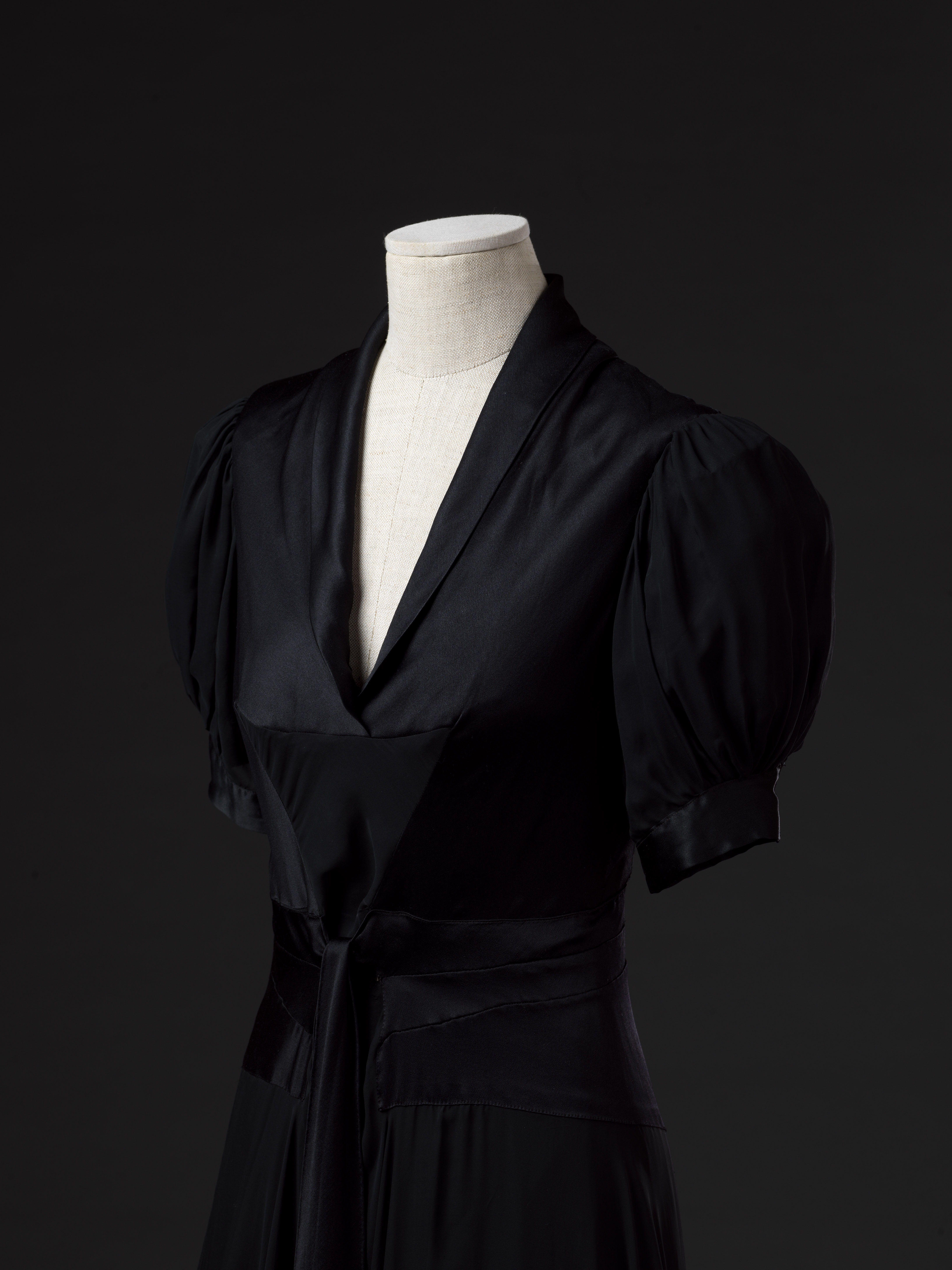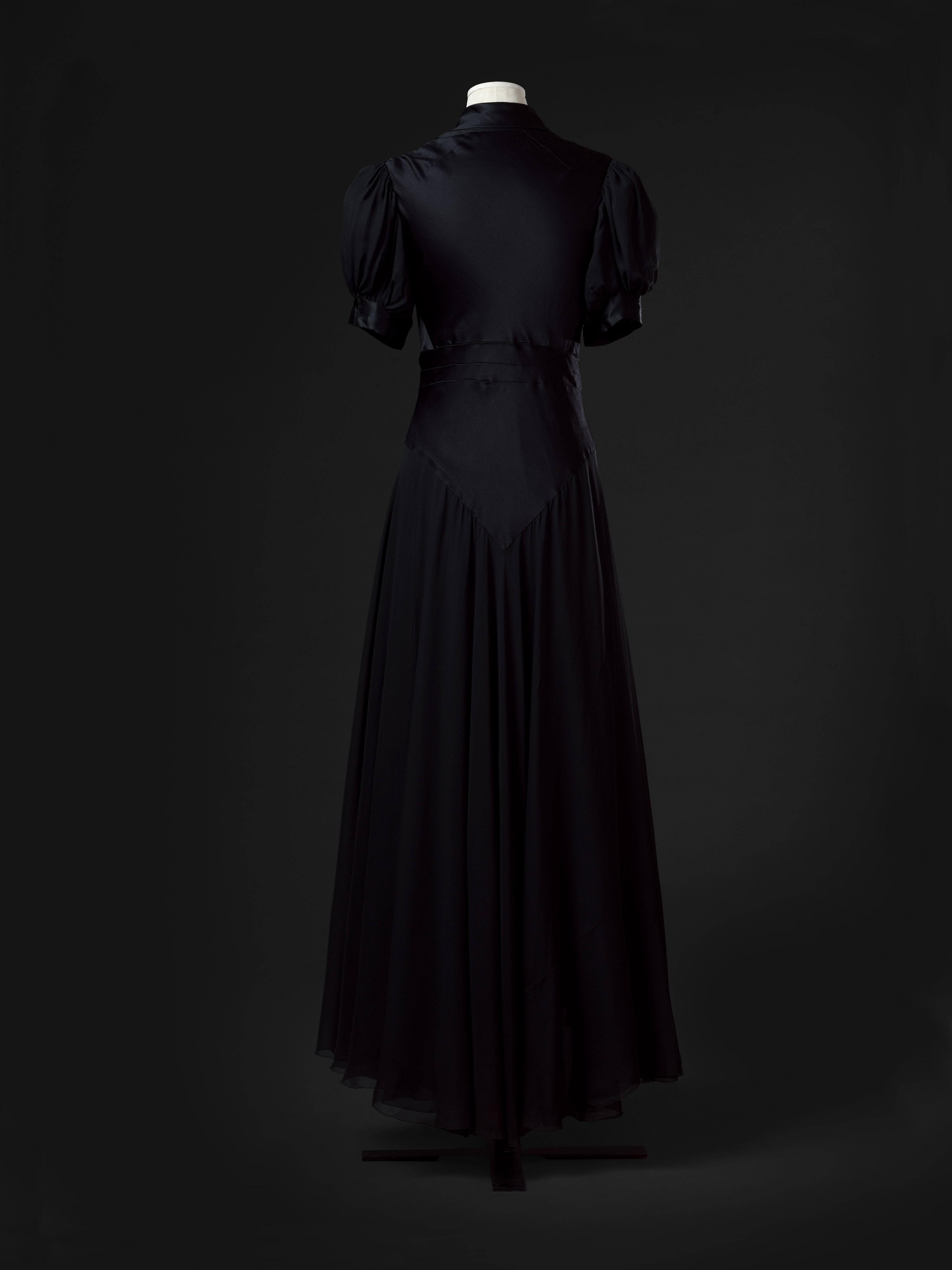Abito lungo in raso e georgette di seta nera, aderente in vita, con scollo a punta e piccoli revers; maniche corte a palloncino in georgette bordato di raso con rigido spallino interno di gros-grain che raccoglie il volume dell'arricciatura alle spalle. Il punto vita è sottolineato da tre pieghe cucite, dalla più alta delle quali parte una fascia da annodare sul davanti. L'ampia gonna è svasata ha tre strati, ciascuno formato da due teli tagliati a tutta ruota in georgette. Nata in una in una famiglia modesta, Madeleine Vionnet (1876-1975) dà vita a un impero sartoriale in Avenue Montaigne che negli anni Trenta conta più di mille lavoranti. La collaborazione con Thayaht, (Ernesto Michaelles 1893-1959) artista e stilista fiorentino autore della Tuta, ha luogo grazie a un lungo soggiorno a Roma della couturier francese, iniziato subito dopo lo scoppio della Grande guerra. Nell'ambito di questo sodalizio Thayaht disegna il logotipo che compare sulle etichette della Maison insieme all'impronta digitale della couturier. L'abito è appartenuto a Margarete Ohmann Armando (1891-1977), cantante lirica di origine berlinese
