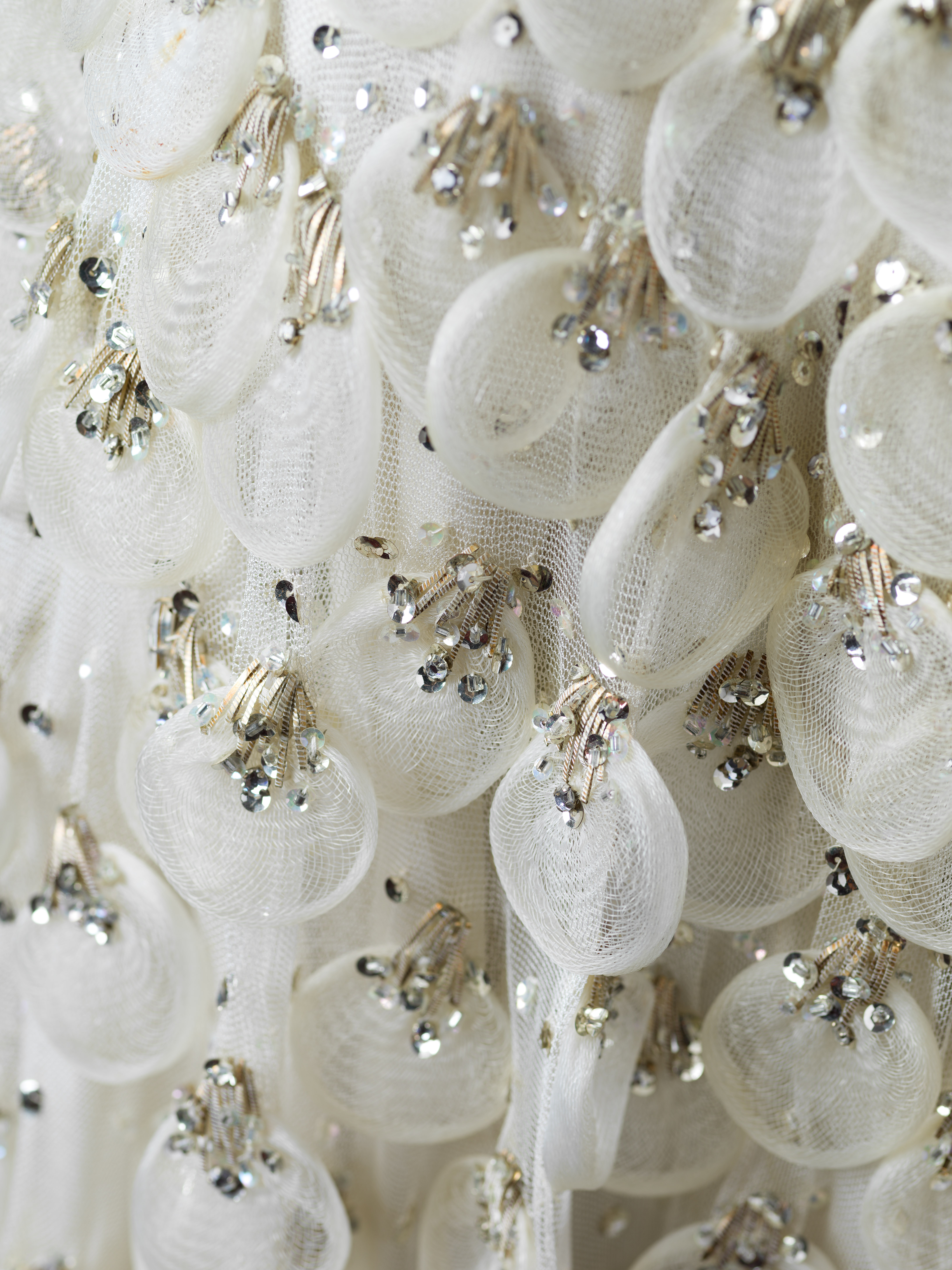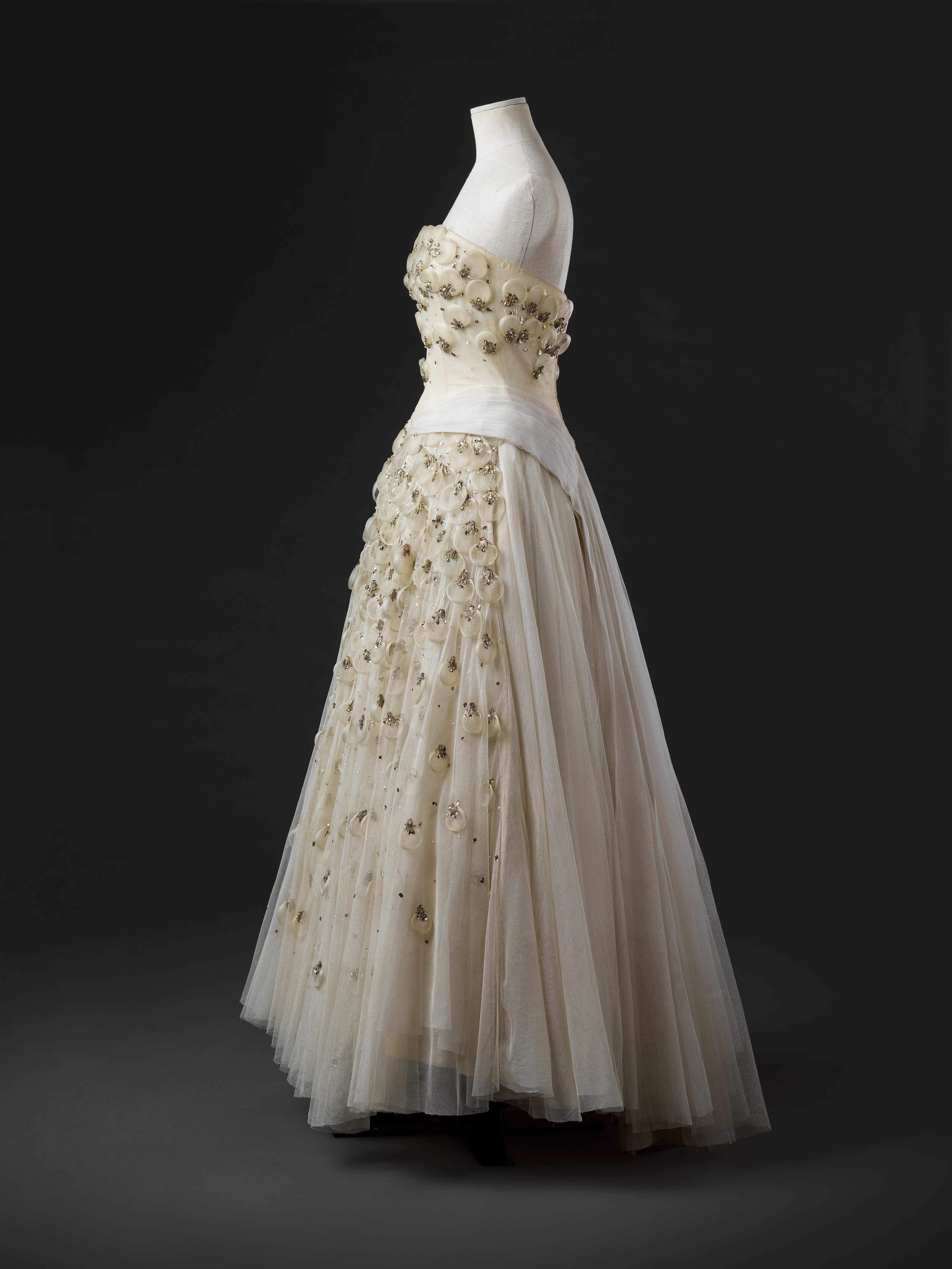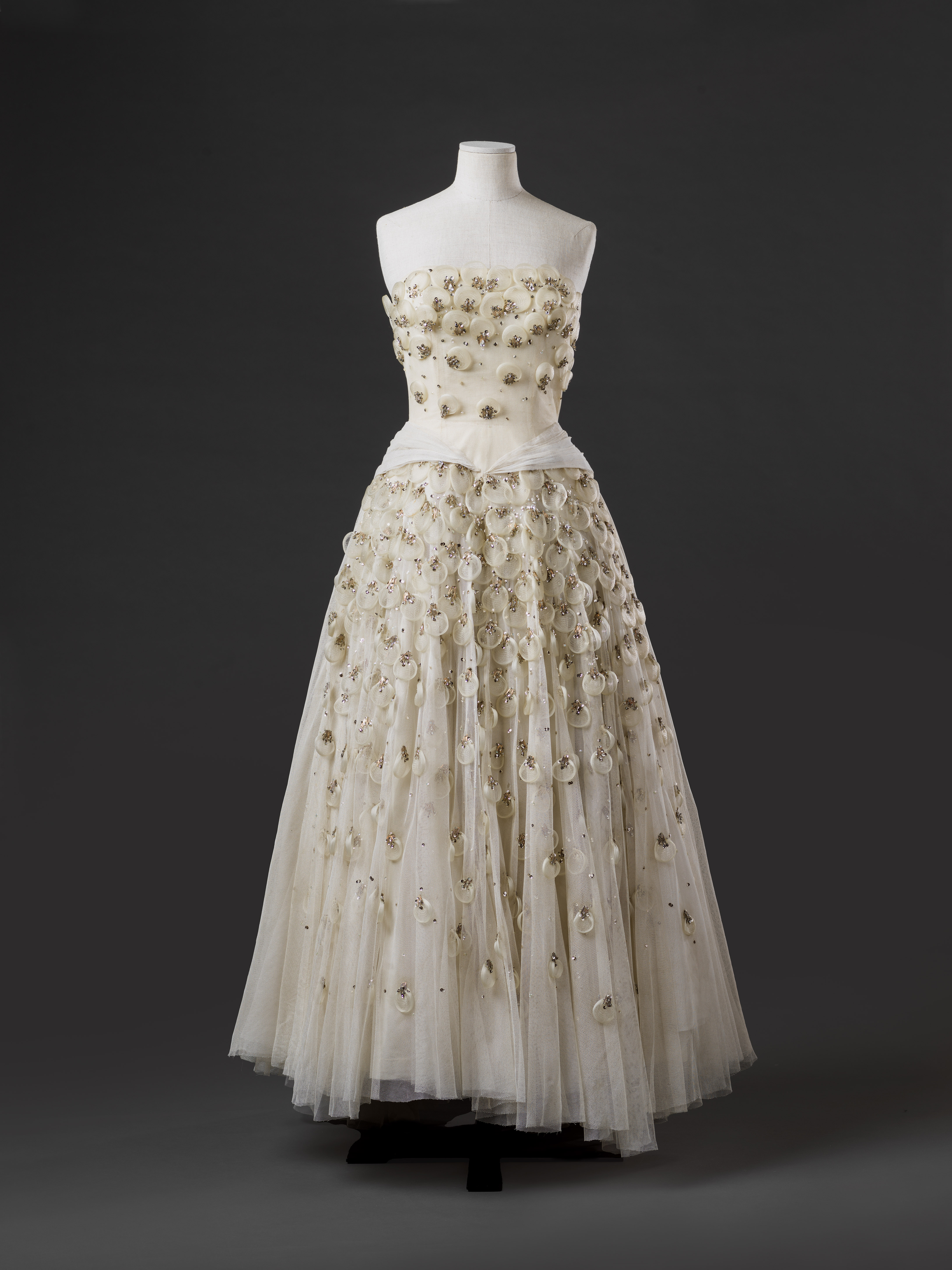 Abito in tulle di nylon bianco con applicazioni ovali in crine, ricamato in laminettes, canutiglia e paillettes. Il capo è desunto da un modello del sarto Jean Desses (1904-70), dell'autunno-inverno 1951-52. Lo stesso modello è stato replicato con delle varianti, negli stessi anni, anche dalla couturier Irene Galitzine.