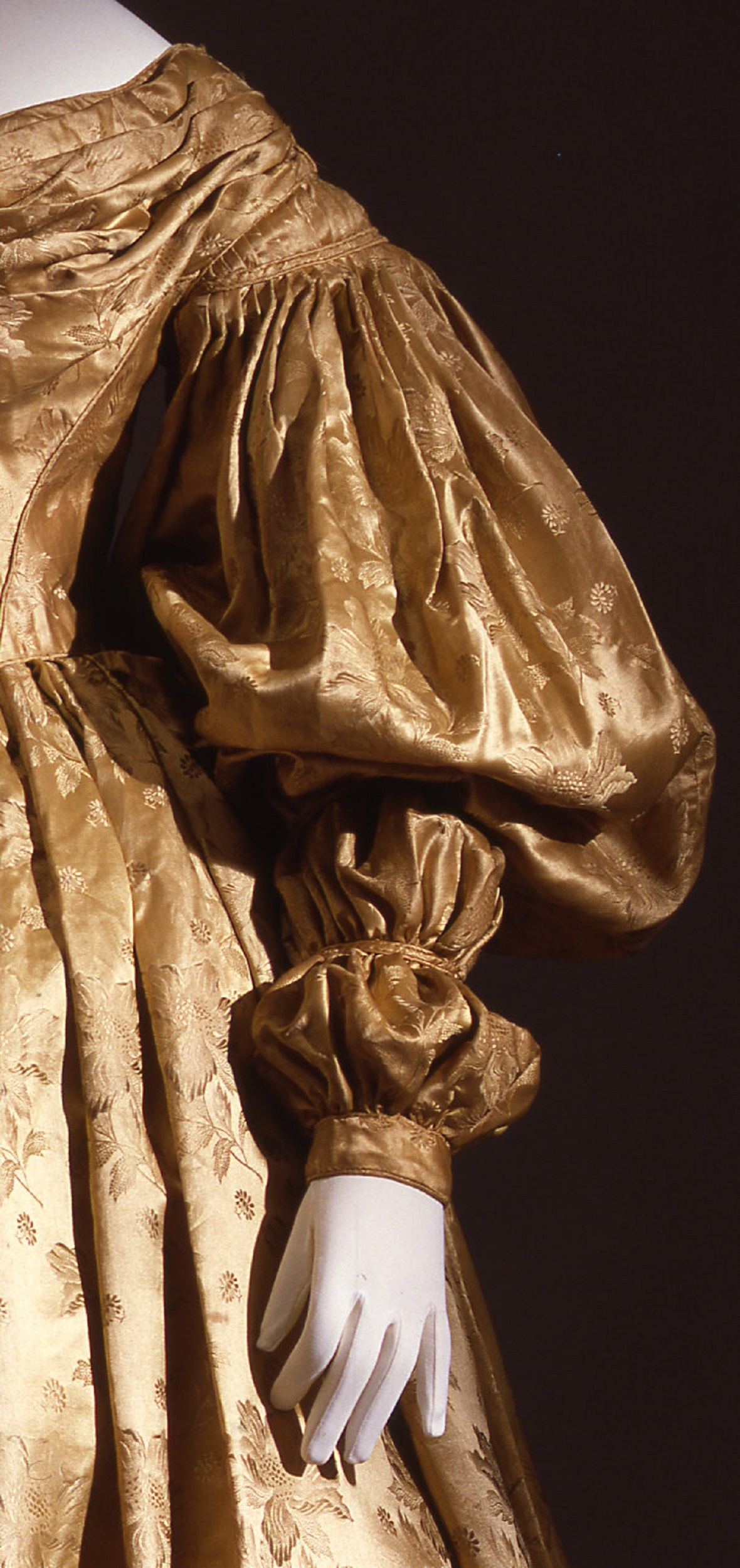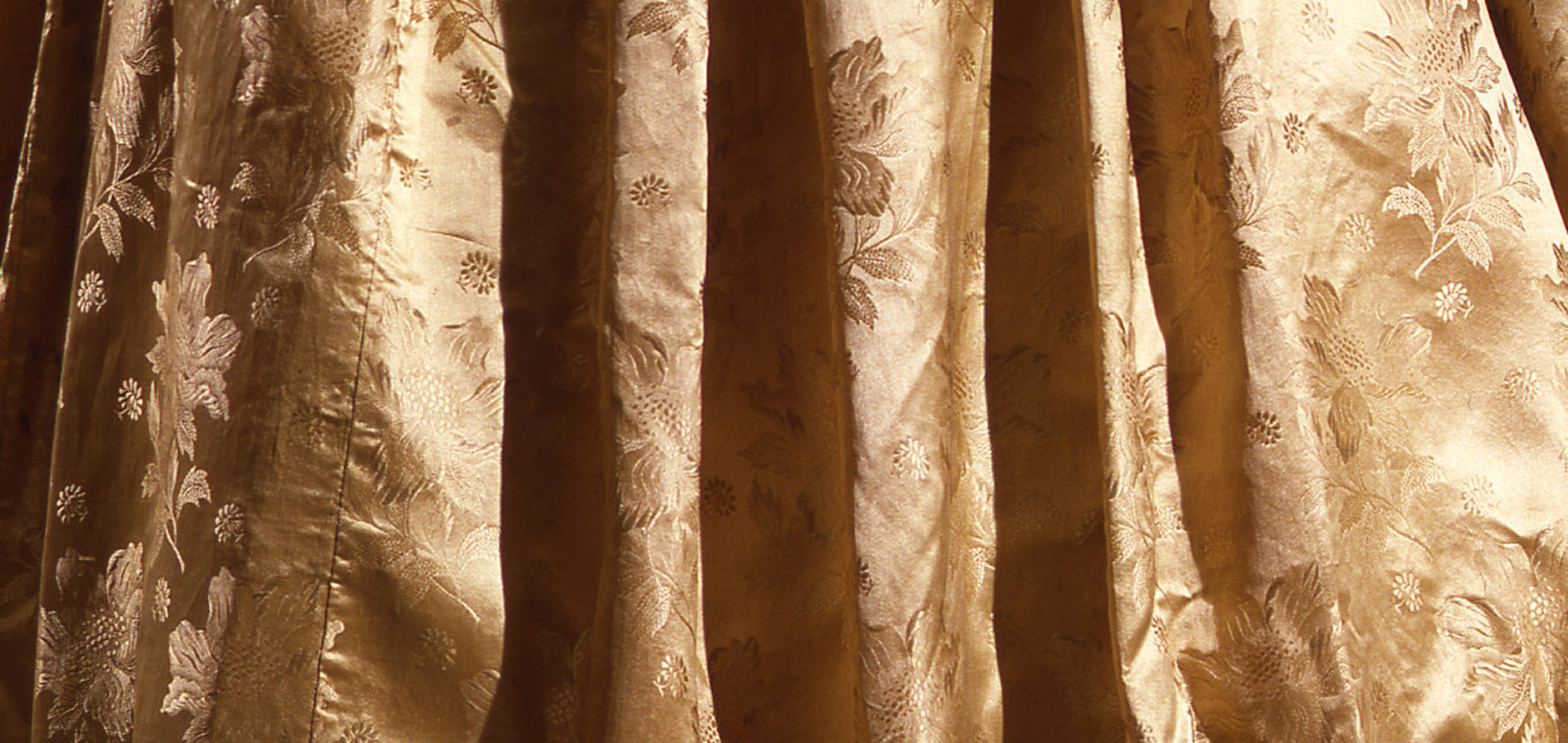 Confezionato in tessuto di seta operato su fondo color oro antico, l’abito è decorato da un motivo floreale a peonie e piccole margherite. Il corpino, di forma trapezoidale, si stringe in corrispondenza della vita seguendo un andamento a freccia; ne ingentiliscono la linea fluenti pieghe che attraversano orizzontalmente l’ampio scollo e si arrestano verso il centro.