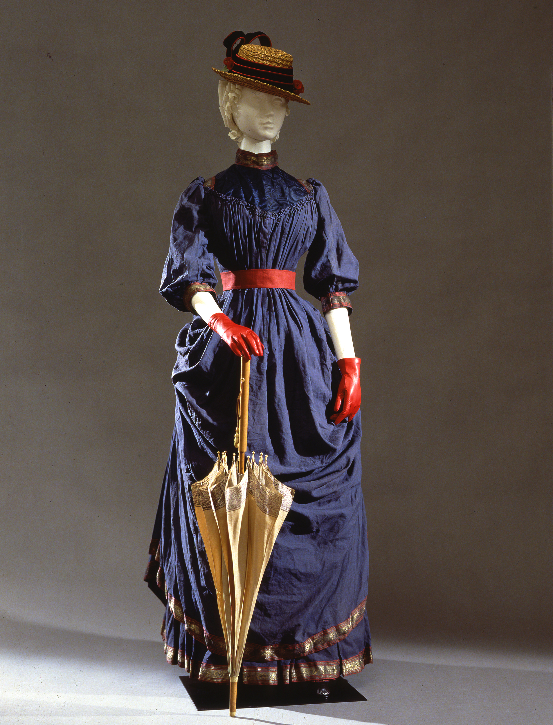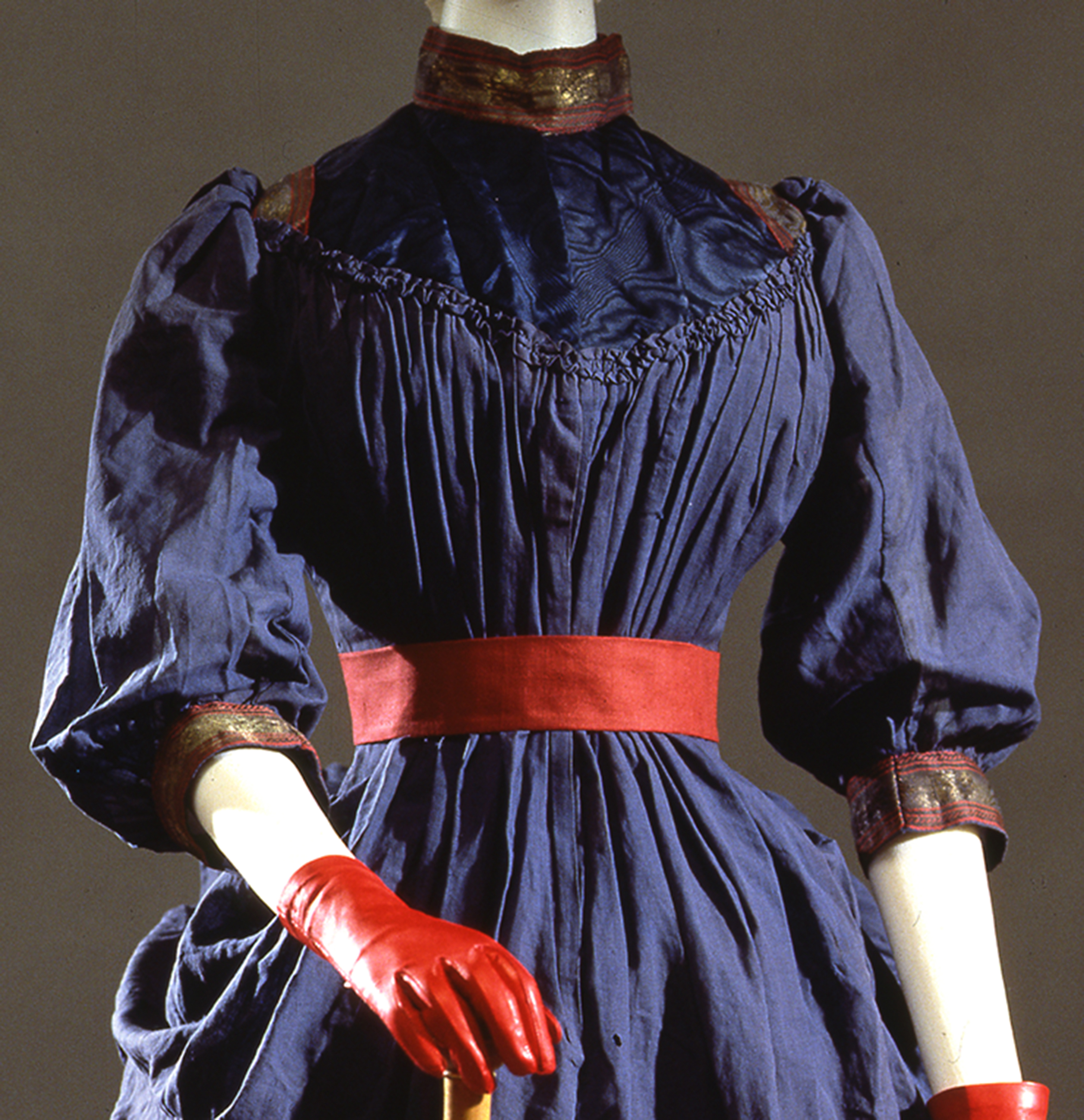 L’abito in esame, destinato sicuramente a un uso diurno, come ci racconta l’alto colletto che nasconde completamente la scollatura, era anche presumibilmente pensato per i soggiorni nei luoghi di villeggiatura. A suggerire questo utilizzo sono il tessuto di cotone tinta unita, adatto ad occasioni informali estive, e i colori blu e rosso, che il gusto della seconda metà dell’Ottocento associava spesso all’abbigliamento da mare o sportivo. Il capo è in mussola di cotone, impreziosita agli orli, ai polsi e al collo da un gallone dorato e rosso, e allo sprone da un inserto in seta marezzata blu. La linea richiama tutti gli stilemi della moda della metà degli anni Ottanta del XIX secolo, dal colletto rigido a cinturino, al corpino arricciato, alla gonna formata da due strati sovrapposti di cui quello superiore drappeggiato in modo asimmetrico. Posteriormente, sotto a gonna e sottogonna, era presente il cul de Paris, ossia un sellino che creava il caratteristico volume.