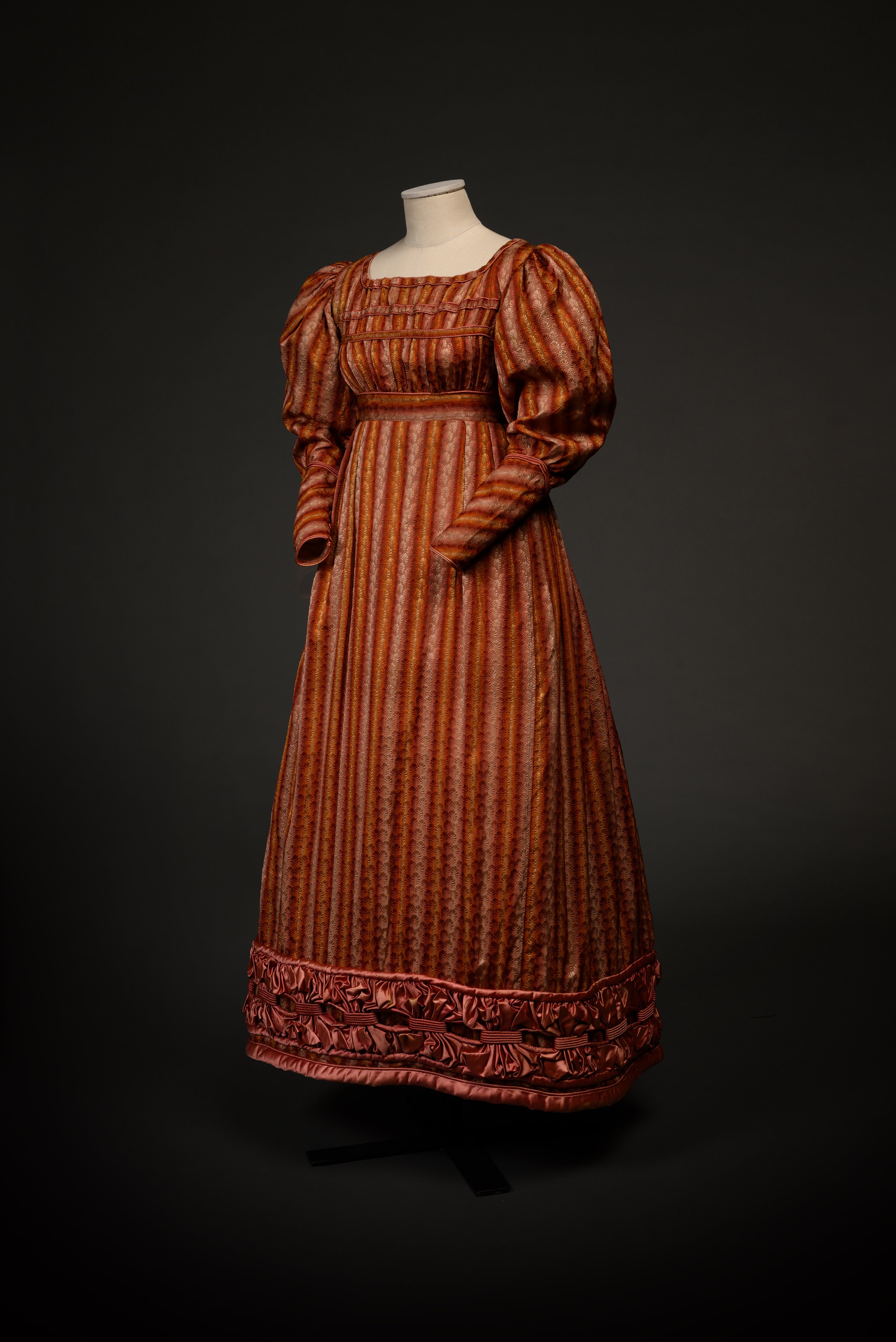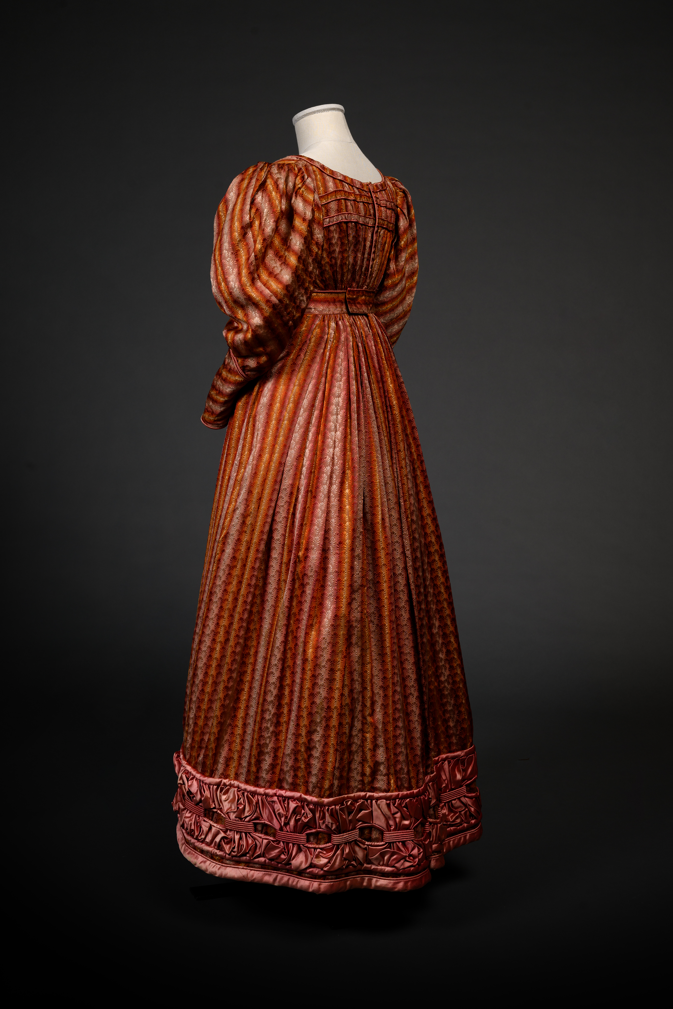 Abito intero realizzato in taffetà di ordito a filo con motivi a strisce e palmette nei toni del cremisi e del giallo. Corpetto con scollatura spalla a spalla arricciata e bordata da un rotolo o burlotto di raso rosa, fermato dietro da un cordone di seta en coulisse. Le maniche a gigot hanno polsini alti e aderenti intrecciati con un cordone di raso in tinta e chiusi da tre bottoni rivestiti. La gonna svasata è impreziosita al fondo da un'ampia fascia composta da larghi nastri paralleli di raso rosa imbottiti, fermati a due a due da passanti in tinta.