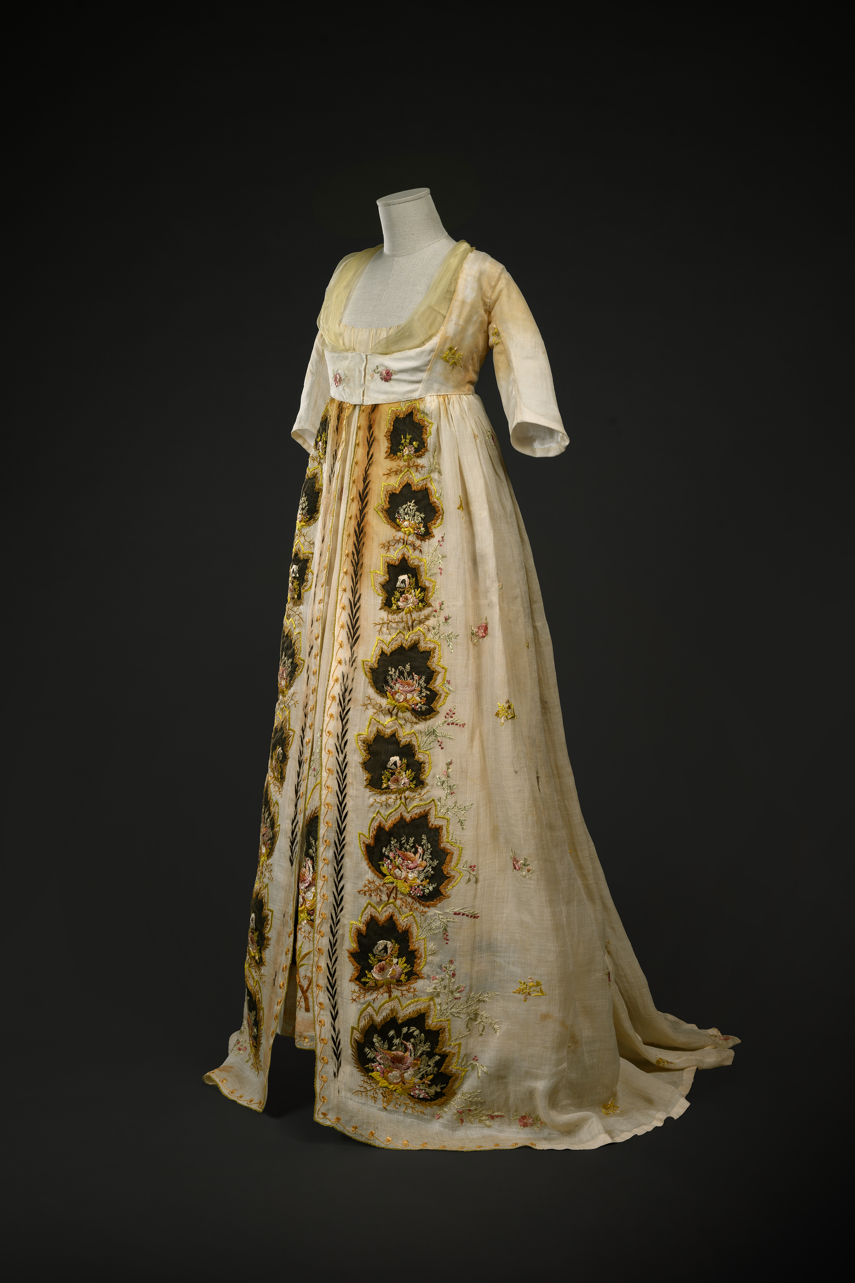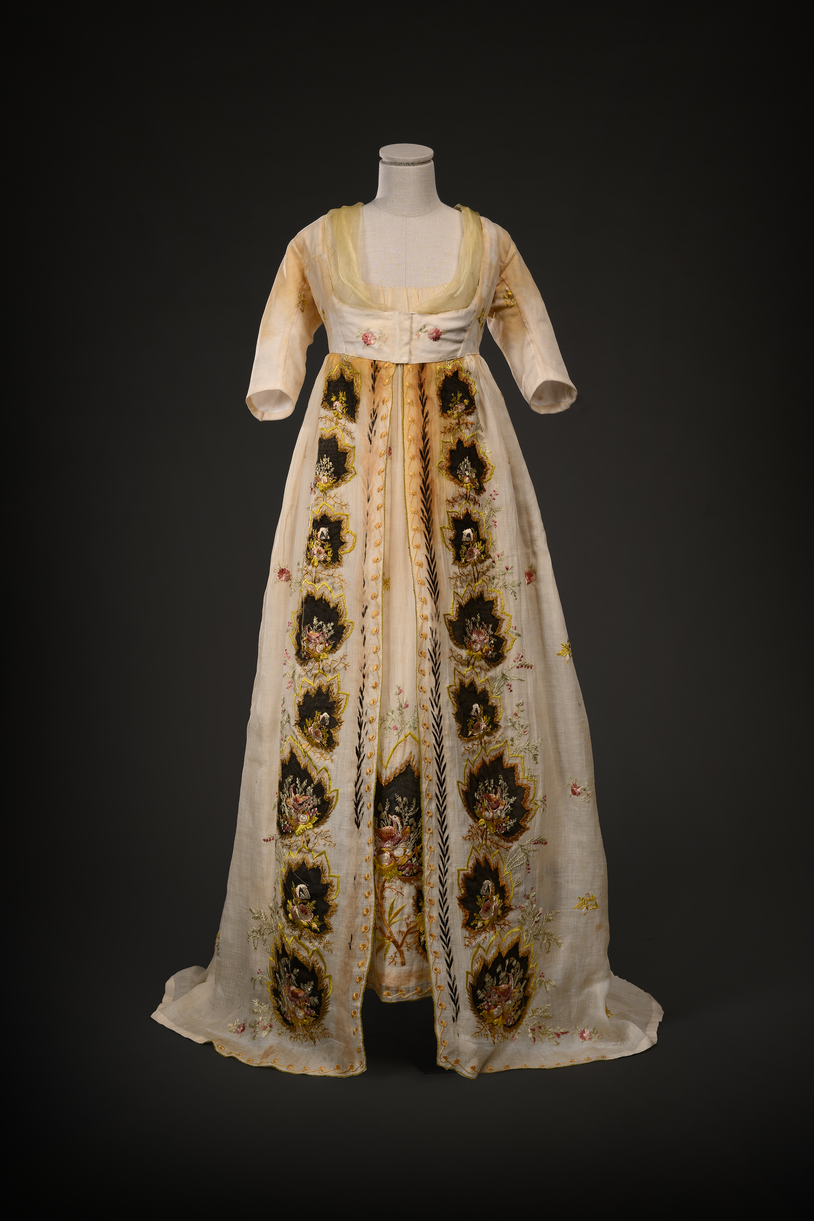L’abito in stile neoclassico in due pezzi, sopravveste e sottana, è realizzato in mussola di cotone, ricamata con fiorellini dai colori pastello su tutta la superficie. Lungo l’apertura, la sopravveste presenta una fila di medaglioni di dimensioni decrescenti verso l’alto, ricamati su fondo in tulle nero con motivi di fiori e uccelli realizzati in sete policrome. Un analogo decoro a medaglioni orna il sottanino. Lungo il bordo dell’abito vi sono due file di ricami a tralci di fiorellini e foglie. L’abito è stato visibilmente modificato nella parte superiore.