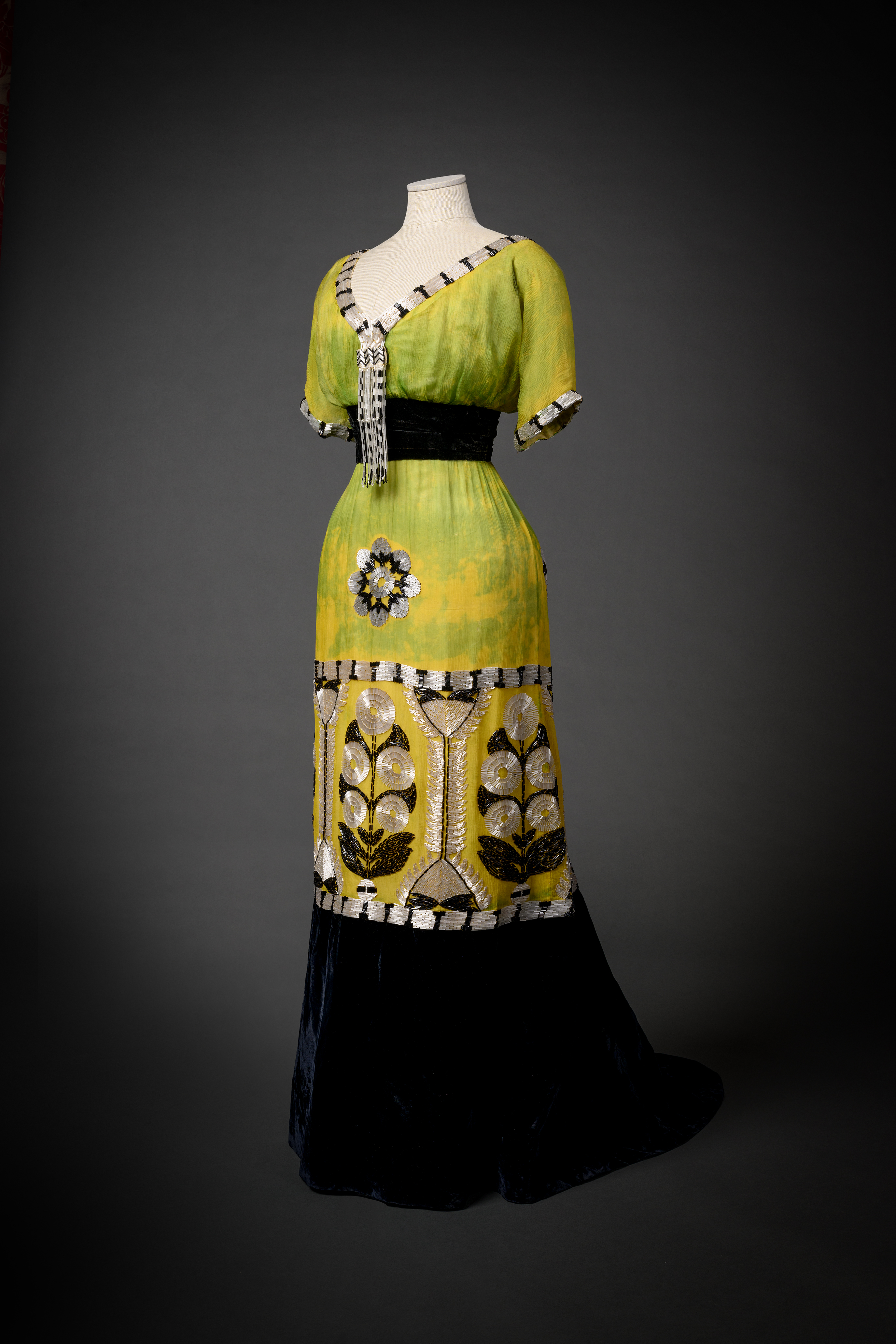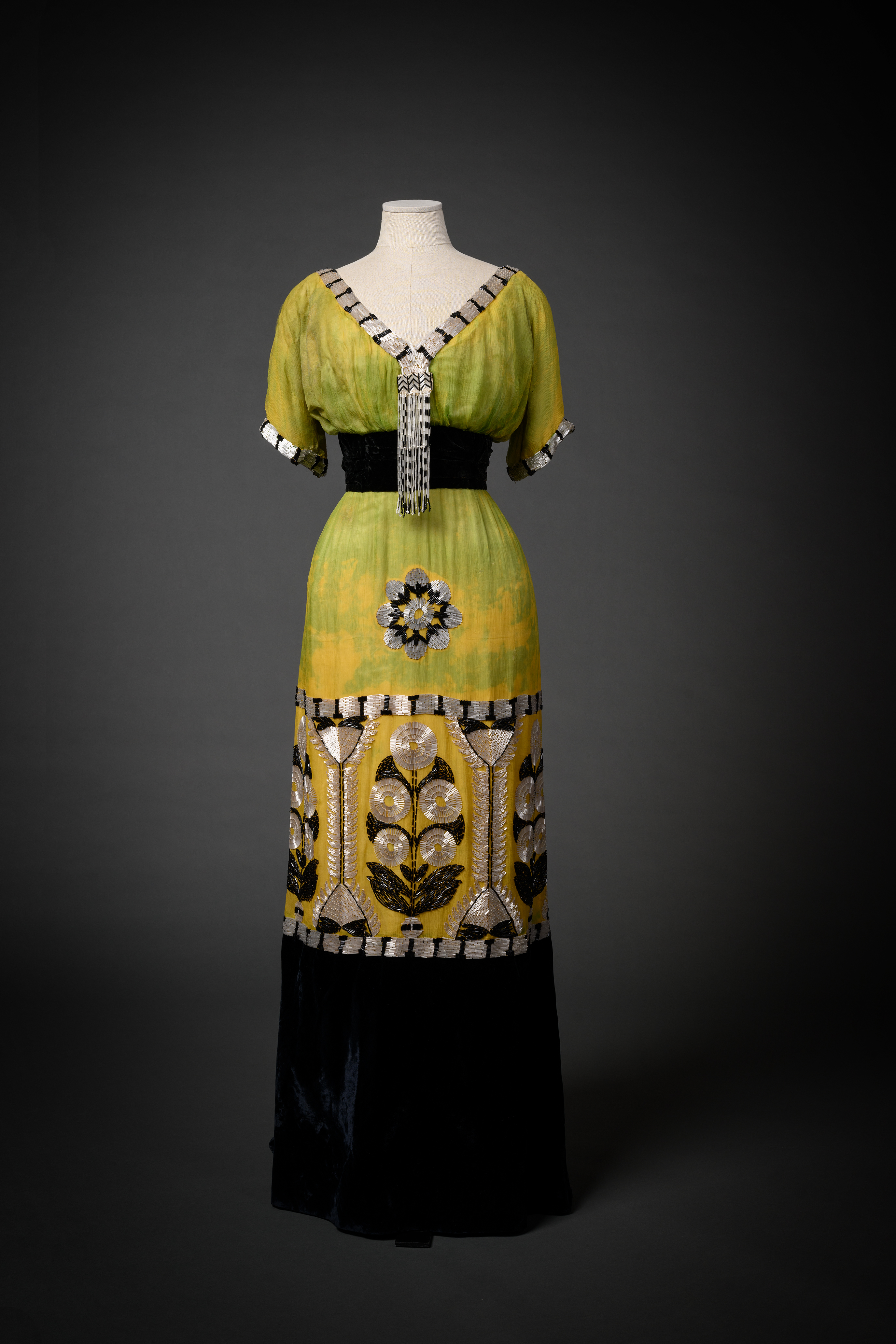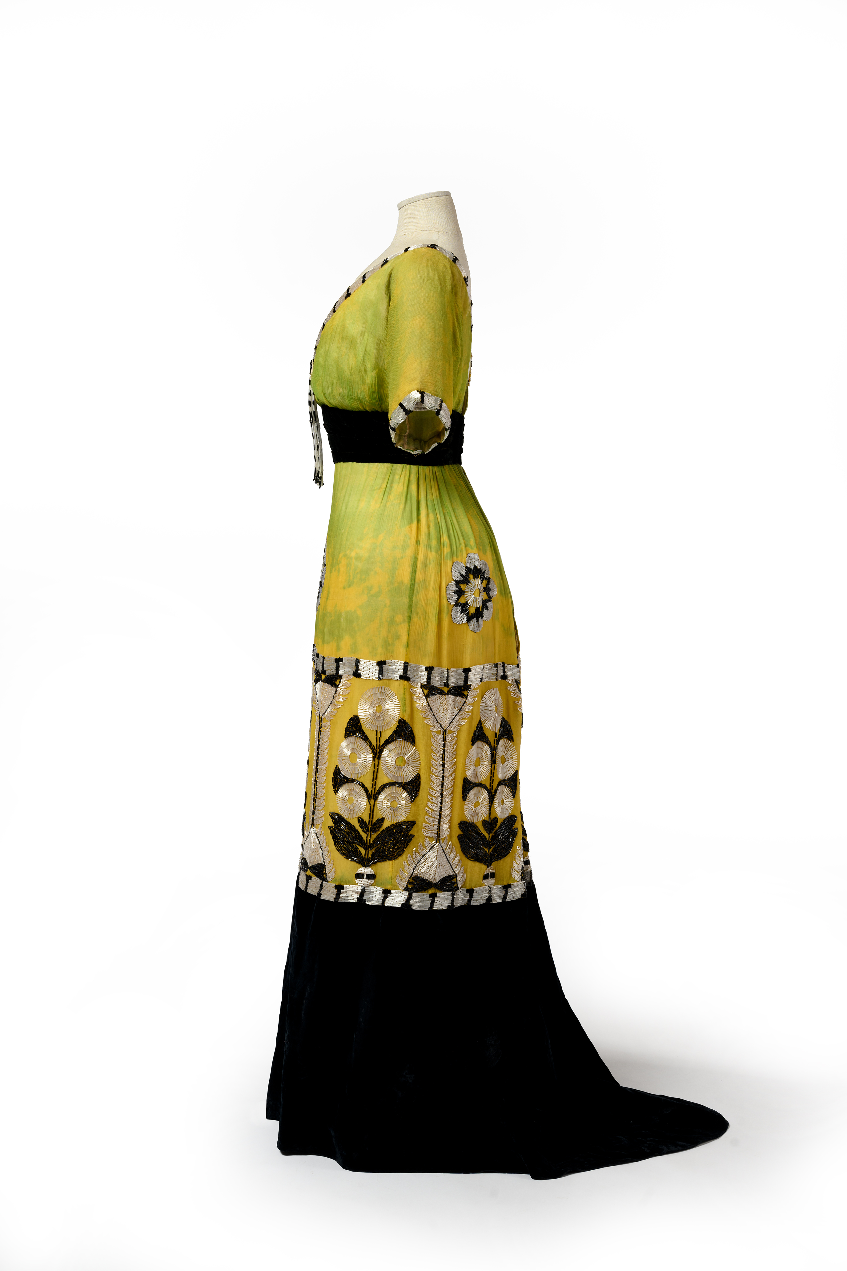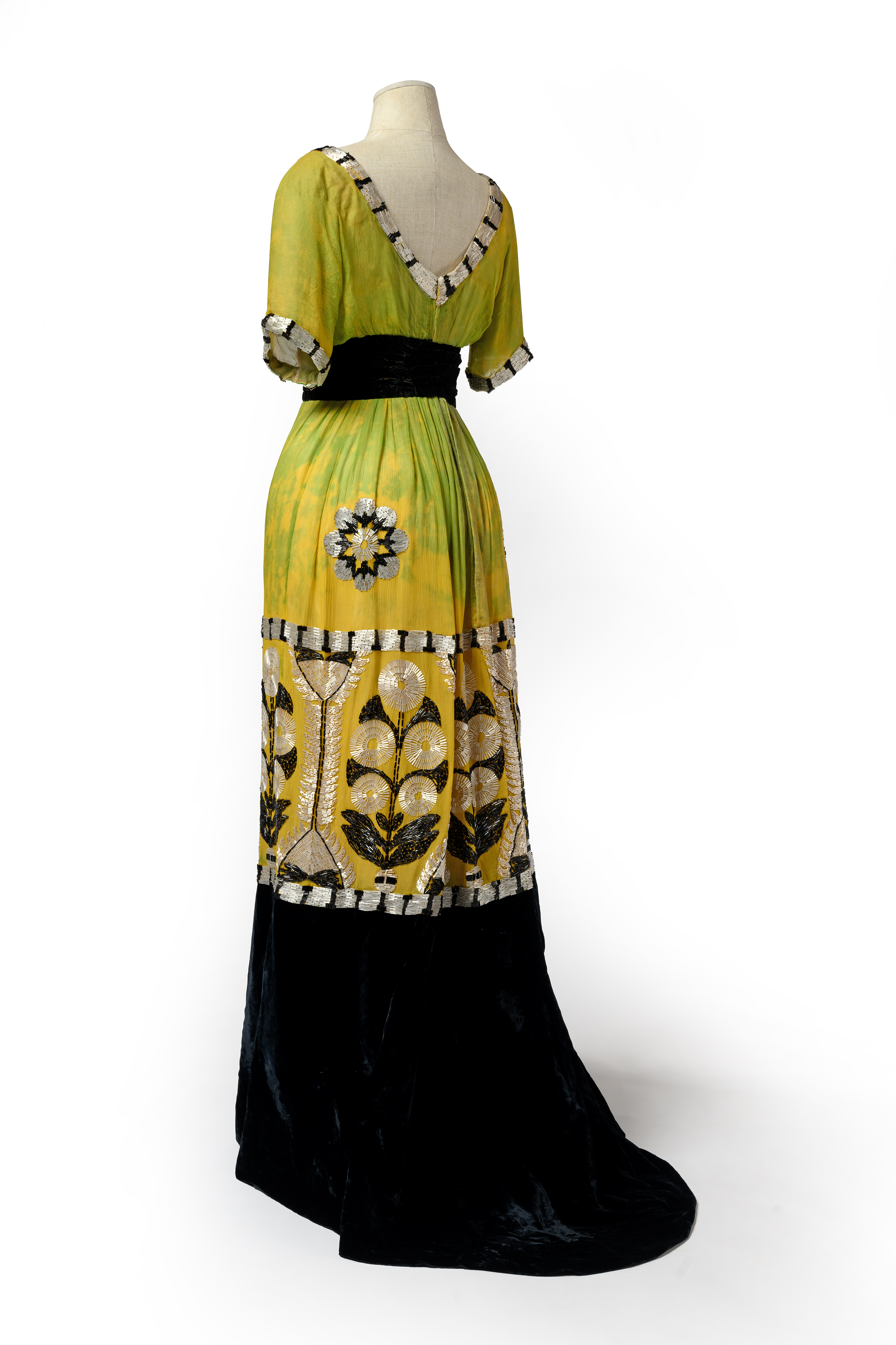 Abito in chiffon di seta con tintura nelle tonalità del verde e del giallo. Il profondo scollo a V è profilato da una decorazione-gioiello di perline e cannucce di vetro bianche e nere che scende dal petto sino alla vita. Le maniche corte sono decorate all’orlo dallo stesso motivo di perline e cannucce. Il punto vita è segnato da un’alta fascia di velluto di seta nero. La gonna, leggermente svasata, più lunga sul retro a formare un accenno di strascico, è preziosamente decorata con un motivo geometrico a stilizzazioni fitomorfe di grandi