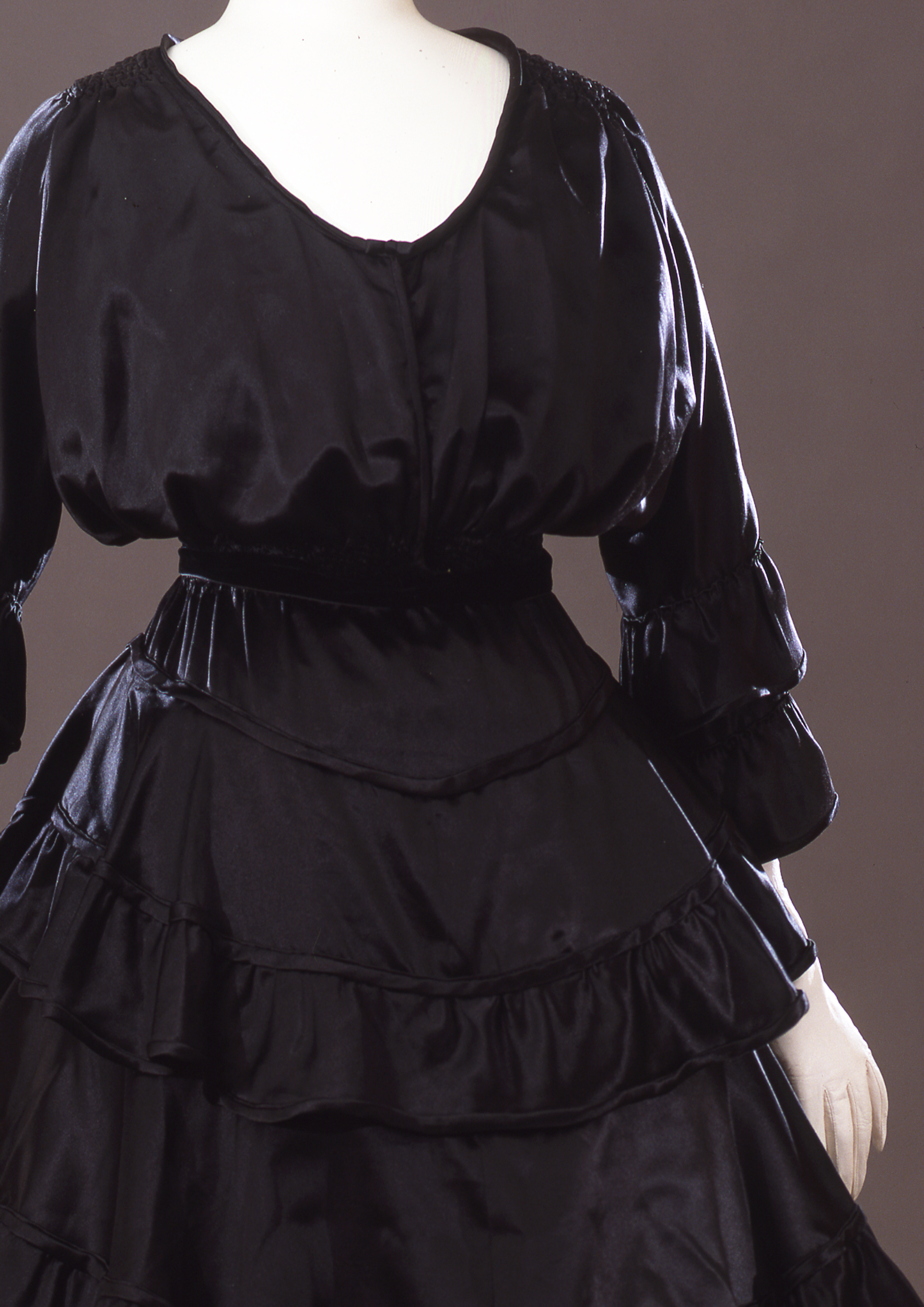Quest’abito, pur non essendo destinato al lavoro come suggerisce il tessuto prezioso, incarna perfettamente questi dettami. Il corpino è blusante, fittamente arricciato sulle spalle, ampiamente scollato e con maniche lunghe e svasate, ed è allacciato sul davanti da gancetti metallici. È un capo facile da indossare e da portare. La gonna a balze, ornata da tre volant arricciati nello stesso tessuto, è larga e si ferma ben sopra alle caviglie, permettendo di camminare agilmente e senza impacci. Anche la scelta del colore è figlia degli anni della guerra, che fece propendere per tonalità scure e sobrie, più pratiche e maggiormente adatte ad una vita più attiva.