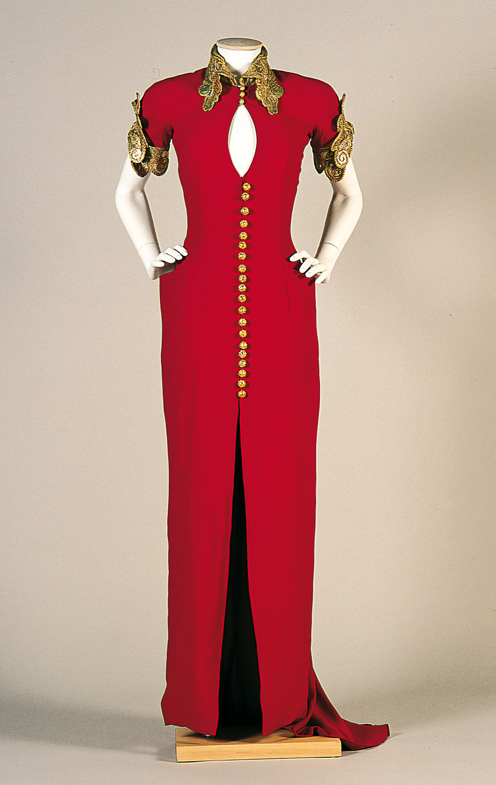 Abito con maniche corte di linea aderente. Spalle ampie tipicamente anni’80, colletto e maniche realizzate in tulle con applicazione di passamaneria dorata. Apertura sulla schiena; all’altezza del seno partono venti piccole sfere a bottoncino in filatura dorata. Spacco centrale che forma piccola coda posteriormente.
