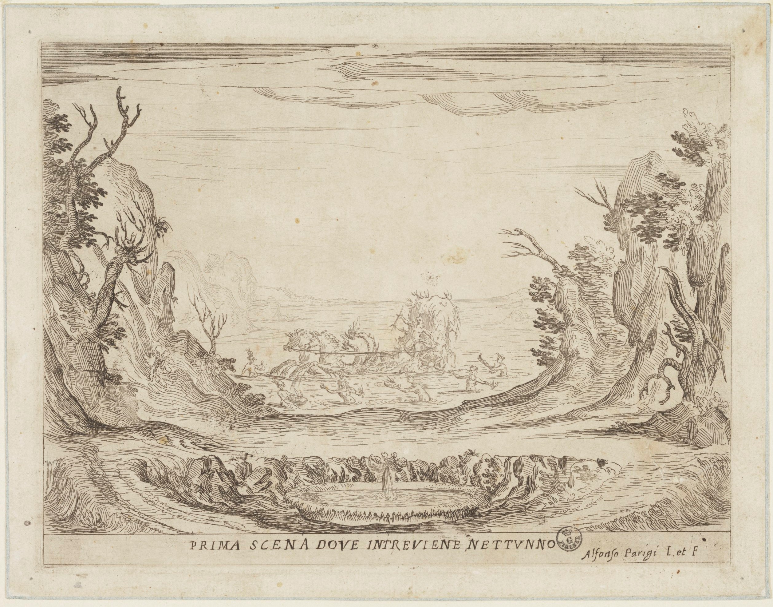 Iscrizioni: titolo “Prima scena dove intreviene Nettunno”, in basso a destra “Alfonso Parigi I. et F.”