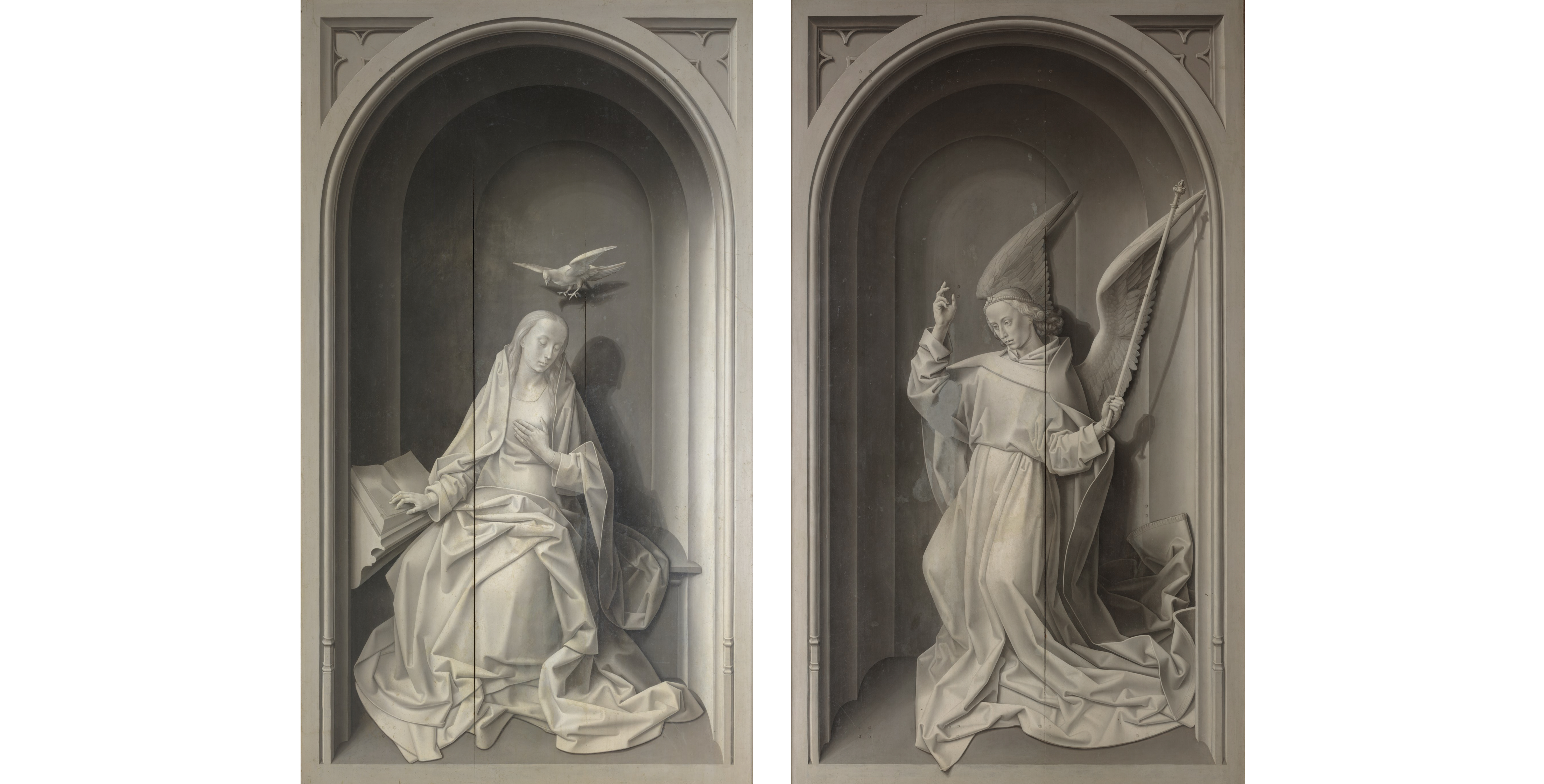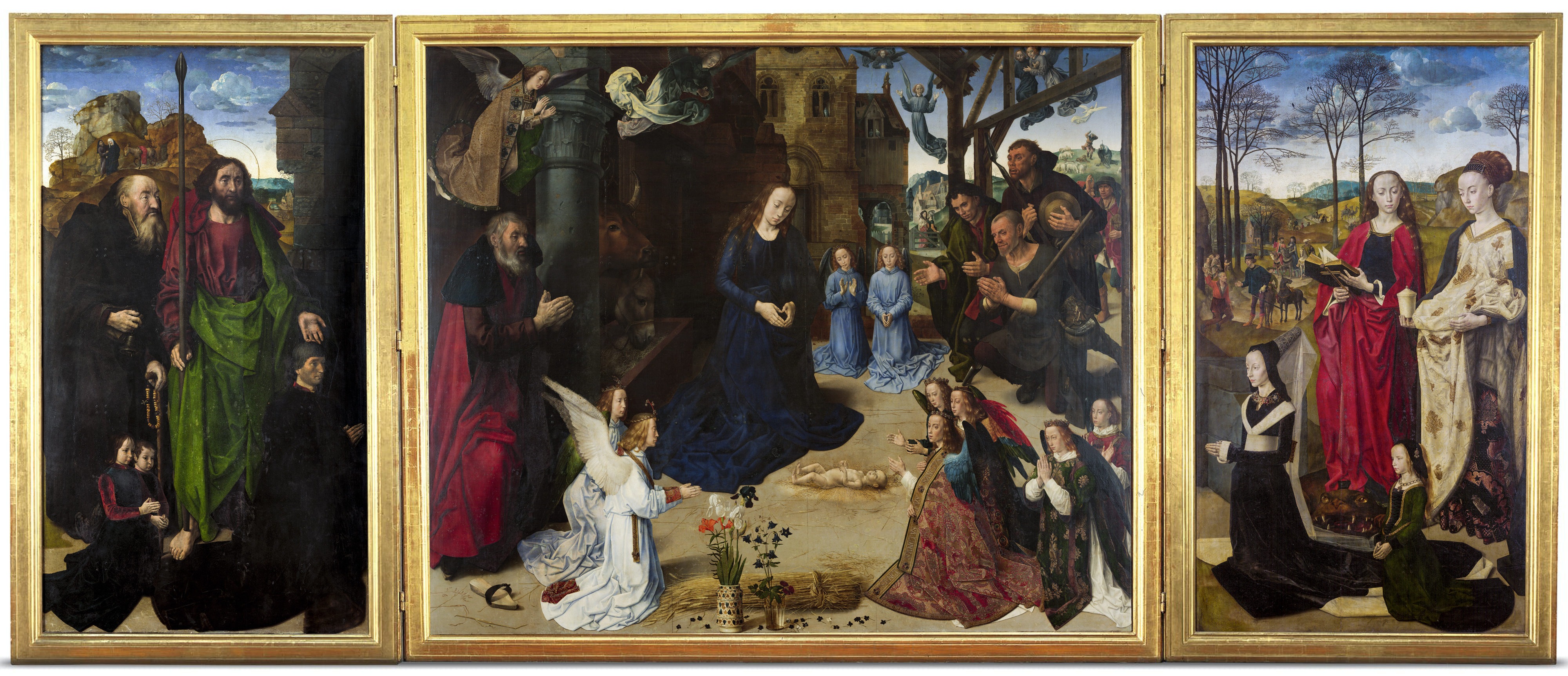Gesù bambino giace a terra circondato da raggi luminosi che lo denotano come Luce del mondo. Intorno stanno in adorazione la madre Maria, il padre putativo Giuseppe, alcuni angeli e i pastori. In secondo piano, inserito nel paesaggio è raffigurato il momento, precedente a questo nella sequenza narrativa, ovvero l’angelo che annuncia la nascita del Salvatore. La continuità dello sfondo paesaggistico annulla la divisione fra figurazione centrale e ante laterali, dove la famiglia committente è rappresentata in preghiera sotto la protezione di quattro santi. A sinistra l’apostolo Tommaso e Sant’Antonio abate presentano il capofamiglia Tommaso Portinari e i suoi figli Antonio e Pigello, mentre a destra le sante Margherita, vittoriosa sul drago che l’aveva inghiottita, e Maria Maddalena, con il vaso di unguenti, proteggono Maria Baroncelli Portinari e la figlia Margherita. La differenza di proporzioni fra santi e committenti rispecchia la gerarchia di importanza. Originario di Firenze, Tommaso Portinari (1428-1501) visse per molti anni a Bruges dove era agente del banco dei Medici, sposando nel 1470 Maria Baroncelli, anch’essa cittadina fiorentina; la famiglia si fa ritrarre con vesti e acconciature che rispecchiano la moda fiamminga dell’epoca. Durante il periodo trascorso nelle Fiandre, Tommaso Portinari commissionò al pittore fiammingo Hugo van der Goes il trittico con l’Adorazione dei Pastori, destinato alla cappella di famiglia nella chiesa di Sant’Egidio nell’ospedale di Santa Maria Nuova a Firenze. L’arrivo a Firenze del dipinto, nel 1483, giunto prima a Pisa via mare, fu un vero avvenimento e l’opera apparve straordinariamente innovativa agli occhi dei pittori fiorentini, che ne apprezzarono soprattutto la verosimiglianza raggiunta nella resa degli oggetti, del paesaggio e delle fisionomie. Stupefacente è la natura morta in primo piano al centro, ricca di contenuti simbolici: l’iris bianco e il lilium rosso alludono alla purezza e al sangue di Cristo versato nella Passione, l’aquilegia viola preannuncia il dolore della Vergine, i garofani simboleggiano la Trinità. Quando era chiuso, il trittico mostrava la raffigurazione dell’Annunciazione, dipinta a monocromo sul verso delle ante.