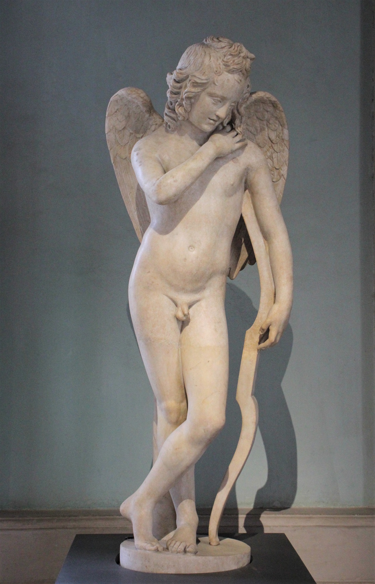 L’opera condivide con altre statue raffiguranti putti ed amorini, esposte a più riprese nella Tribuna, la provenienza da Palazzo Pitti, dove è ricordata dagli inizi del XVII secolo nella Sala Bianca. Giunta in Galleria nel XIX sec. la scultura fu collocata nella sala dell’Ermafrodito e successivamente nel Secondo Corridoio. Oggi il marmo è esposto, con altre celebri opere, nella maestosa Tribuna. La statua, raffigurante in origine un genio funerario appoggiato ad una torcia rovesciata, fu trasformata dal restauratore Innocenzo Spinazzi (1726-1798) in un Cupido con arco. I geni funerari, spiriti tutelari delle famiglie e degli individui nella religione romana, erano rappresentati sia in scultura che in pittura (celebri gli affreschi pompeiani). La raffigurazione, frequente in antico, del genio in forma di divinità fanciulla alata indusse lo Spinazzi a mutare il soggetto originale in Cupido, allegoria del dio Eros. La lavorazione della chioma, caratterizzata da un contenuto ricorso al trapano corrente, induce a datare l'opera alla tarda età adrianea.