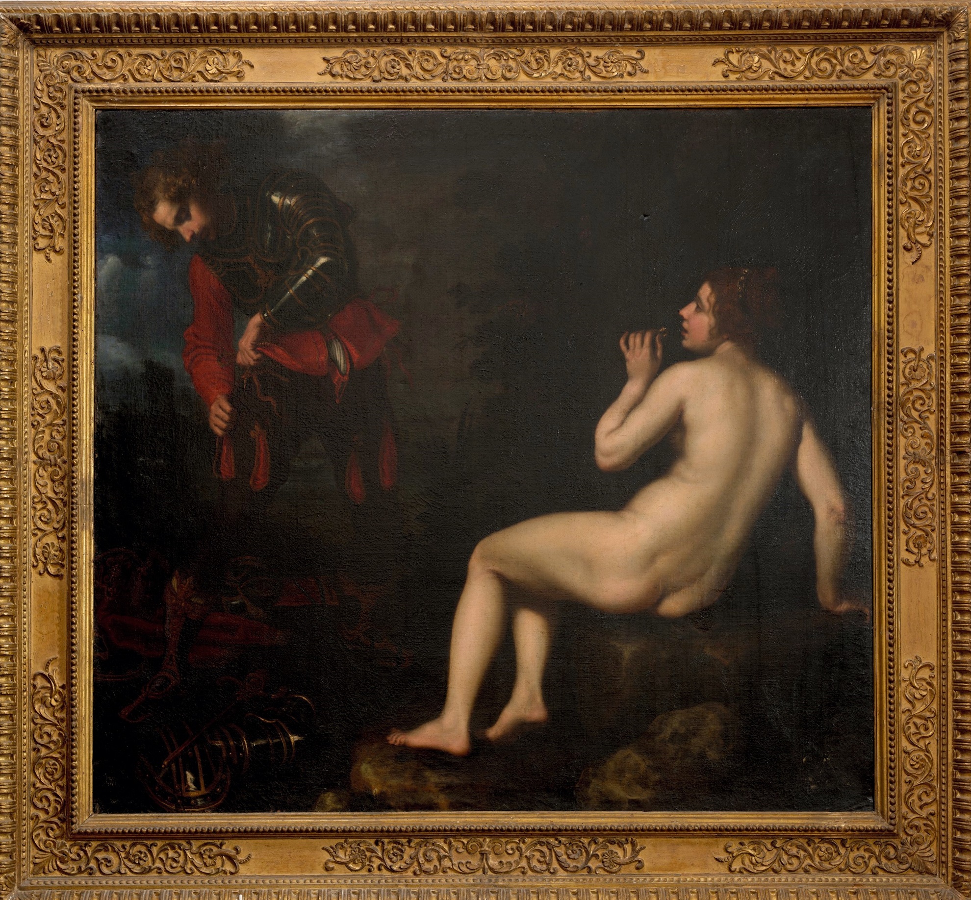 La tela espone un episodio tra i più amati e riprodotti dell’Orlando Furioso, narrato tra la fine del X e l’inizio dell’XI canto. La scena si svolge nel “boschetto di querce ombrose” affacciato sulla riva del mare di Bretagna dove Ruggiero decide si sostare dopo aver liberato Angelica dall’orribile orca, rinunciando così al progettato ritorno in Spagna. Pur avendo scampato le tentazioni accadutegli sull’isola di Alcina, Ruggiero nulla può contro la passione amorosa per la fanciulla, sbocciata fulmineamente, nel tempo di un solo sguardo alle sue grazie e ai suoi occhi (Ruggier si va volgendo, e mille baci/figge nel petto e negli occhi vivaci). Vinto dal desiderio, decide di possedere Angelica e così nel finale del canto tre versi memorabili fissano in un irresistibile crescendo comico il susseguirsi di emozioni del maldestro Ruggiero che, tentando di denudarsi, combina un pasticcio dopo l’altro: Confusamente l’arme si levava/Non gli parve altra volta mai star tanto/Che s’un laccio sciogliea, dui n’annodava.
