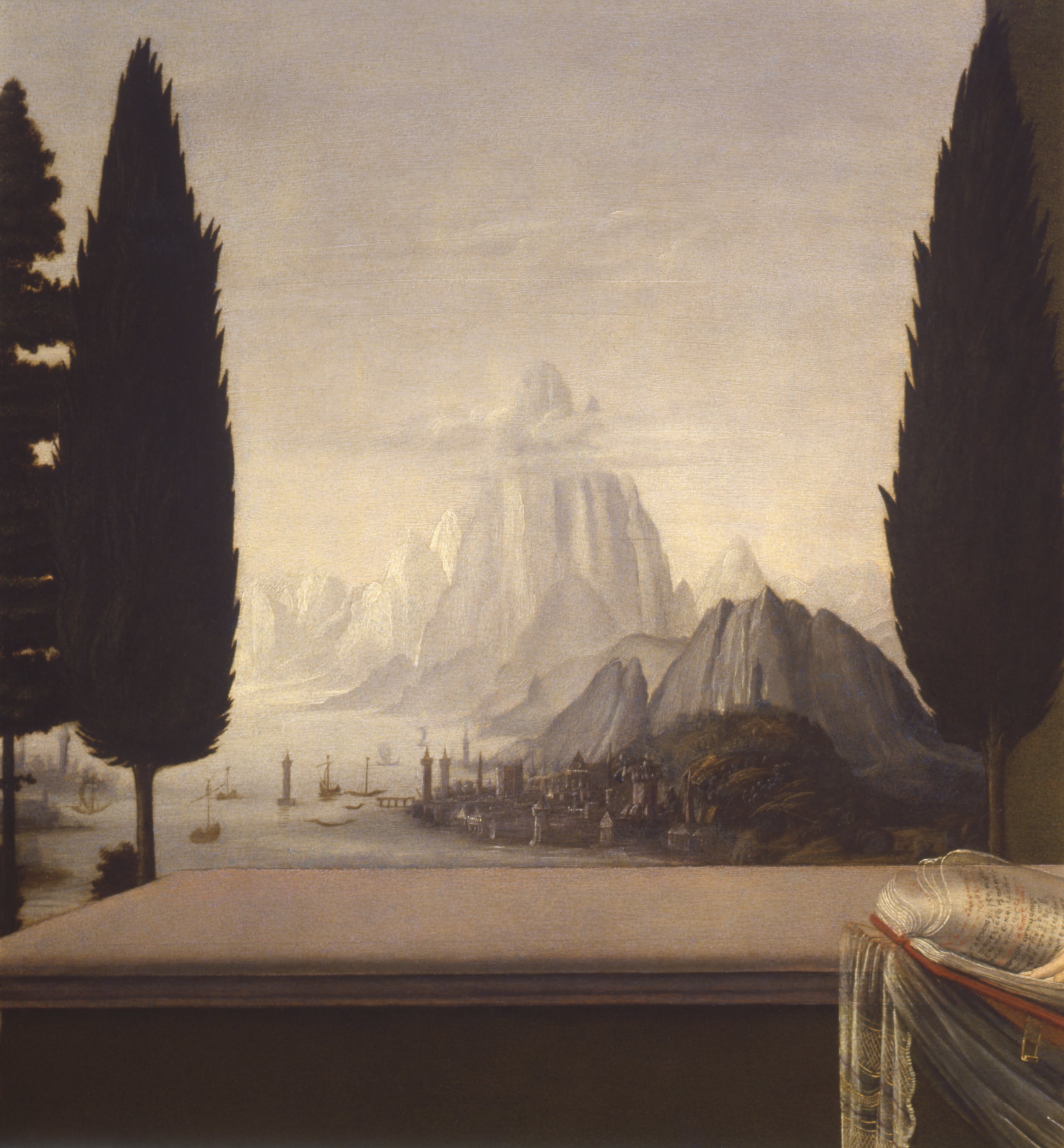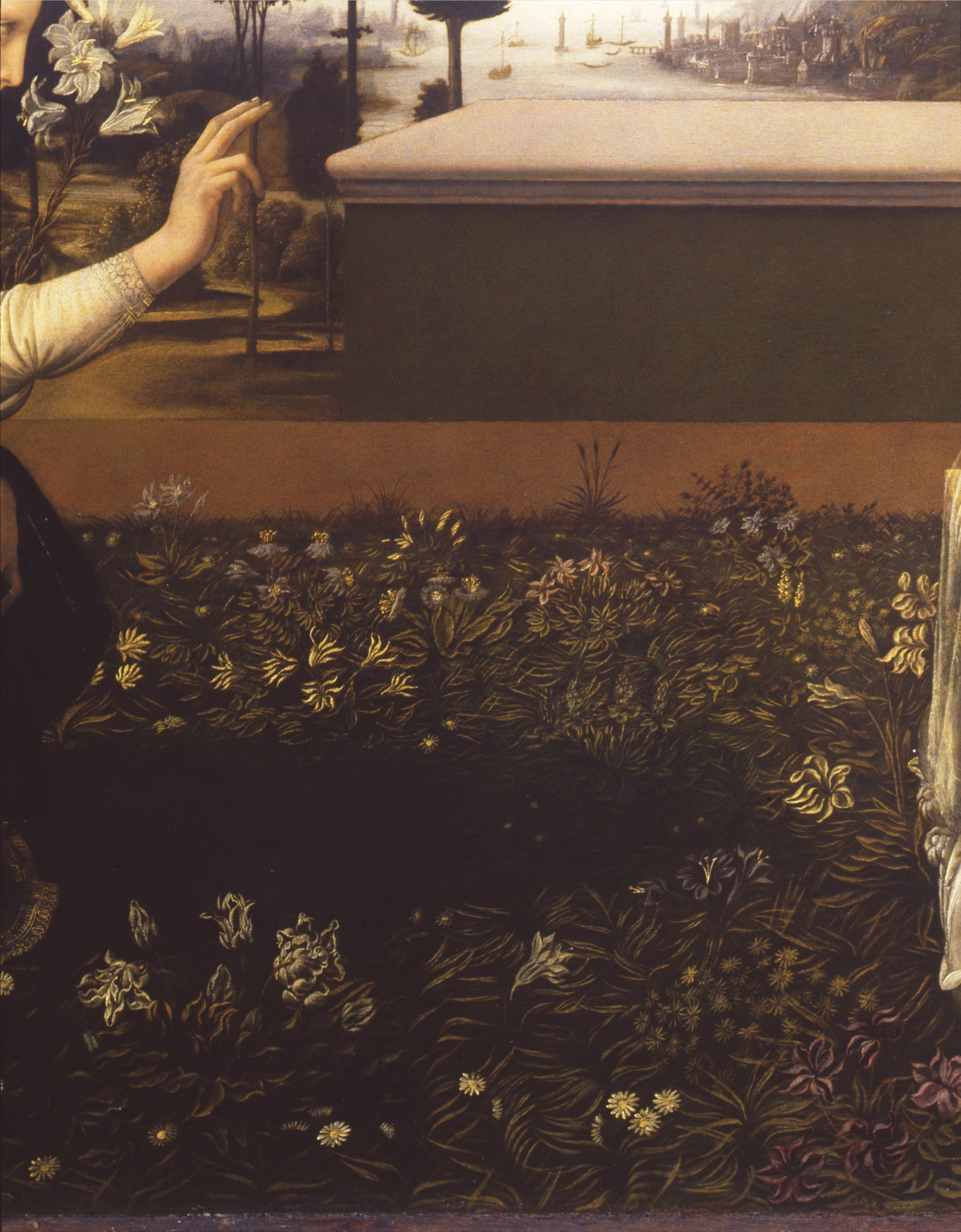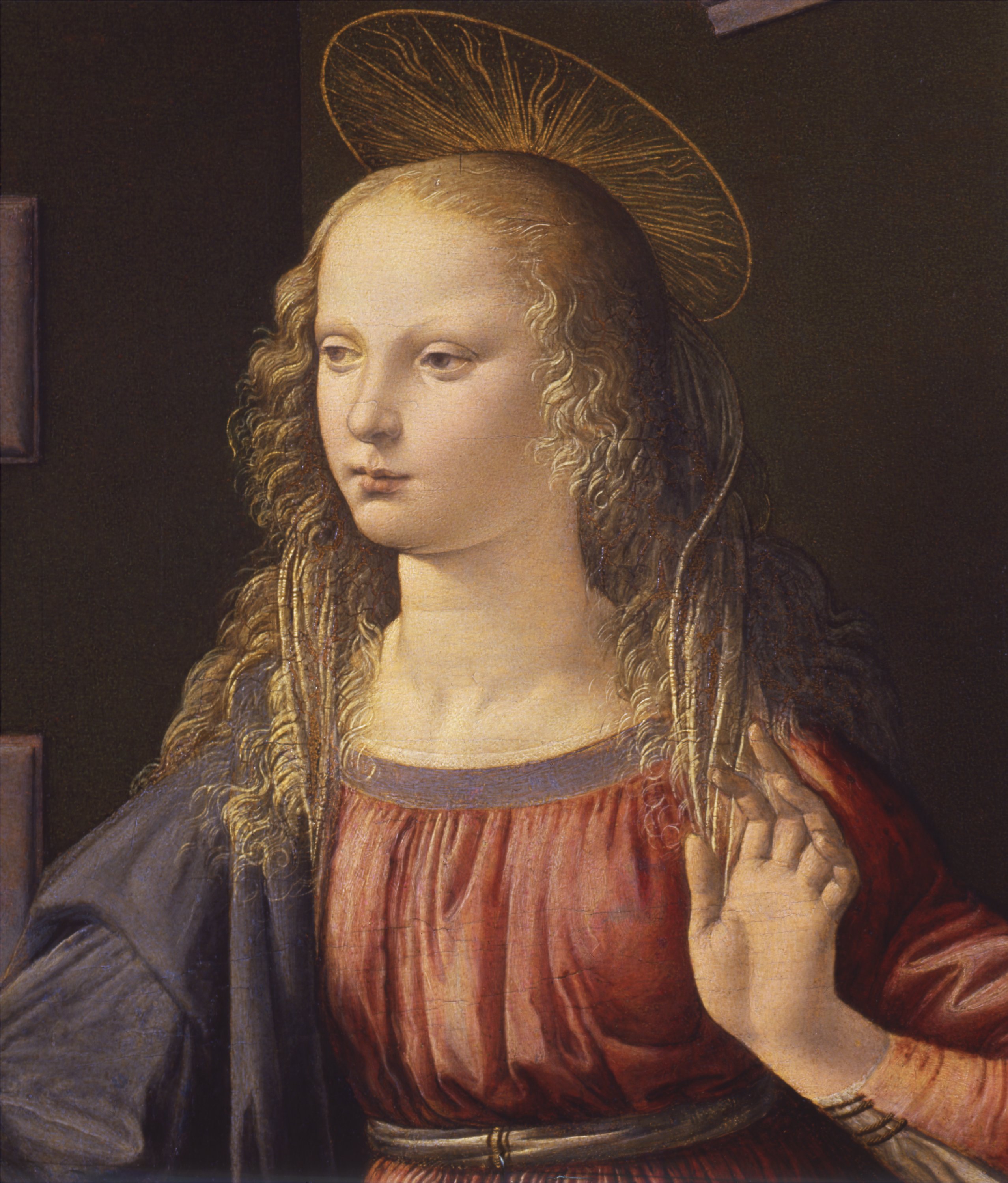 Davanti ad un palazzo rinascimentale, in un rigoglioso giardino recintato che evoca l’hortus conclusus allusivo alla purezza di Maria, l’Arcangelo Gabriele si inginocchia davanti alla Vergine rivolgendole il saluto ed offrendole un giglio. La Vergine risponde, seduta con grande dignità davanti a un leggio sul quale è poggiato un libro. Il tradizionale tema sacro è collocato da Leonardo in un’ambientazione naturalistica e terrena: l’angelo ha una corporeità concreta, suggerita dall’ombra proiettata sul prato e dalla resa dei panneggi che presuppongono studi dal vero. Anche le sue ali prendono ispirazione da quelle di qualche poderoso rapace. E’ straordinaria la resa della luce crepuscolare che plasma le forme, unifica la scena e fa risaltare le sagome scure degli alberi sul lontano paesaggio dello sfondo, dominato dai toni sfumati cari all’artista. Gli elementi architettonici sono disegnati secondo le regole della prospettiva con punto di fuga centrale, ma alcune anomalie riscontrabili nella figura della Vergine, il cui braccio destro appare eccessivamente lungo, potrebbero rispecchiare precoci ricerche di ottica da parte di Leonardo, che avrebbe tenuto conto del punto di vista laterale (da destra) e ribassato determinato dalla collocazione originale della tavola dipinta, cioè sopra un altare laterale di una chiesa.