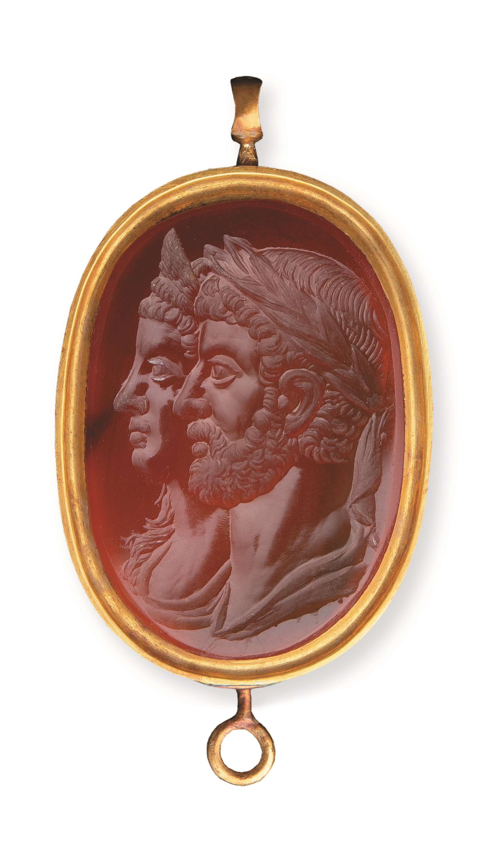 L’immagine proposta è perfettamente rispondente alla propaganda della domus Augusta antonina, basata sulla concordia della coppia imperiale, garante della pace e della prosperità dell’impero. Nell’intaglio moderno il sovrano è raffigurato in primo piano, di profilo, come sempre barbato, sull’esempio del predecessore Adriano, e ornato da una corona di alloro. In secondo piano appare il volto della moglie, anch’essa di profilo, contraddistinta dall’alto diadema che ne caratterizzò l’immagine dopo la morte e l’immediata consecratio – l’elevazione a diva – nel 141 d.C., a pochi anni di distanza dalla salita al trono del marito, che quindi poté proporla per quasi tutto il suo Principato come nume tutelare della famiglia imperiale. Unico tratto dissonante rispetto al modello antico è il dettaglio dei capelli sciolti che cadono sulla spalla destra di Faustina, in contrasto con l’acconciatura tipica dell’imperatrice, che prevedeva la composizione dei capelli in ciocche raccolte in un turbante “a torre”, vero e proprio simbolo del rigore morale che la sua figura doveva trasmettere.