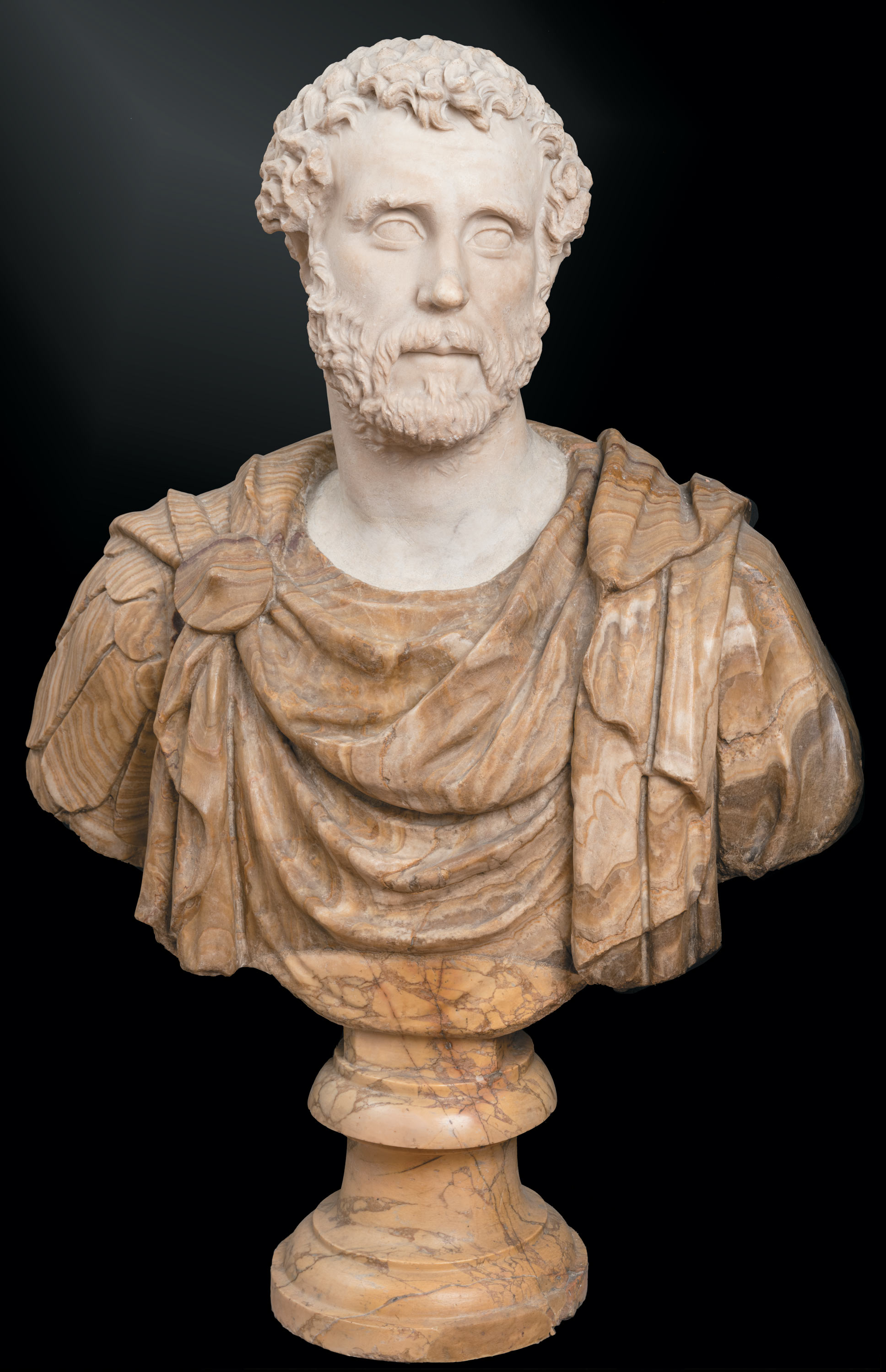 Questa splendida scultura raffigura l’imperatore Antonino Pio (138-161 d.C.), successore di Adriano e iniziatore della dinastia degli Antonini. Il volto qui ritratto, caratterizzato dalla barba, sull’esempio del predecessore, e dai segni del tempo, a simboleggiare la saggezza del principe, è colto mentre volge lo sguardo meditabondo e malinconico verso sinistra. L’esemplare fiorentino si riconduce al tipo ritrattistico principale dell’imperatore, che sarà riprodotto fin dopo la sua morte, il cosiddetto “Formia-Croce Greca 595”, le cui molte repliche si differenziano soltanto nel trattamento delle ciocche sulla fronte, con una variazione nella conformazione “a tenaglia” o “a coda di rondine”. L’elaborazione di questa tipologia è databile, per confronto con l’iconografia monetale, al momento dell’adozione di Antonino Pio da parte di Adriano, nel febbraio del 138 d.C., e conobbe grande popolarità, maggiore dell’altro tipo ritrattistico noto, il tipo “Sala Busti 284”, probabilmente creato poco dopo, nel maggio dello stesso anno, in occasione della sua salita al trono.