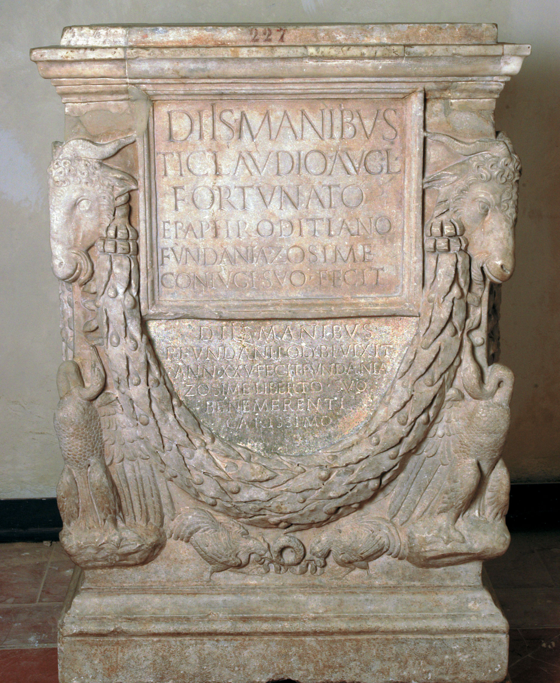 Il monumento funerario, commissionato da Fundania Zosime, è riccamente decorato su tre lati con festoni di foglie di alloro e bacche che dividono a metà lo spazio e un cui capo è fissato alle corna degli arieti che occupano gli angoli superiori della faccia principale dell’ara, cui corrispondono in basso due aquile su basi aggettanti, di cui si può apprezzare il naturalismo del piumaggio, naturalismo che caratterizza anche i due galli in lotta sotto il festone. Nella parte superiore, all’interno della tabella, la dedica con la destinazione originaria del monumento, cui è seguita, a breve distanza di tempo, una seconda dedica, incisa nello spazio tra la tabella e il festone (CIL VI 15082).