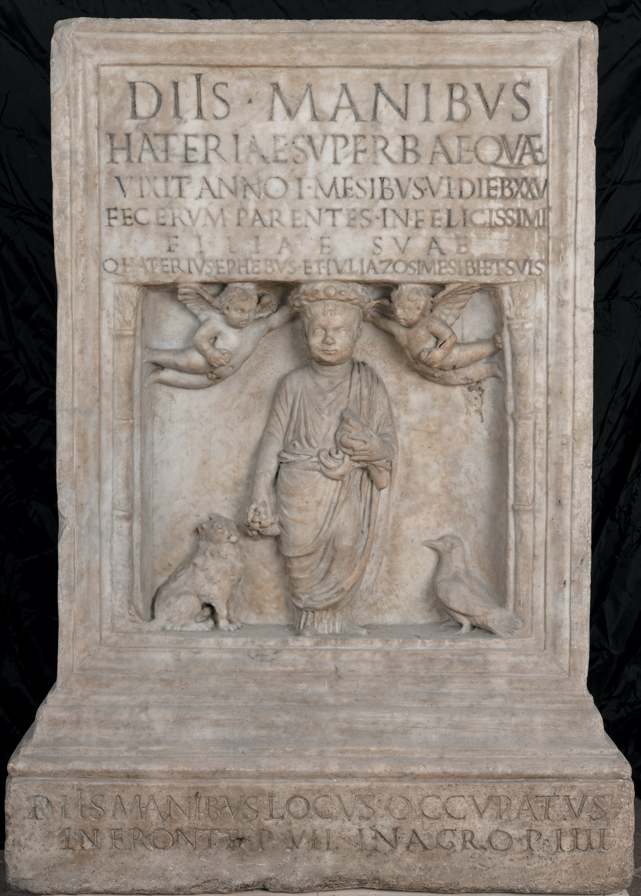 Nella rappresentazione la fanciulla è colta a metà tra la vita e la morte, come ha suggerito per primo il Mansuelli. Accanto a lei un cagnolino e un uccello, insieme alla colomba che tiene in mano, rappresentano i compagni di gioco nella vita terrena, mentre i due eroti che le cingono il capo con una corona di foglie alludono alla sfera ultraterrena, così come il grappolo d’uva nella mano destra, probabile riferimento alla simbologia dionisiaca. Un’ulteriore allusione alla speciale protezione ultraterrena di cui godevano i fanciulli è costituita dal pendente con due perle che le adorna la fronte, pertinente al culto isiaco. Altro punto di interesse del ritratto risiede nell’abbigliamento di Hateria, in tunica e toga, che riprende quello di alcune delle fanciulle raffigurate nel fregio nord dell’Ara Pacis, l’altare monumentale edificato da Augusto, ulteriore dimostrazione di come, nella rappresentazione delle donne di ogni ceto ed età, ci si ispirasse ai modelli forniti dalla domus Augusta.
