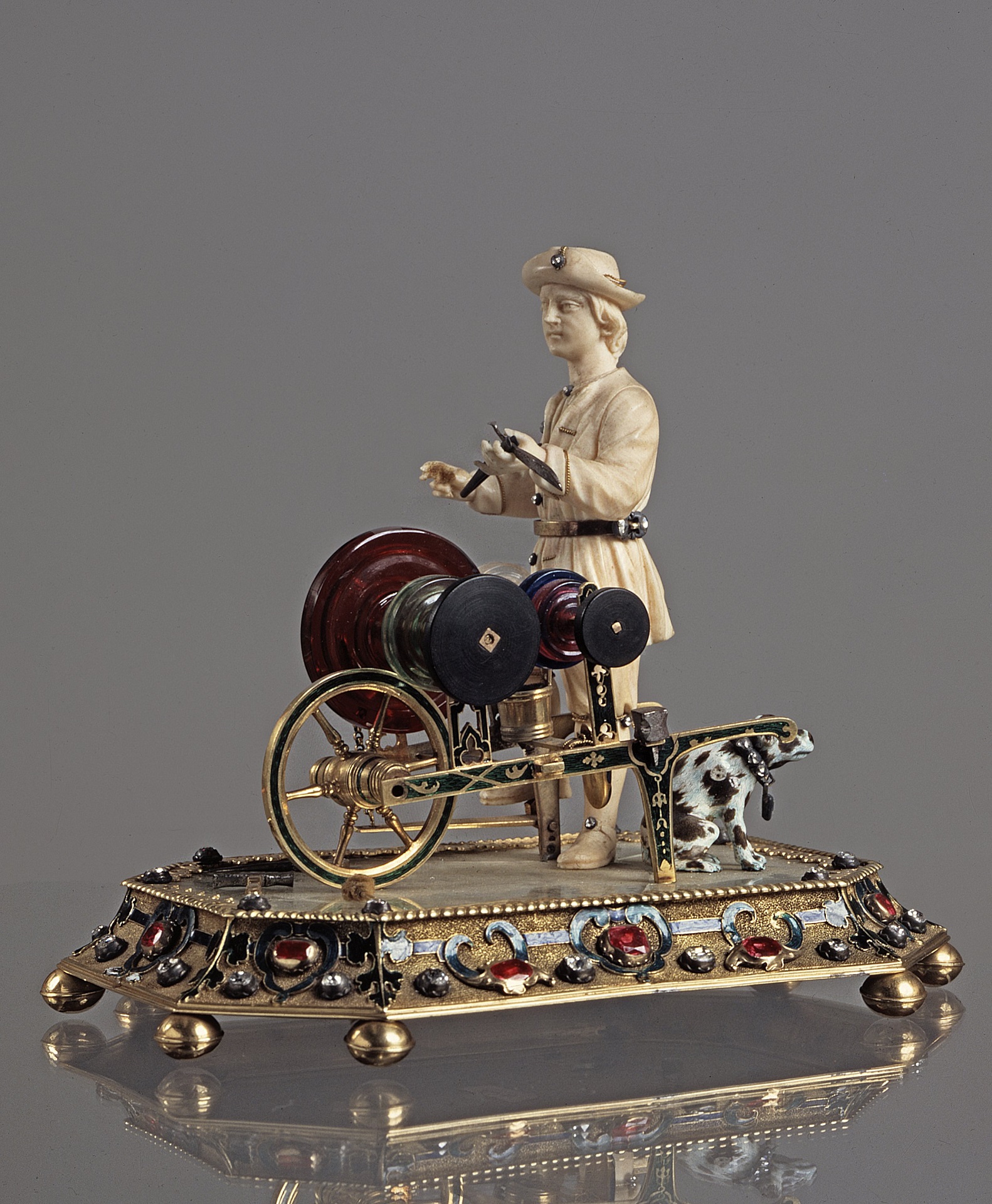 La statuetta, in avorio intagliato impreziosito da diamanti, rappresenta un arrotino intento ad affilare la lama di un rasoio su delle mole in pietra dura ed ebano montate sopra una carretta in oro parzialmente smaltato di verde, alla quale sono appesi un mastellino per raccogliere l’acqua e un fodero, sempre in oro, smaltato di verde e blu. Ai piedi del personaggio è seduto un cane pezzato bianco e marrone a smalto miniato con collare tempestato di diamanti. Tutto il gruppo poggia su una lastra di specchio su cui sono disposti un martello, un paio di forbici e uno stoppaccio. La base, a pianta ottagonale, è sostenuta da otto piedini a sfera schiacciata e presenta lungo il bordo incavato un ricco fregio costellato di diamanti e rubini incastonati tra nastri e foglie stilizzate in smalto verde, blu e bianco su fondo puntinato.