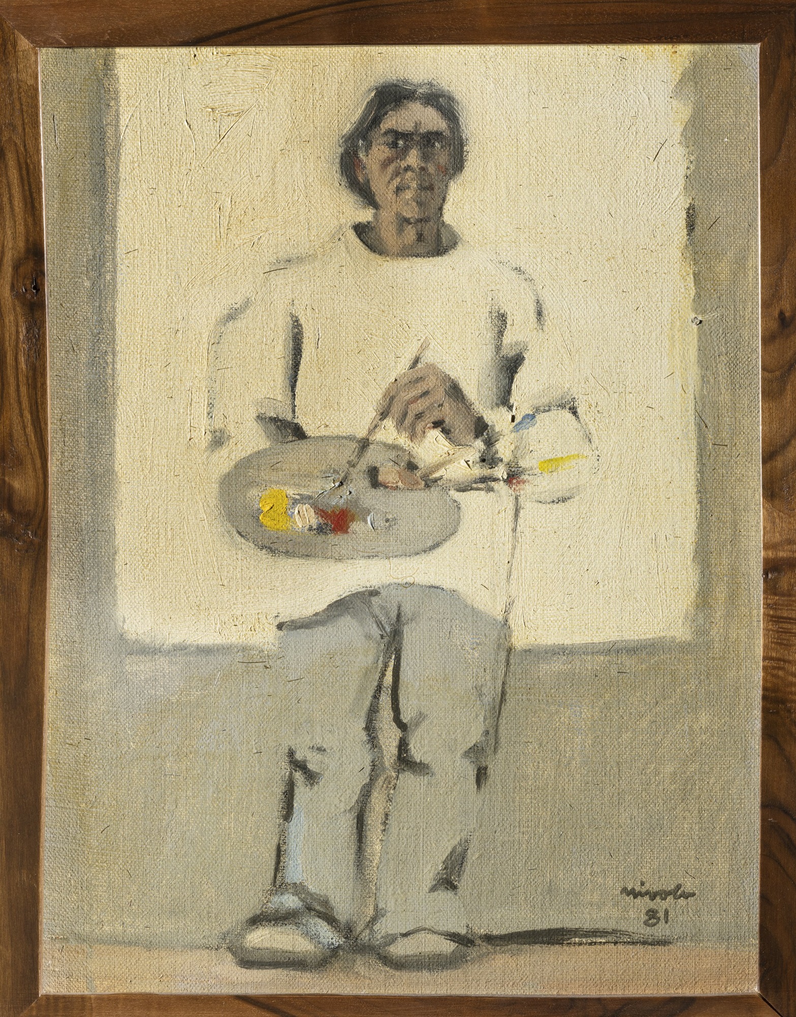 Nato a Orani, in Sardegna, Nivola dal 1931, grazie a una borsa di studio, frequenta l’ISIA di Monza, con maestri quali Marino Marini e Edoardo Persico. Diplomatosi nel 1936, diviene nel 1937 art director alla Olivetti. Collabora nello stesso anno all’apparato decorativo del Padiglione Italia all’Esposizione Universale di Parigi: qui, la visita del padiglione spagnolo rafforza i sentimenti antifascisti maturati già da tempo. Con la moglie Ruth Guggenheim, ebrea, per sfuggire alle persecuzioni razziali, si trasferisce dal 1938 prima a Parigi, poi a New York, dove trascorrerà una parte importante della sua vita e carriera. Fra il 1948 e 1949, Nivola inventa una nuova tecnica per modellare sculture in cemento da matrici di sabbia, il sand casting. Con questa tecnica realizza il monumentale fregio decorativo in gesso, di 25 metri per 3, per lo showroom Olivetti sulla Fifth Avenue a New York, progettato dallo studio BBPR. Questa prima importante commissione e il successo che ne deriva consacrano Nivola fra gli artisti che usano la scultura in dimensione monumentale e in stretto rapporto con l’architettura. Dagli inizi degli anni Settanta, dopo aver sperimentato una enorme varietà di tecniche e materiali, Nivola si stabilisce in Toscana per dedicarsi prevalentemente alla scultura in marmo e maturando un rapporto di elezione con la Toscana e con i laboratori di lavorazione del marmo della Versilia in particolare. Il presente Autoritratto è stato eseguito nel 1981 per gli Uffizi, in risposta all’invito ricevuto da parte di Luciano Berti a donare un’opera per commemorare il quarto centenario dalla fondazione degli Uffizi. Assai significativo che Nivola, ben conscio del valore storico della collezione degli Uffizi e delle presenze con cui qui il suo dipinto si sarebbe confrontato, decida di autorappresentarsi come pittore, nonostante avesse praticato quest’arte solo in gioventù. Ma la tavolozza e il pennello si affiancano comunque agli abiti pesanti, per il lavoro scultoreo, e al candido pannello sullo sfondo, un tributo alla Versilia e alle sue cave.