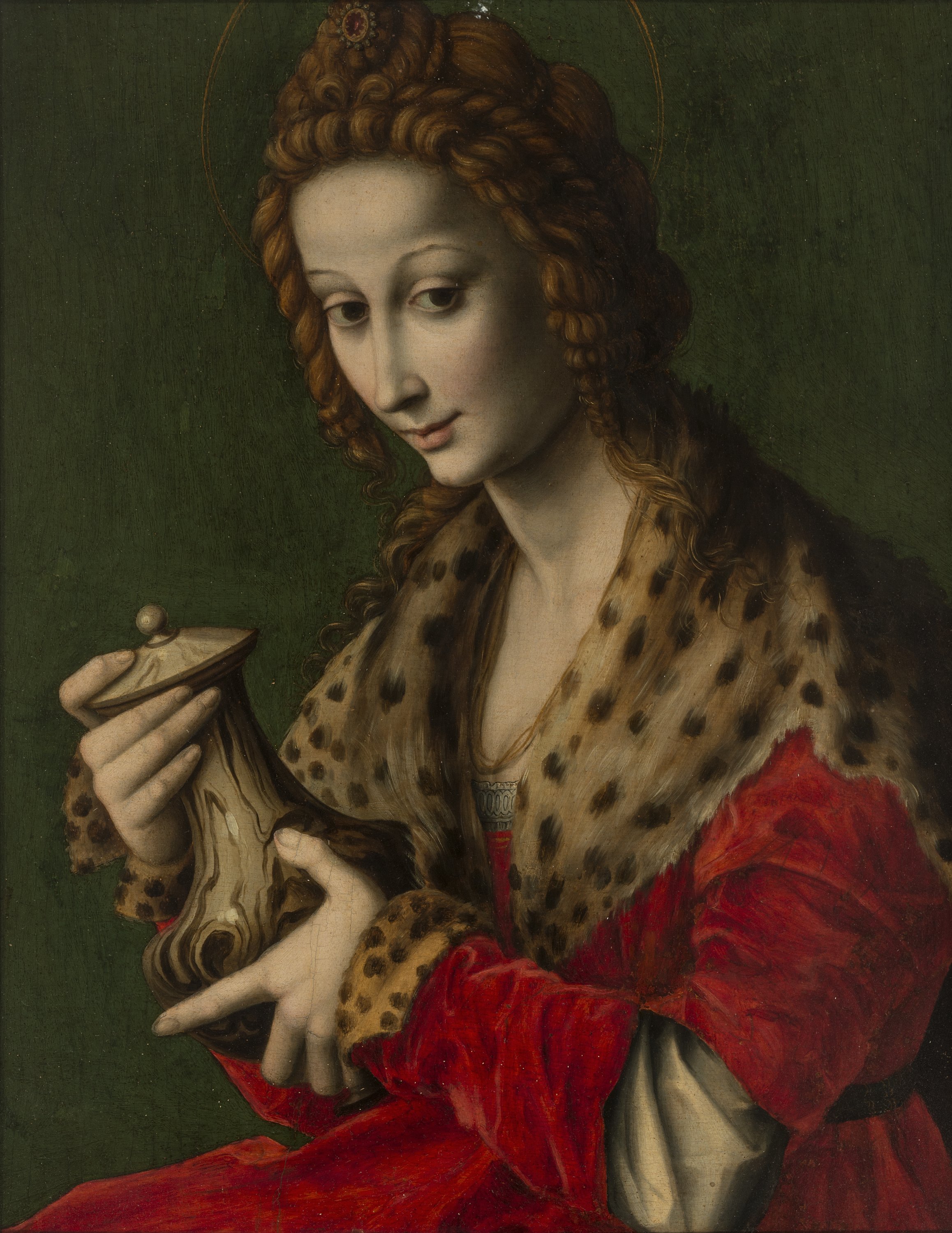 Maddalena è presentata a mezza figura e di tre quarti, lo sguardo rivolto allo spettatore mentre mostra un vaso in onice, attributo a lei spesso abbinato con riferimento al passo evangelico (Luca 7,38) in cui si narra che la donna, dopo aver lavato i piedi di Gesù con le sue lacrime, li unse con olio profumato. La veste di damasco rosso, a contrasto col verde acido del fondo, è tagliata al gomito per lasciar trasparire la camiciola bianca mentre collo e maniche sono guarniti in pelle di lupo cerviero (lince). La catena d’oro e il gioiello appuntato sulla testa completano l’elegante mise della santa, presentata secondo modi propri della ritrattistica privata di primo Cinquecento (taglio a mezzobusto che include le mani, inquadratura ravvicinata, abbigliamento alla moda) e questa scelta ha portato alcuni studiosi a ritenere che sotto le spoglie di Maddalena si celi l’effigie di una nobildonna a oggi non meglio identificata. Di fatto, che il pittore abbia orchestrato l’immagine giocando sull’ambiguità tra sacro e profano è suggerito anche dall’espressione di sottile complicità dello sguardo e nel sorriso appena accennato, nel quale non si fatica a riconoscere l’ombra lunga proiettata fin dentro i decenni centrali del secolo dai ritratti di Leonardo da Vinci, sotto il cui nome, peraltro, questo dipinto era rubricato negli inventari medicei seicenteschi. In questa immagine capziosa Bachiacca, pittore tra i più eccentrici di primo Cinquecento, lascia alle spalle le iniziali esperienze peruginesche per approfondire il dialogo con la pittura fiamminga e misurarsi a suo modo con alcune invenzioni di Michelangelo, in particolare con la serie grafica di “teste divine”, cioè volti ideali incorniciati da acconciature elaboratissime (a loro volta desunte dalla moda delle eroine antiche in marmo tardo quattrocentesche) che ispirarono ai pittori contemporanei una vasta gamma di derivazioni.