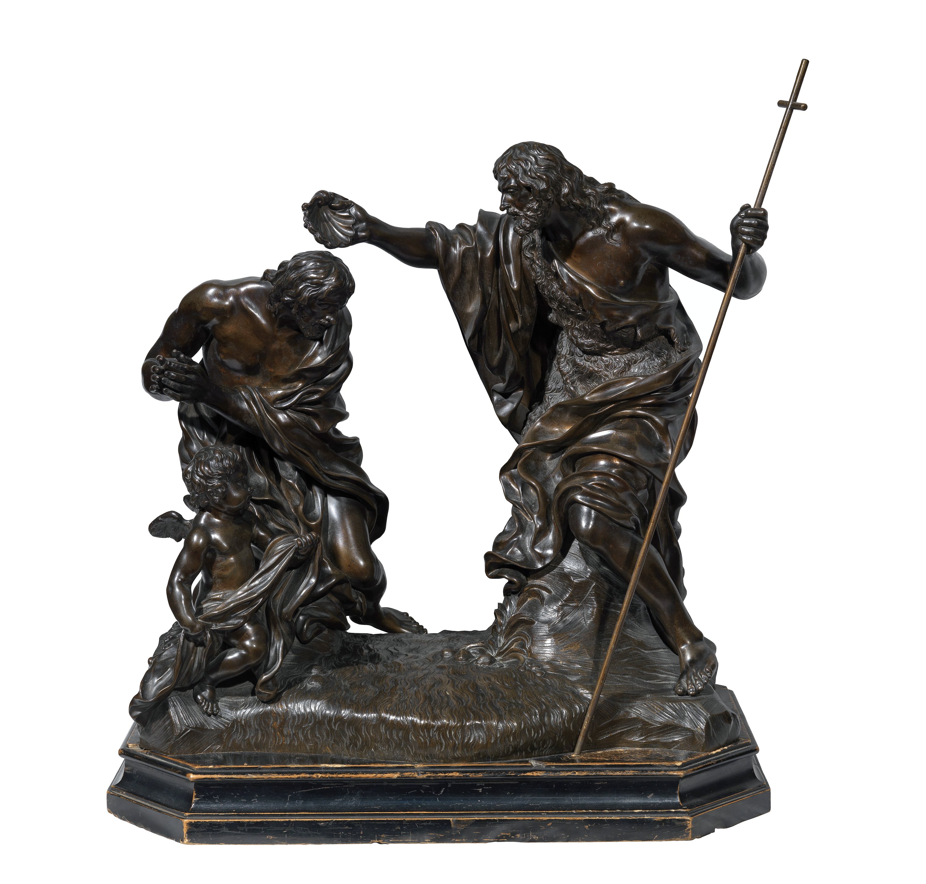 La scultura raffigura il solenne momento in cui Giovanni Battista versa l’acqua con una conchiglia sulla testa di Cristo, inginocchiato di fronte a lui. Sulla sua sinistra, un angioletto ne regge il panneggio. Unico bronzetto firmato dal Foggini, l’opera faceva parte di una serie di dodici esemplari commissionati a diversi artisti fiorentini dall’Elettrice Palatina Anna Maria Luisa de’ Medici, figlia di Cosimo III e ultima discendente della famiglia. Grazie a documenti d’archivio sappiamo che la principessa, estremamente devota, custodiva il Battesimo nella sua camera da letto a Palazzo Pitti. Dopo la sua morte (1743) l’opera subì diversi passaggi di proprietà e fu considerata dispersa per molto tempo, fino a tornare alla sua sede originaria nel 1976. Nella camera da letto dell’Elettrice si conservano tuttora altre due importanti opere realizzate su disegno di Foggini: l’inginocchiatoio e l’acquasantiera [LINK SCHEDE] che il padre Cosimo III le regalò per le nozze, alle quali la principessa era così affezionata da portarle con sé da Düsseldorf a Palazzo Pitti dopo la morte del marito.