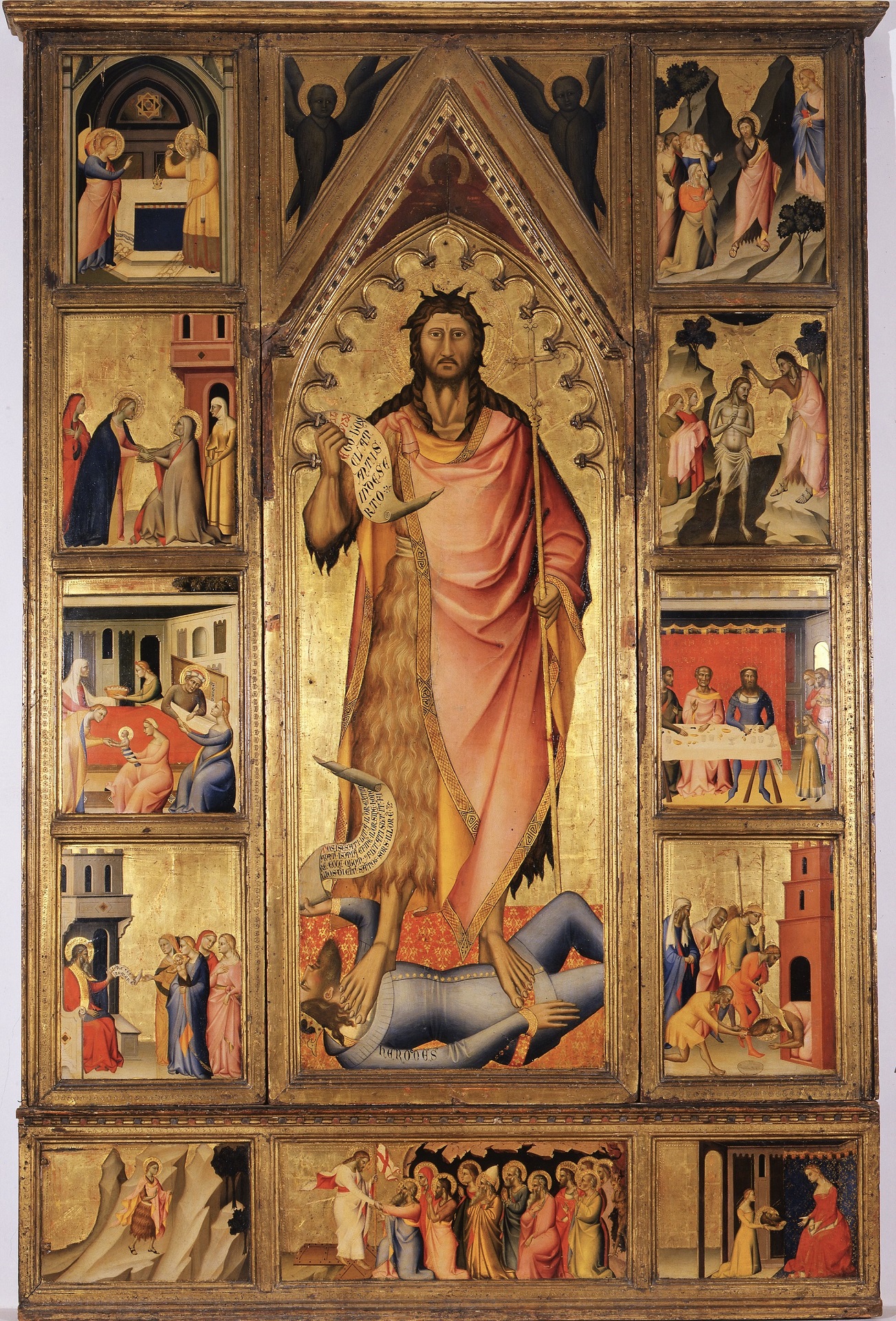 Intorno undici riquadri raccontano la vita di Giovanni. A sinistra è narrata la nascita e l’infanzia del santo, concepito prodigiosamente dagli anziani genitori Elisabetta e Zaccaria. Il lieto evento viene annunciato da un angelo a Zaccaria (1), dopo il concepimento Elisabetta riceve la visita di Maria (2), futura madre di Gesù. Dopo la nascita (3), Zaccaria, reso temporaneamente muto per avere dubitato della profezia dell’angelo, scrive il nome scelto per il figlio (4): IOHANNES EST NOMEN EIUS (Giovanni è il suo nome; Lc 1, 63). La sequenza si conclude con Giovanni bambino che si ritira in preghiera nel deserto (5). A destra in alto, il racconto continua con la predicazione di Giovanni nel deserto (6), il battesimo di Gesù (7), Salomè che, istigata dalla madre Erodiade, danza per il re Erode chiedendo in cambio la decapitazione di Giovanni (8), il martirio del santo (9) e si conclude con Salomè che porta alla madre la testa di Giovanni (10). In basso al centro, Cristo scende negli inferi per risorgere e liberare le anime di Giovanni e dei giusti (11).