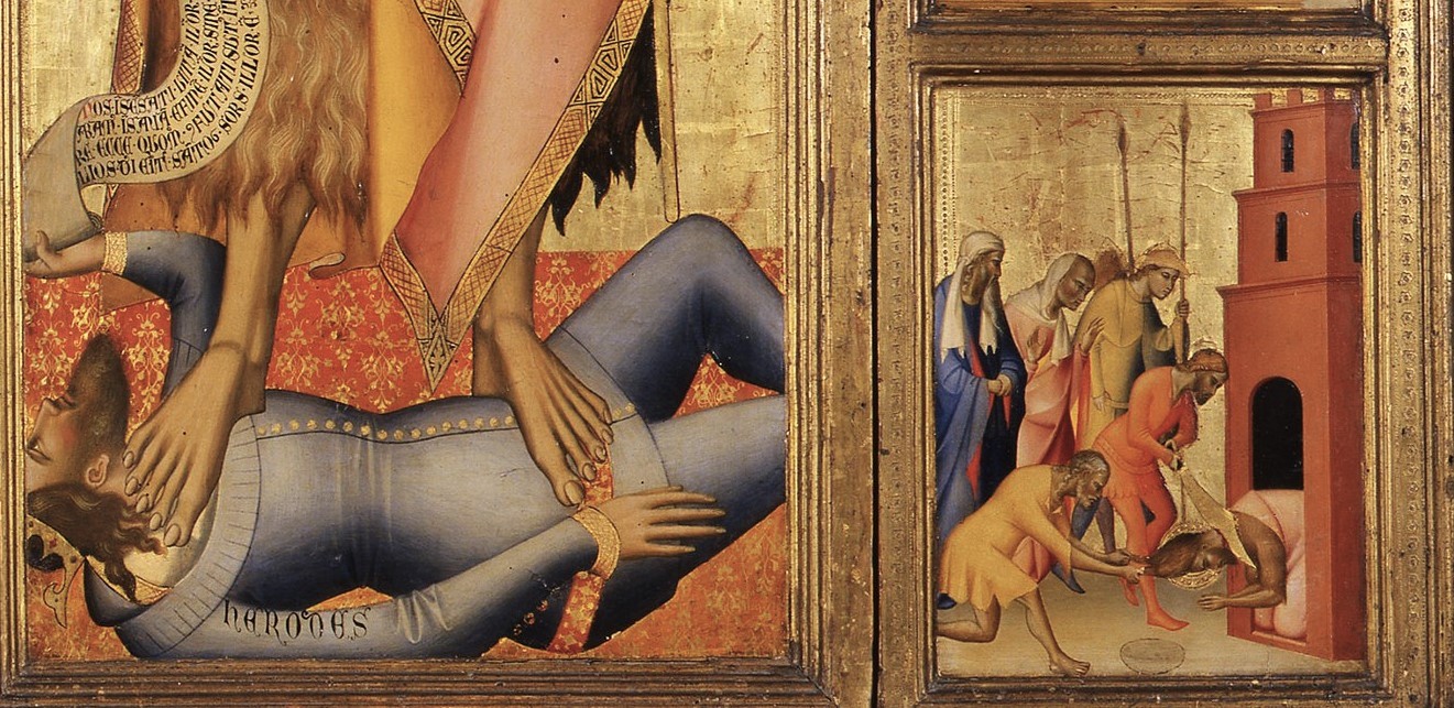 Il profeta Giovanni battista è raffigurato trionfante sul suo carnefice Erode, re di Galilea. Il santo ha l’aspetto incolto dell’asceta e indossa sotto il manto una veste fatta di peli di cammello, mentre sorregge un cartiglio con il passo EGO VOX CLAMANTIS IN DESERTO (Io sono la voce di colui che grida nel deserto; Mt 3,3). Anche Erode, identificato dalla scritta HERODES apposta su un braccio, reca una pergamena con una lunga iscrizione: NON INSENSATI VITA ILLORUM EXTIMABAMUS INSANIAM ET FINEM ILLORUM SINE HONORE ECCE QUOMODO COMPUTATI SUNT INTER FILIOS DOMINI ET INTER SANCTOS SORS ILLORUM EST (Insensati noi stimavamo una pazzia la loro vita e ingloriosa la loro fine. Ecco come sono stati annoverati tra i figli del Signore e tra i santi è il loro destino; Sap 5, 4-5).