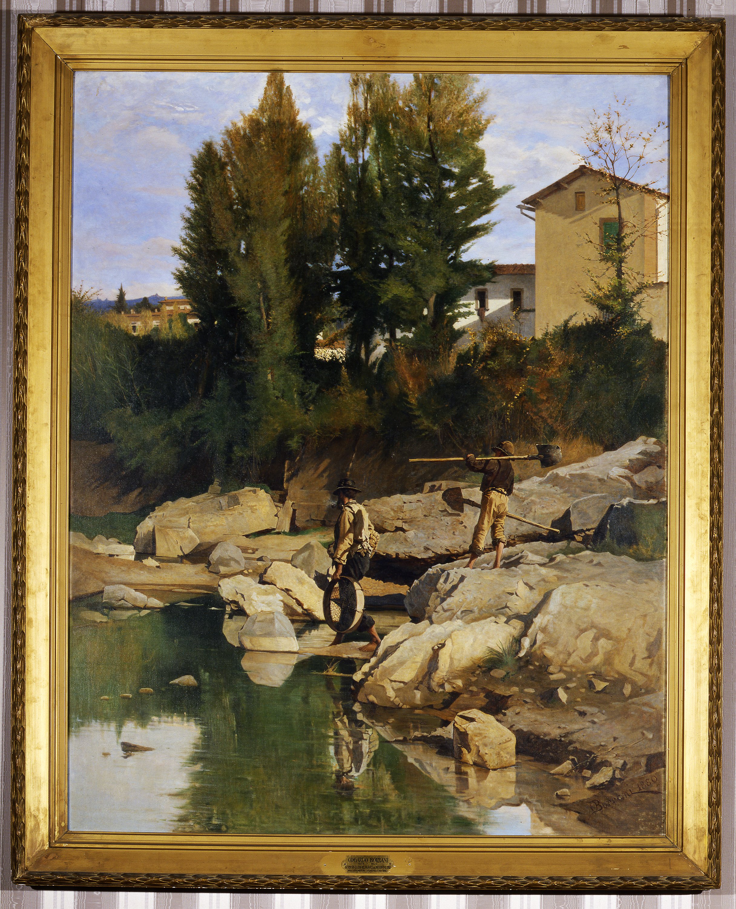 Due renaioli, di cui uno giovanissimo, si apprestano ad iniziare il quotidiano lavoro lungo le rive del Mugnone. La luce cristallina delinea con ombre nette la superficie delle pietre; sullo sfondo - dietro le colorate chiome di alberi e cespugli - si intravedono alcuni casolari. Anche l’acqua, con il suo lento scorrere, sembra scandire il tempo.