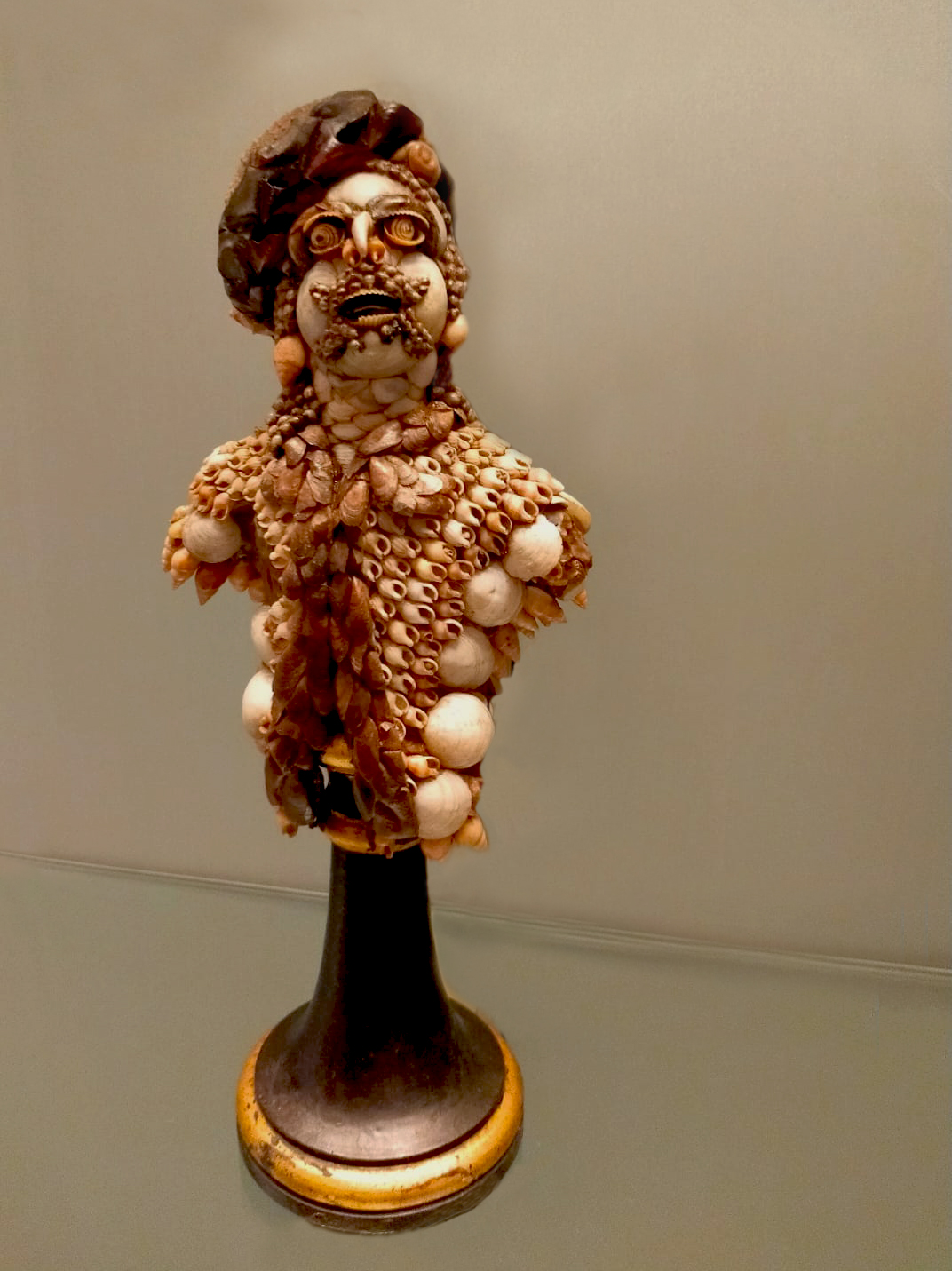 Il curioso oggetto appartiene a un gruppo di quattro esemplari simili per dimensioni e caratteristiche tecniche provenienti dalle raccolte del Gran Principe Ferdinando de’ Medici, primogenito del granduca Cosimo III. Collezionista estremamente raffinato, Ferdinando riunì nel corso degli anni un considerevole numero di dipinti, sculture, oggetti preziosi e curiosità, confluiti in seguito alla sua prematura scomparsa, nel 1713, nel tesoro di famiglia. Tra i beni registrati nell’inventario redatto alla morte del principe sono ricordati anche i quattro busti in conchiglie. Questo singolare insieme di manufatti era in origine completato da altre due figure femminili rivestite anch’esse di conchiglie, da identificarsi con due statuette conservate sempre nel Tesoro dei Granduchi. Dai documenti risulta che tutti e sei i pezzi furono consegnati al tornitore e costruttore di strumenti matematici Jacopo Mariani (o Mariano), artista citato dalle fonti contemporanee con il titolo di conservatore dei lavori in conchiglia di Cosimo III. Tale qualifica ha fatto ipotizzare l’esistenza all’interno delle botteghe granducali di maestranze specializzate nella realizzazione di opere simili a quelle del Gran Principe, ambitissime fin dal tardo Cinquecento dai collezionisti di tutta Europa per il loro aspetto ibrido, in cui l’artificio fa da supporto alla natura. L’uso di attingere alle forme naturali, come quelle delle conchiglie, per dar vita a nuove creature dall’aspetto bizzarro, e insieme stupefacente, ha il suo precedente più illustre nelle teste composite dipinte per le corti di Vienna e di Praga dal milanese Giuseppe Arcimboldo, costruite accostando immagini di fiori, frutta, ortaggi, mammiferi, uccelli e pesci. L’arte di Arcimboldo finì ben presto per contaminare anche la scultura, portando nel corso del XVII secolo alla produzione, soprattutto in Germania, di teste e busti formati dai materiali più disparati, dai semi ed elitre di insetti, impiegati in diversi altorilievi antropomorfi della Wunderkammer di Manfredo Settala a Milano, alle conchiglie, utilizzate per creare esseri fantastici come gli esemplari del Tesoro dei Granduchi.