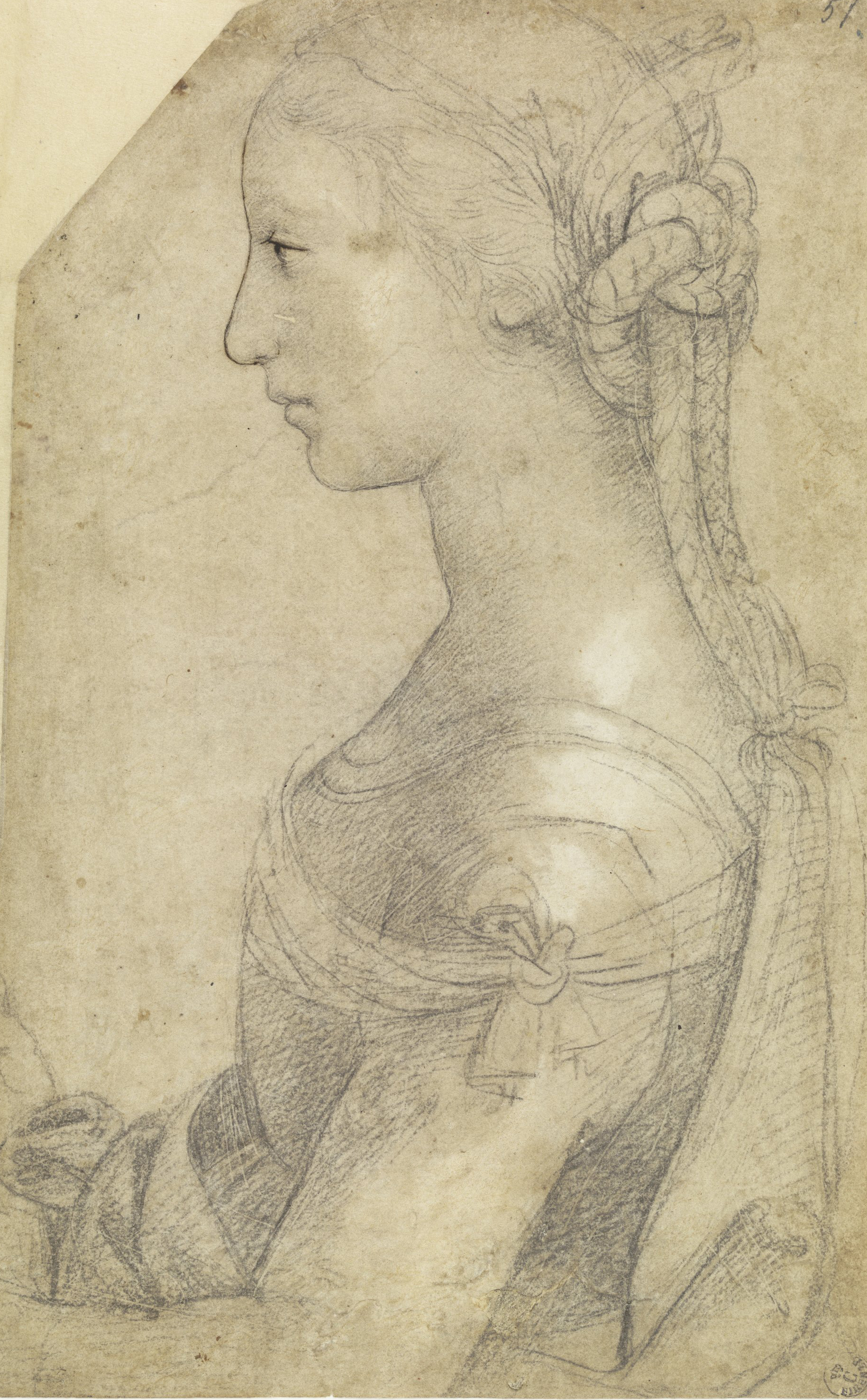 Si tratta di uno dei più raffinati disegni realizzati dal giovane Raffaello in corrispondenza del suo trasferimento a Firenze, avvenuto tra il 1504 e il 1505. L’opera, in passato ritenuta dello scultore fiorentino Mino da Fiesole, si ispira nel soggetto e nell’impianto compositivo ai celebri ritratti femminili dipinti nel corso della seconda metà del Quattrocento da Piero del Pollaiolo e da Domenico del Ghirlandaio, reinterpretati però in senso maggiormente plastico e tridimensionale.
