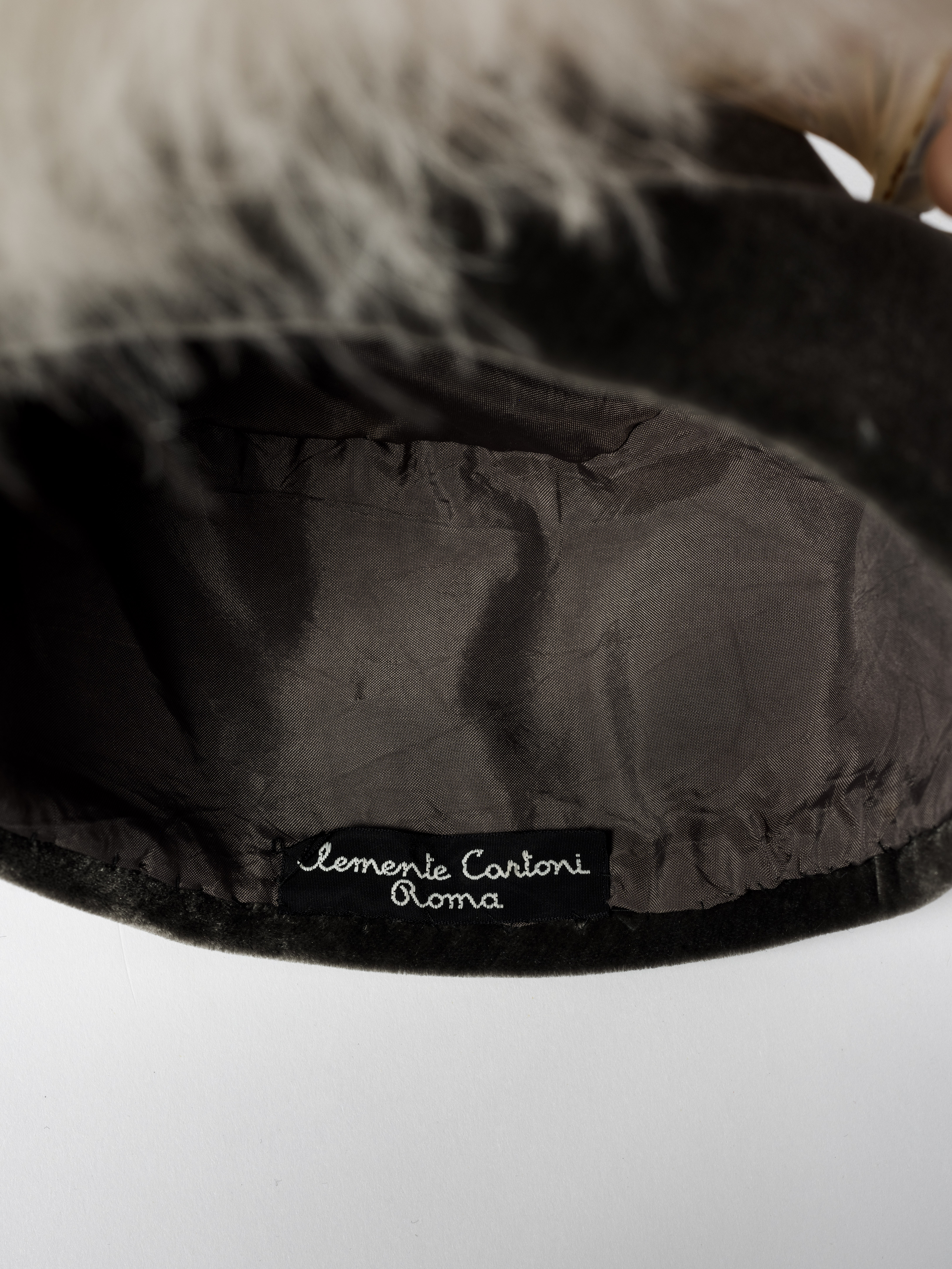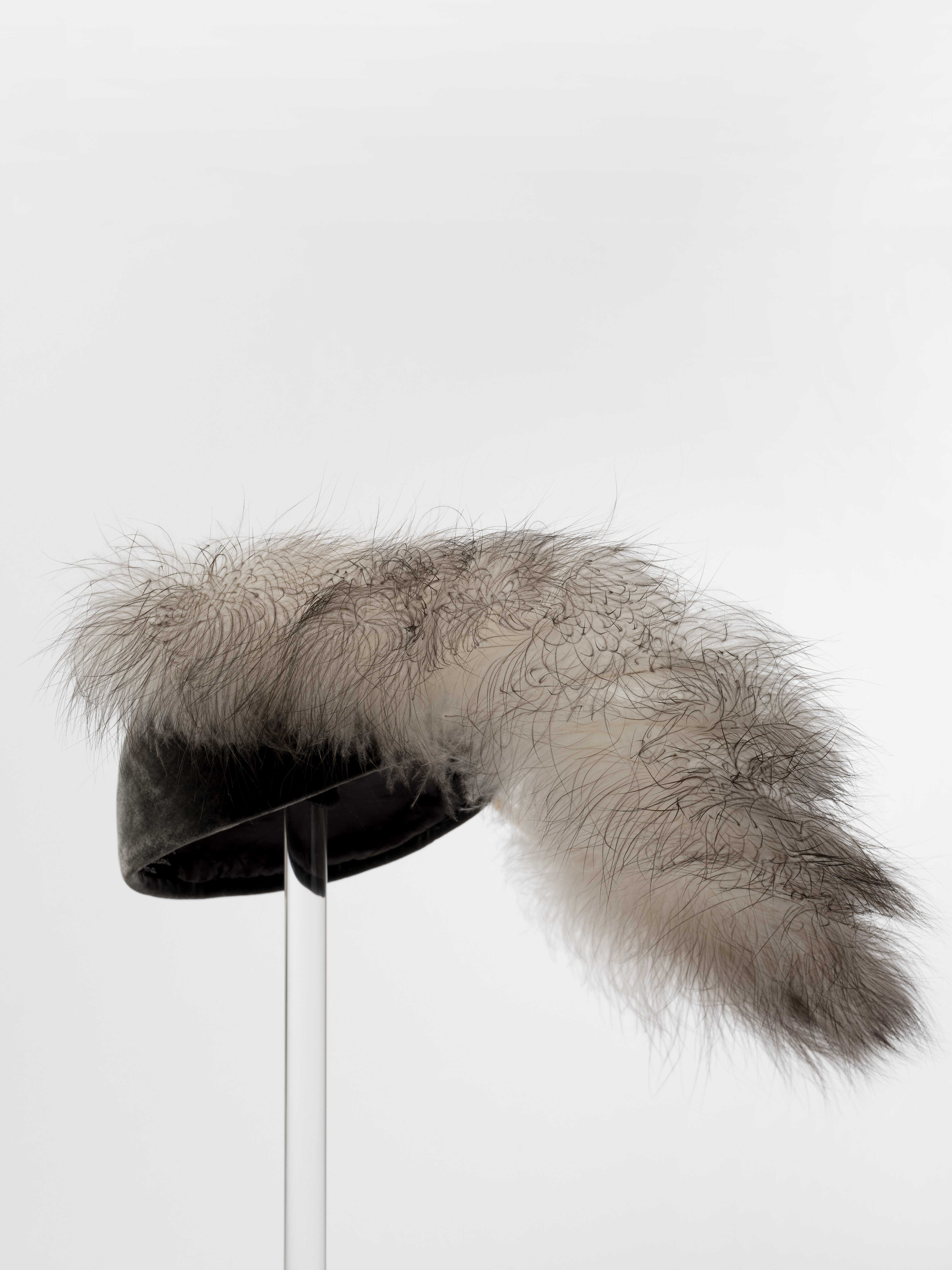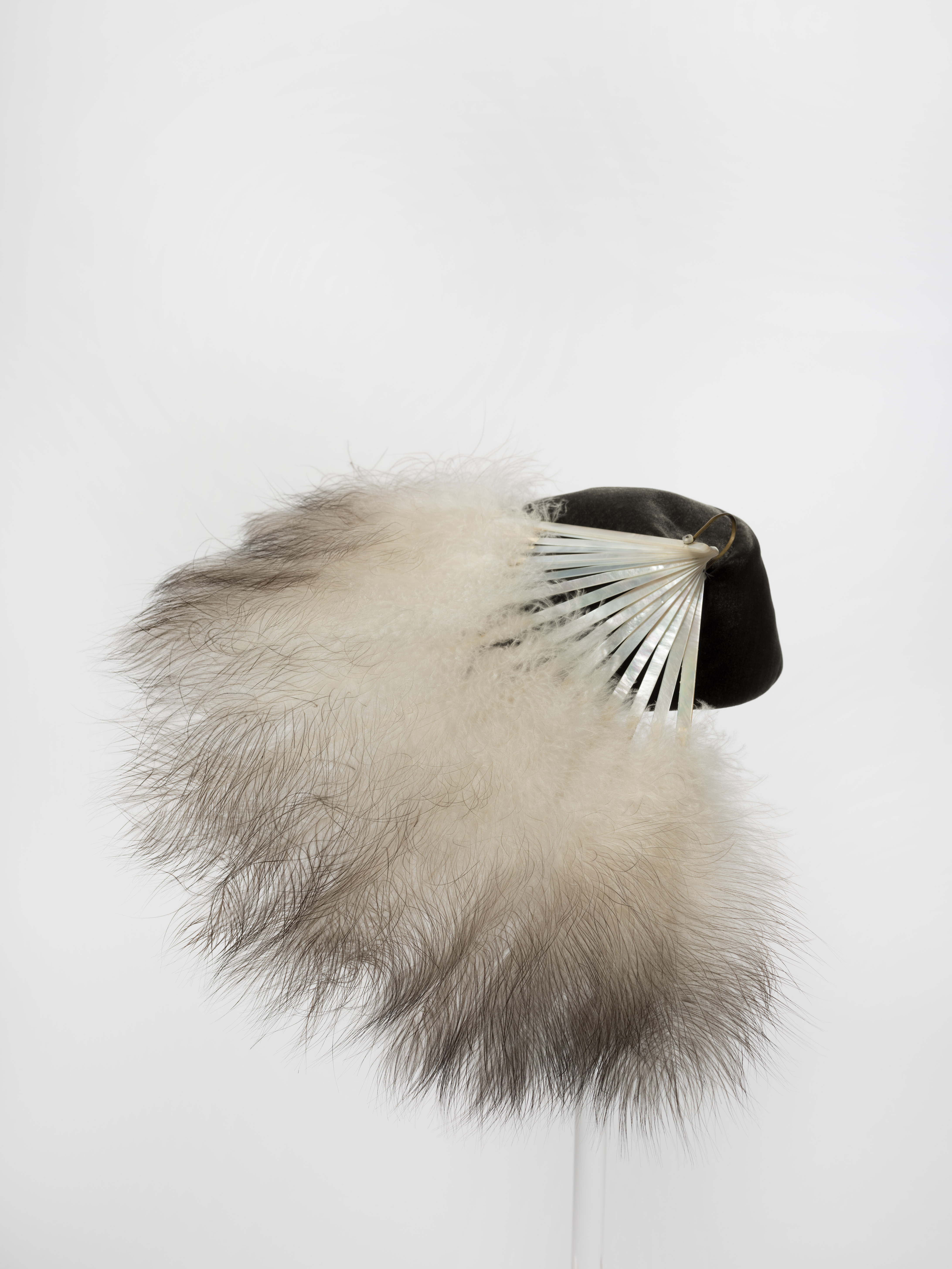 Sofisticato cappello formato da una calottina in velluto di seta grigio guarnita sul davanti da grande ventaglio d’epoca (anni Venti del Novecento), con stecche in madreperla e piume di marabù bianco naturale sfumato di grigio sulle punte.