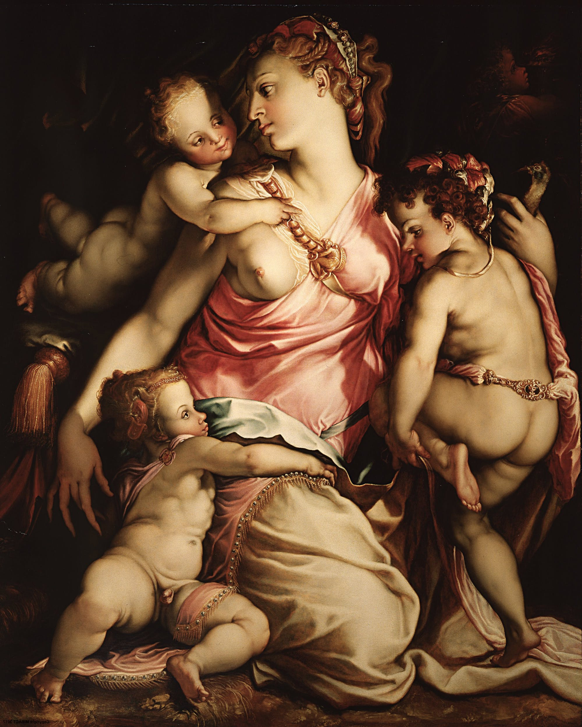 La giovane inginocchiata in primo piano, stagliata contro il tendaggio di fondo, è avvolta da una veste leggera che esalta le forme prosperose e scultoree, lasciando scoperto un seno. La circondano tre bambini, uno intento a giocare con la sua veste, gli altri due abbracciati alla spalla e alla coscia, intrattenendo con lei uno scambio affettuoso di sguardi. Salviati ha costruito le quattro figure come fossero un unico corpo, collegando armonicamente ogni movimento entro un sofisticatissimo equilibrio di corrispondenze che costituisce uno degli approdi più felici di quella che Vasari definì la ‘Bella Maniera’. La composizione si ispira al caposaldo indiscusso della pittura fiorentina di inizio secolo: il Tondo Doni di Michelangelo, sul quale è studiata sia la posa della figura femminile che quella dei tre fanciulli. Ma la scioltezza sinuosa, le espressioni languide e la preziosità dei dettagli d’ambiente richiamano più specificamente il nodo di cultura che si era determinato a partire dalla metà degli anni Venti a Roma, alla corte di Clemente VII, dalla convergenza di artisti di provenienza diversa quali Parmigianino, Perin del Vaga, Giulio Romano, Rosso, Sansovino e altri, e che avrebbe segnato le sorti della pittura fino agli ultimi decenni del secolo. Il dipinto fu eseguito a Firenze in occasione del soggiorno di Salviati in città, quando fu impegnato in imprese pubbliche, come gli affreschi della Sala dell’Udienza a Palazzo Vecchio e commissioni religiose.