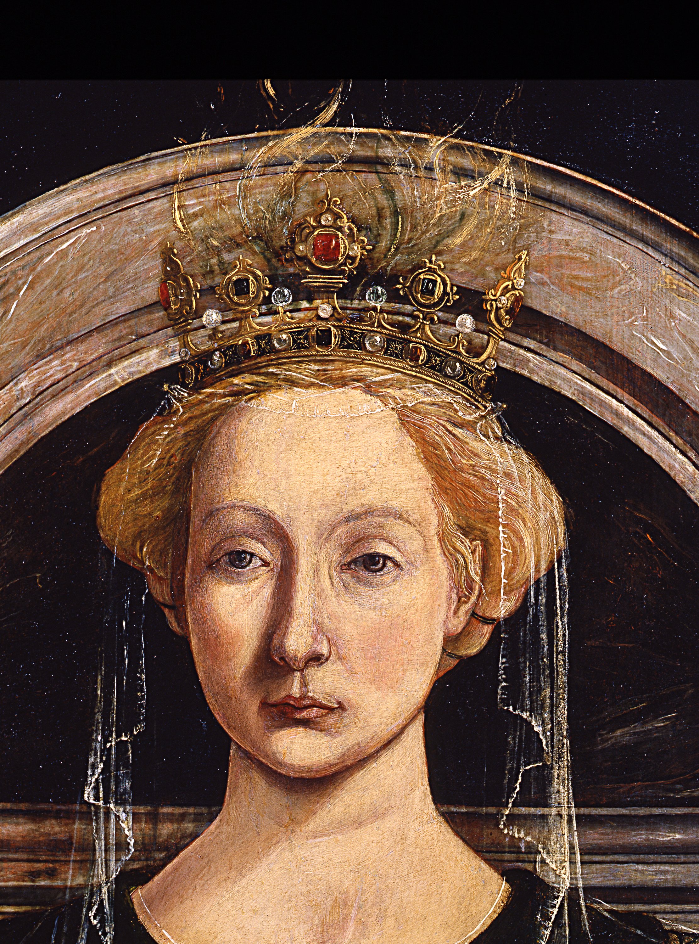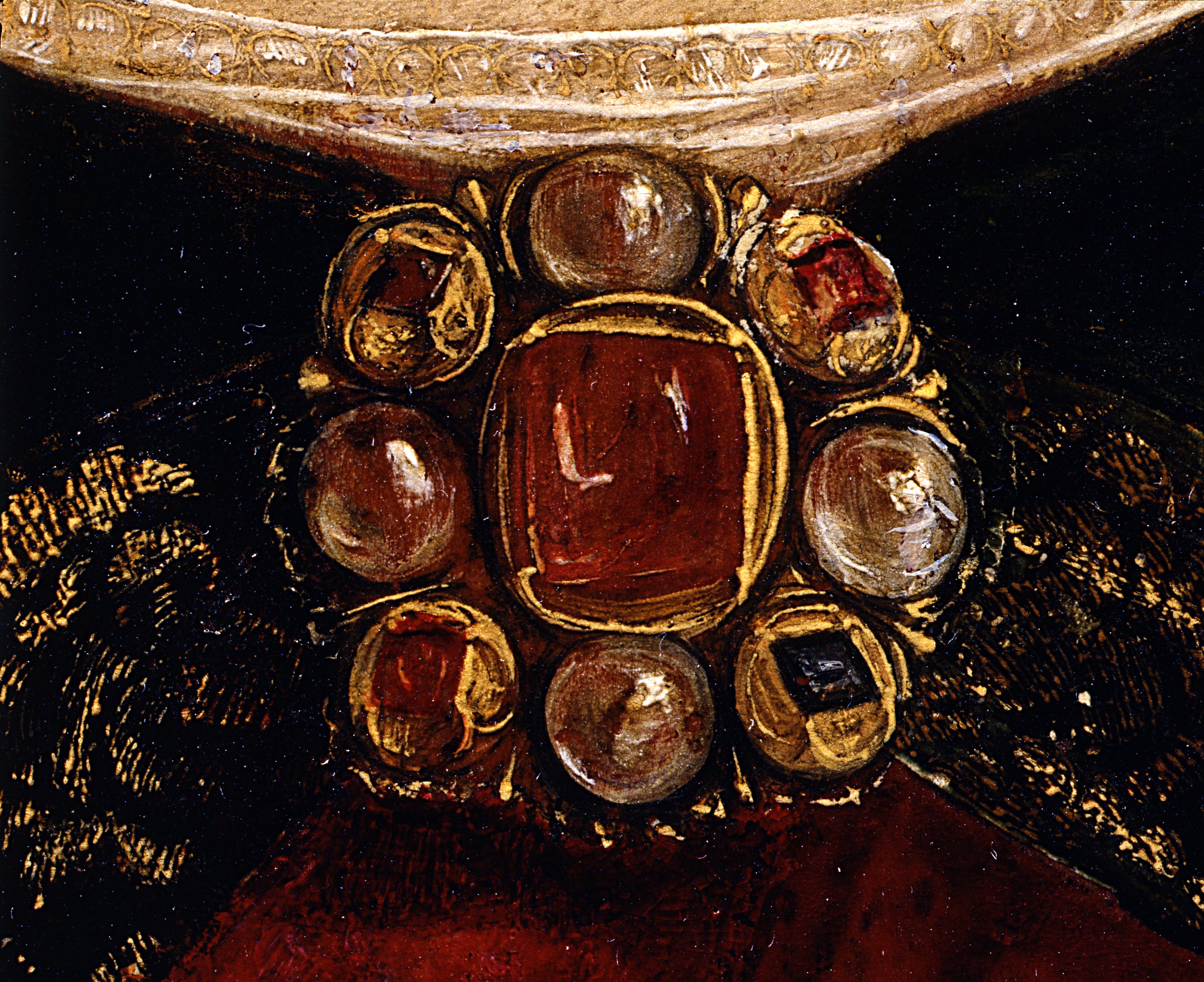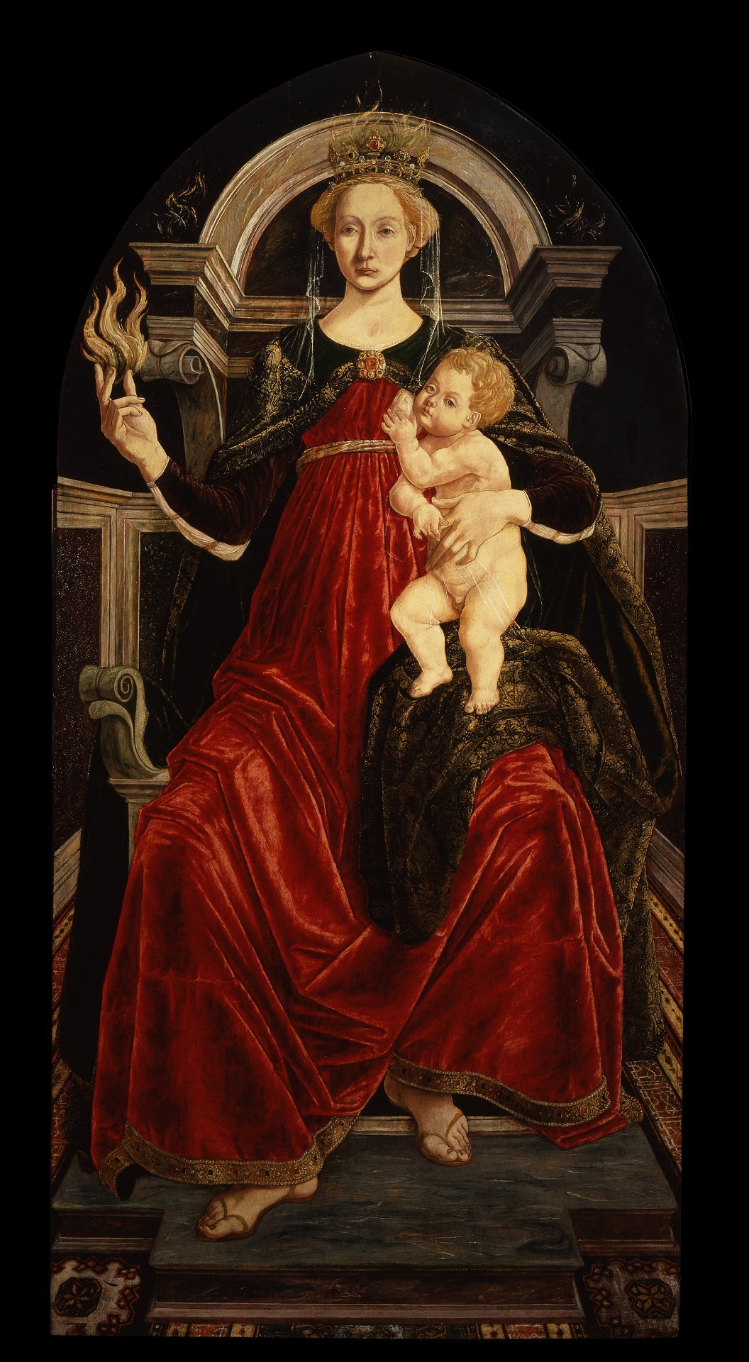 L’allegoria della Carità ha l’aspetto di una giovane donna che allatta al seno un bimbo, a indicare la misericordia verso il prossimo, e reca fra le dita una fiamma, emblema dell’amore di Dio. E’ una delle tre Virtù teologali, virtù che, secondo la dottrina cristiana, discendono da Dio. La donna siede su uno scranno entro un ambiente indistinto, ma delimitato da specchiature marmoree di ispirazione classica. La luce diretta, proveniente da destra, modella i volumi e pone in risalto l’abile resa del broccato d’oro del manto e del velluto della veste della donna. L’opera è parte di un ciclo pittorico dedicato alle Virtù commissionato a Piero del Pollaiolo nel 1469 e destinato alla sala dell’Udienza nel Tribunale di Mercanzia in piazza della Signoria a Firenze. La Carità fu la prima delle sette Virtù a essere eseguita e probabilmente, per sottoporre il progetto all’approvazione dei committenti, Pollaiolo approntò il disegno della Virtù che ancora oggi rimane sul verso della tavola. Il supporto del dipinto, come pure quello delle altre cinque Virtù dipinte dal Pollaiolo – la Fortezza fu eseguita da Sandro Botticelli - è costituito da assi di cipresso, un’essenza resistente all’attacco degli insetti xilofagi e all’umidità.