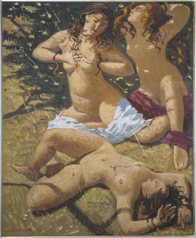 Nel 1932 Giovanni Colacicchi si fa notare alla Biennale di Venezia con il dipinto Amazzoni ferite, acquistato nell’occasione dall’architetto e accademico d’Italia Marcello Piacentini: anche in quel caso al centro della composizione è un gruppo di donne nude trafitte da frecce, ma la scena, ambientata su una spiaggia bianca e sullo sfondo di uno smagliante cielo azzurro, stempera la tensione narrativa nei preziosismi tecnici e in un afflato lirico figlio delle temperie di “Solaria”, la rivista di taglio interdisciplinare rivolta all’Europa, e di cui Colacicchi fu tra i fondatori.