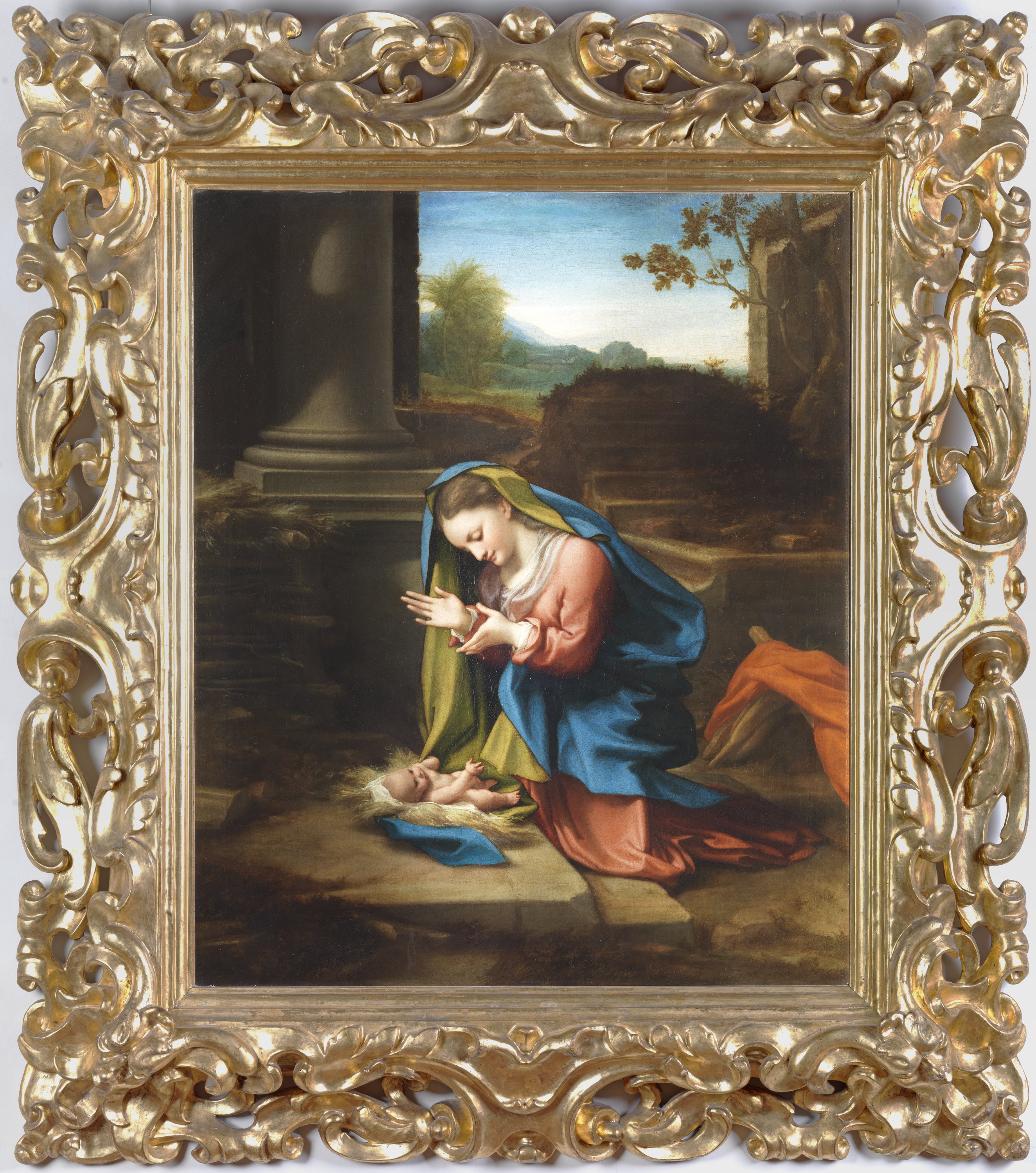 Il soggetto del dipinto aveva conosciuto una certa fortuna nel Quattrocento attraverso le opere di Filippo e Filippino Lippi che ne avevano realizzate più versioni. L’iconografia deriva dalla visione della nascita di Gesù che Santa Brigida di Svezia ebbe a Betlemme nel 1372. Nelle sue Rivelazioni la Santa racconta che “la Vergine si tolse i calzari […] si inginocchiò in atteggiamento orante, le mani protese in avanti e, d’un tratto, in un istante mise al mondo suo Figlio. Sul suolo all’improvviso comparve il neonato e da lui si irradiò una luce ineffabile. Quando Maria senti di aver generato il Bambino, lo salutò con queste parole: sii il Benvenuto, o mio Dio, Signore e mio Figlio” Nell’atmosfera chiara e rarefatta dell’alba, una bella e dolce Madonna si inginocchia di fronte a Gesù appena nato contemplandolo con tenerezza. Il Piccolo ricambia lo sguardo della madre allungando la manina nel tentativo tipicamente infantile di afferrarle la veste. Il loro intimo legame è sottolineato dall’invenzione di adagiare il neonato sopra un lembo del manto materno.