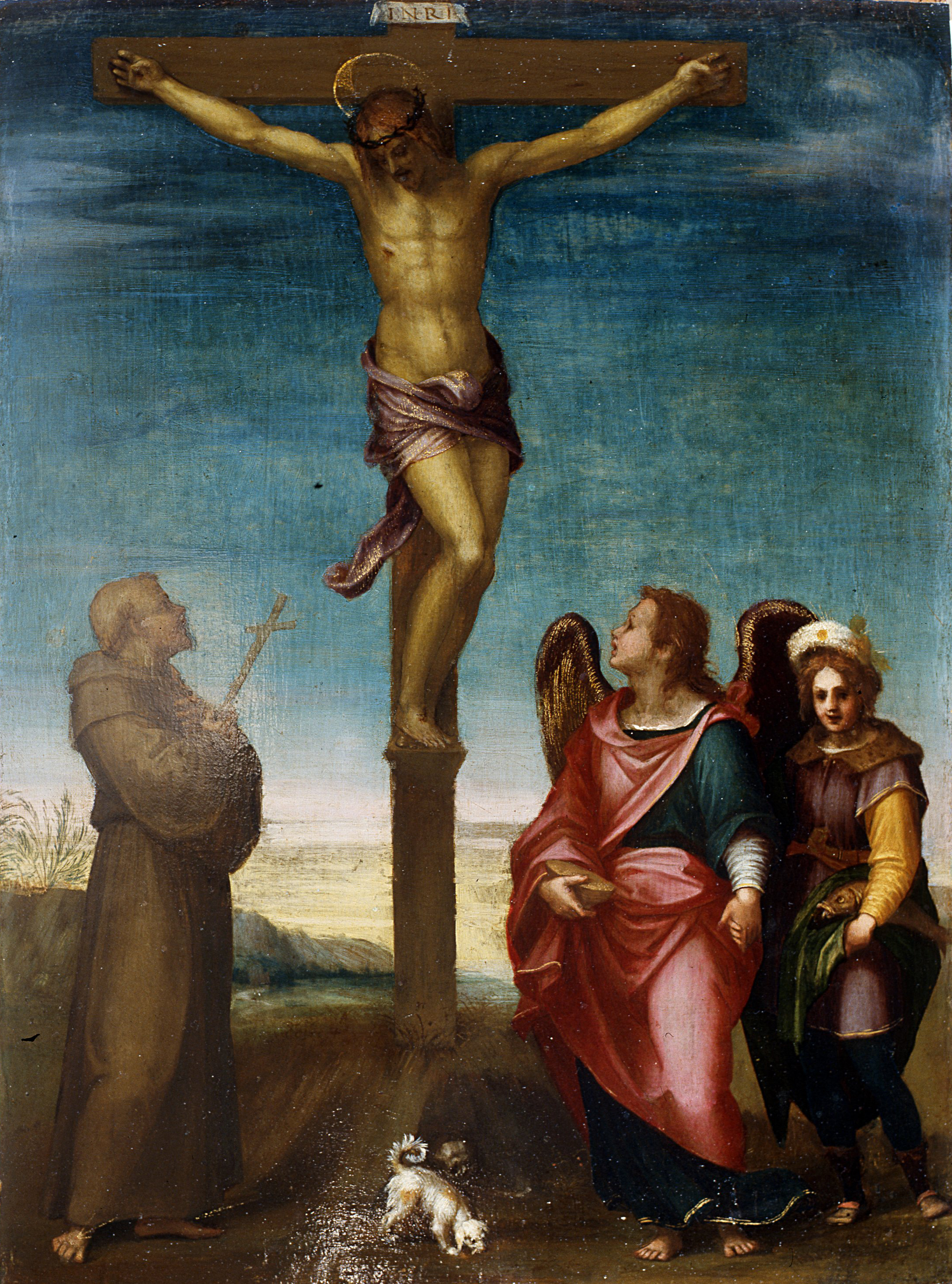 Ai piedi della croce dalla quale pende il corpo morto di Gesù si raccolgono in adorazione San Francesco, a sinistra, che stringe al petto una crocellina, e l’arcangelo Raffaele a destra. Il giovane Tobiolo, invece, guarda verso lo spettatore, come a volerlo introdurre al momento di meditazione e preghiera sul mistero della morte che sta prendendo forma accanto a lui. Il pesce che nasconde sotto il braccio è quello che, secondo il racconto biblico, Tobiolo cattura nel fiume Tigri con l’aiuto dell’angelo, utilizzandone la bile per guarire la cecità del padre. Il cagnolino, che secondo la tradizione, accompagna il ragazzo nel viaggio intrapreso per andare a riscuotere un credito contratto dal genitore, si aggira incurante ai piedi della croce, annusando il terreno. Alle loro spalle il cielo blu intenso, striato di nuvole, digrada dolcemente nei toni rosati di un tramonto lontano che incontra lo spoglio paesaggio del deserto medio orientale. Nel chiaroscuro morbido degli incarnati Andrea tiene a mente la lezione di Leonardo, mentre nel modo di concepire le figure per corrispondenze di movimenti e di colori, si pone in continuità con i maestri di fine Quattrocento con cui si era formato, da Ghirlandaio a Piero di Cosimo, nonché con Franciabigio, suo contemporaneo e sodale. Nella sua conduzione composta, la tavoletta si accosta ai primi affreschi con le storie di san Filippo Benizzi del chiostrino dei Voti alla Santissima Annunziata a Firenze, e per questo viene datata alla fine del primo decennio del secolo.